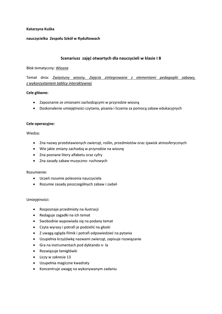 Katarzyna Kuśka nauczycielka Zespołu Szkół w Rydułtowach Scenariusz zajęć otwartych dla nauczycieli w klasie I B Blok tematyczny: Wiosna Temat dnia: Zwiastuny wiosny. Zajęcia zintegrowane z elementami pedagogiki zabawy, z wykorzystaniem tablicy interaktywnej Cele główne: Zapoznanie ze zmianami zachodzącymi w przyrodzie wiosną Doskonalenie umiejętności czytania, pisania i liczenia za pomocą zabaw edukacyjnych Cele operacyjne: Wiedza: Zna nazwy przedstawionych zwierząt, roślin, przedmiotów oraz zjawisk atmosferycznych Wie jakie zmiany zachodzą w przyrodzie na wiosnę Zna poznane litery alfabetu oraz cyfry Zna zasady zabaw muzyczno- ruchowych Rozumienie: Uczeń rozumie polecenia nauczyciela Rozumie zasady poszczególnych zabaw i zadań Umiejętności: Rozpoznaje przedmioty na ilustracji Redaguje zagadki na ich temat Swobodnie wypowiada się na podany temat Czyta wyrazy i potrafi je podzielić na głoski Z uwagą ogląda filmik i potrafi odpowiedzieć na pytania Uzupełnia krzyżówkę nazwami zwierząt, zapisuje rozwiązanie Gra na instrumentach pod dyktando n- la Rozwiązuje łamigłówki Liczy w zakresie 13 Uzupełnia magiczne kwadraty Koncentruje uwagę na wykonywanym zadaniu Postawy: Uczeń dba o przyjazną atmosferę podczas zabawy Szanuje pomysły oraz pracę innych Metody: Słowna Praktyczna Gier i zabaw Formy pracy: Zbiorowa jednolita Grupowa jednolita Indywidualna jednolita Środki dydaktyczne: Tablica interaktywna E-book Magnetofon Nagrania muzyczne do zabaw ruchowych Ilustracje związane z wiosną Piórka i kwiatki Instrumenty Filmik Klocki i szarfy Karty do czytania globalnego Ćwiczenia Przebieg zajęć Powitanie gości. Wprowadzenie do zajęć poprzez zabawę „ Dźwięki wiosny”. Dzieci siedzą na dywanie. Nauczyciel podaje zasady zabawy- uczniowie mają znaleźć w sali ilustracje nie zdradzając innym, co się na nich znajduje. 2 osoby wychodzą za drzwi. Następnie nauczyciel dzieli dzieci na grupy: zwierzęta, rośliny, zjawiska atmosferyczne i przedmioty, przydzielając im różne odgłosy. Zadaniem dzieci, które wracają do klasy jest pogrupowanie uczniów według wydawanych dźwięków. Następnie uczniowie redagują zagadki lub pokazują gestem znaczenie własnych ilustracji ( nauczyciel losuje kolorowe klocki, aby ustalić, kto zadaje zagadkę, a kto odpowiada) Rozmowa na temat zwiastunów wiosny: Dlaczego zebraliśmy takie rysunki? Co je łączy? Jakie zwierzęta się budzą z zimowego snu? Jak nazywają się pierwsze wiosenne kwiaty? Jakie ptaki przylatują do nas na wiosnę? Jak zachowują się ludzie? Jaka jest pogoda? Kiedy przyszła do nas wiosna? Tworzenie słońca pojęć- zawieszanie rysunków na tablicy. Zabawa-”Głoskomania” Dzieci siedzą w kręgu. Jedna osoba stoi w środku czyta wyraz i głoskuje go. Wypowiadając pierwszą głoskę, wskazuje na siebie, a potem na kolejne osoby z kręgu. Ten, na kogo wypadnie ostatnia głoska, wstaje i kontynuuje zabawę, a osoba ze środka siada na jego miejscu. Powitanie wiosny zabawą muzyczną „Witam Cię” Oglądanie filmiku z zasobów Scholaris „Zwiastuny wiosny”- zabawa na tablicy interaktywnej. Ćwiczenia dłoni i palców przed pisaniem. Uzupełnianie krzyżówki, zapis rozwiązania w ćwiczeniach. ( Kalendarzowa wiosna rozpoczyna się 21 marca) Zabawa muzyczno- ruchowa „Deszczyk” Gra w wiosenną pogodę na instrumentach: Słoneczko – grają trójkąty Deszczyk- Grzechotki Burza- bębenki Śnieg- dzwonki z rączką Wiatr- tamburyno Słoneczko za chmurką- patyczki Nauczyciel wskaźnikiem wskazuje rysunki pogody dzieci grają pod dyktando bez muzyki i z muzyką- „Wiosna w błękitnej sukience”. Zabawy wyciszające Masażyki- do wiersza Laury Łącz Spadła deszczu kropla – PLUM Zawiał ciepły wietrzyk – SZUM Coś pachnie w powietrzu – KWIAT Zamienia się wokoło – ŚWIAT Co to tak śpiewa? - PTAK Czyżby przyszła wiosna? -TAK!!! Ćwiczenia oddechowe. Połowa grupy otrzymuje ptasie piórka, a druga połowa grupy staje pod wiszącymi (przymocowanymi do lamp) kwiatuszkami – wprawianie w ruch przedmiotów poprzez dmuchanie. Po chwili zmiana. Ćwiczenia w ławce- ruchy naprzemienne (leniwe ósemki, sowa, ładowanie akumulatora, kapturek myśliciela) Wiosenne łamigłówki matematyczne. Nauczyciel wyświetla na tablicy łamigłówkę. Każdy kwiatek np. bratek to ta sama liczba. Kiedy dziecko poda jaką jest liczbą, odwraca wszystkie kartoniki z tą roślinką i wykonuje kolejne obliczenia. bratek+ bratek = 10 Sasanka + bratek = 9 10 – zawilec =7 Zawilec + pierwiosnek = 13 Sasanka + zawilec +bratek = 12 Zabawa na tablicy interaktywnej- uzupełnianie magicznych kwadratów. Zabawa na kolana Uczestnicy siedzą na krzesłach w kręgu. Prowadzący stoi z boku. Zadaje pytania, na które można odpowiedzieć "tak" lub "nie", np.: "Czy słyszałeś dziś jakiegoś ptaszka"? Kto może odpowiedzieć twierdząco, przesiada się na krzesło, znajdujące się z prawej strony. Jeżeli już ktoś na nim siedzi, zajmuje miejsce na jego kolanach. Osoba ta jest wtedy zablokowana i musi czekać, aż jej kolana będą wolne ( na jednym krześle mogą siedzieć najwyżej 3 osoby). Zabawę kończymy w chwili, gdy komuś uda się wrócić na swoje miejsce. Podsumowanie zajęć – ewaluacja wymień jak najwięcej informacji o tym, co robiliśmy na zajęciach. Pożegnanie.
