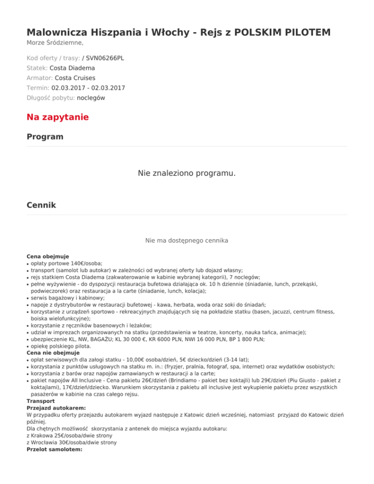 Wylot w dniu rozpoczęcia rejsu, powrót wieczorny w dniu zakończenia rejsu. W cenie zawarte są transfery