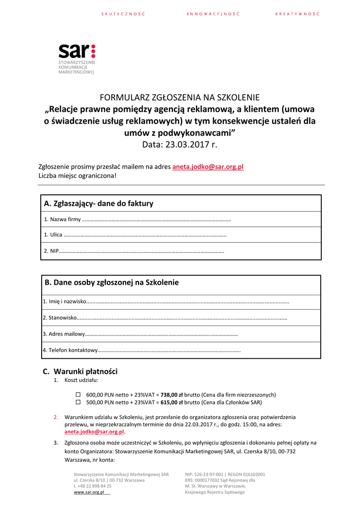 FORMULARZ ZGŁOSZENIA NA SZKOLENIE „Relacje prawne pomiędzy agencją reklamową, a klientem (umowa o świadczenie usług reklamowych) w tym konsekwencje ustaleń dla umów z podwykonawcami” Data: 23.03.2017 r. Zgłoszenie prosimy przesłać mailem na adres [email protected] Liczba miejsc ograniczona! A. Zgłaszający- dane do faktury 1. Nazwa firmy …………………………………………………………………………………………….. 1. Ulica ……………………………………………………………………………………………………... 2. NIP……………………………………………………………………………………………………….. B. Dane osoby zgłoszonej na Szkolenie 1. Imię i nazwisko..................................................................................................................................... 2. Stanowisko.......................................................................................................................................... 3. Adres mailowy……………………………………………………………………………………………….. 4. Telefon kontaktowy…………………………………………………………………………………………. C. Warunki płatności 1. Koszt udziału: 600,00 PLN netto + 23%VAT = 738,00 zł brutto (Cena dla firm niezrzeszonych) 500,00 PLN netto + 23%VAT = 615,00 zł brutto (Cena dla Członków SAR) 2. Warunkiem udziału w Szkoleniu, jest przesłanie do organizatora zgłoszenia oraz potwierdzenia przelewu, w nieprzekraczalnym terminie do dnia 22.03.2017 r., do godz. 15:00, na adres: [email protected]. 3. Zgłoszona osoba może uczestniczyć w Szkoleniu, po wpłynięciu zgłoszenia i dokonaniu pełnej opłaty na konto Organizatora: Stowarzyszenie Komunikacji Marketingowej SAR, ul. Czerska 8/10, 00-732 Warszawa, nr konta: Stowarzyszenie Komunikacji Marketingowej SAR ul. Czerska 8/10 | 00-732 Warszawa t. +48 22 898 84 25 www.sar.org.pl NIP: 526-23-97-001 | REGON 016102001 KRS: 0000177032 Sąd Rejonowy dla M. St. Warszawy w Warszawie, Krajowego Rejestru Sądowego BZ WBK 27 1090 1056 0000 0000 0602 5684. Zgłoszenie oraz dowód wpłaty należy wysłać e-mailem na adres: [email protected]. 4. Osoby i firmy obowiązane są dopełniać we własnym zakresie wszelkiego obiegu dokumentów, potrzebnych do uiszczenia płatności za szkolenie. Organizator nie ponosi odpowiedzialności za niedopełnienie przez pracowników firm procedur zamówień ( purchase order). Jednoznacznym zgłoszeniem udziału w szkoleniu, jest podpisanie formularza zgłoszeniowego. W związku z powyższym, na formularzach zgłoszeniowych wymagany jest podpis osoby odpowiedzialnej za zgłoszenie, oraz osoby odpowiedzialnej za kwestie finansowe firmy. UWAGA! 1. 2. W przypadku, gdy zgłoszenie następuje na mniej niż 3 dni przed szkoleniem, należy opłacić jak najszybciej udział oraz przesłać do organizatora potwierdzenie przelewu na adres: [email protected] REZYGNACJA: W przypadku rezygnacji z udziału w szkoleniu do dnia 21.03.2017r. organizator pobierze 50% opłaty za dotychczasowe usługi przygotowawcze do szkolenia; w przypadku rezygnacji w dniach 22-23.03.2017 r. organizator pobierze od Zgłaszającego pełną opłatę za dotychczasowe usługi przygotowawcze do szkolenia. Uczestnik szkolenia zgadza się niniejszym na umieszczenie swoich danych osobowych w bazie danych Stowarzyszenia Komunikacji Marketingowej SAR, z siedzibą w Warszawie, w celu realizacji zamówienia oraz ich przetwarzanie dla potrzeb informacyjnych i marketingowych związanych z działalnością SAR ( zgodnie z ustawą z dnia 29.08.1997 r. o ochronie danych osobowych Dz. U. Nr 133, POZ. 883). W imieniu Zgłaszającego oświadczam, że nasza firma jest płatnikiem podatku od towarów i usług VAT. W imieniu Zgłaszającego upoważniam: Stowarzyszenie Komunikacji Marketingowej SAR, ul. Czerska 8/10, 00-732 Warszawa, NIP: 526-23-97-001 do wystawienia faktury VAT. W imieniu Zgłaszającego i jako Uczestnik przyjmuję warunki zgłoszenia na Szkolenie i zobowiązujemy się do terminowej zapłaty. Zgadzam się na umieszczenie moich danych osobowych w bazie danych SAR oraz ich wykorzystywanie w celach marketingowych i promocyjnych. Informujemy, że przysługuje Państwu prawo do wglądu i poprawiania zgromadzonych danych zgodnie z ustawą z dnia 29.08.1997 r. o ochronie danych osobowych Dz. U. Nr 133, poz. 883). Jednocześnie zgadzam się na otrzymywanie informacji handlowych od SAR droga elektroniczną. ..................................... Data Pieczęć firmowa Zgłaszającego Stowarzyszenie Komunikacji Marketingowej SAR ul. Czerska 8/10 | 00-732 Warszawa t. +48 22 898 84 25 www.sar.org.pl Podpis osoby upoważnionej NIP: 526-23-97-001 | REGON 016102001 KRS: 0000177032 Sąd Rejonowy dla M. St. Warszawy w Warszawie, Krajowego Rejestru Sądowego
