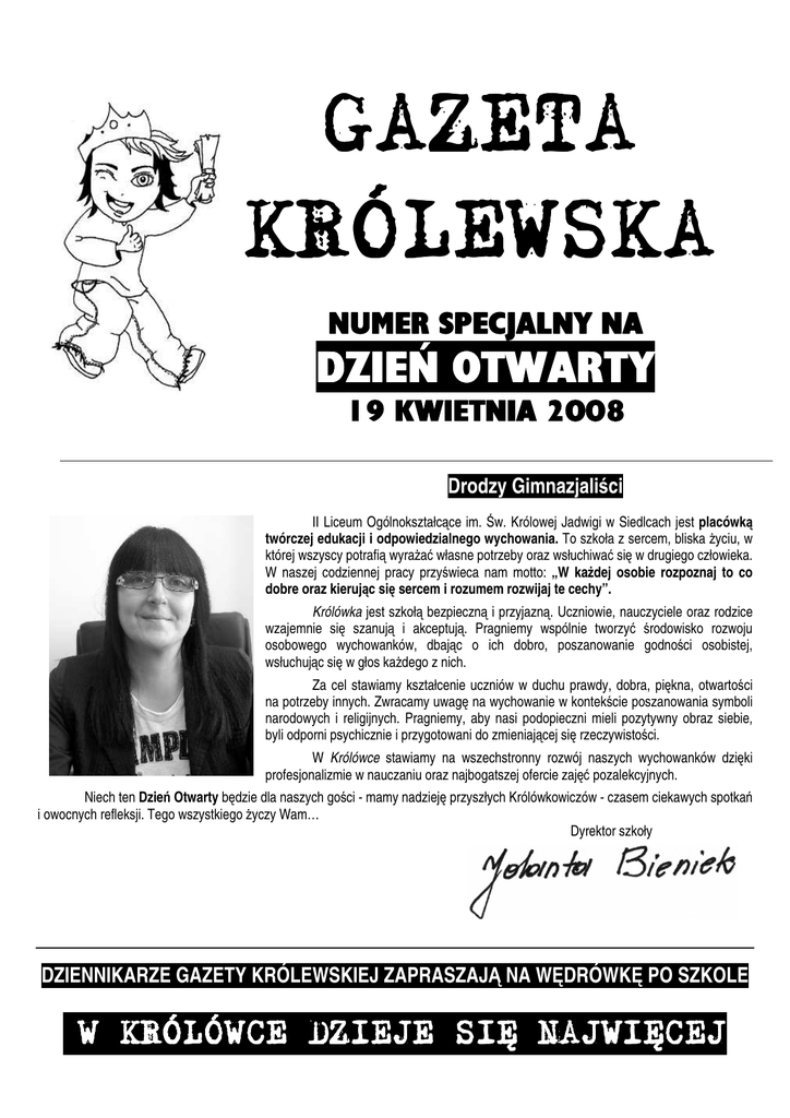 GAZETA KRÓLEWSKA NUMER SPECJALNY NA DZIEŃ OTWARTY 19 KWIETNIA 2008 Drodzy Gimnazjaliści II Liceum Ogólnokształcące im. Św. Królowej Jadwigi w Siedlcach jest placówką twórczej edukacji i odpowiedzialnego wychowania. To szkoła z sercem, bliska Ŝyciu, w której wszyscy potrafią wyraŜać własne potrzeby oraz wsłuchiwać się w drugiego człowieka. W naszej codziennej pracy przyświeca nam motto: „W kaŜdej osobie rozpoznaj to co dobre oraz kierując się sercem i rozumem rozwijaj te cechy”. Królówka jest szkołą bezpieczną i przyjazną. Uczniowie, nauczyciele oraz rodzice wzajemnie się szanują i akceptują. Pragniemy wspólnie tworzyć środowisko rozwoju osobowego wychowanków, dbając o ich dobro, poszanowanie godności osobistej, wsłuchując się w głos kaŜdego z nich. Za cel stawiamy kształcenie uczniów w duchu prawdy, dobra, piękna, otwartości na potrzeby innych. Zwracamy uwagę na wychowanie w kontekście poszanowania symboli narodowych i religijnych. Pragniemy, aby nasi podopieczni mieli pozytywny obraz siebie, byli odporni psychicznie i przygotowani do zmieniającej się rzeczywistości. W Królówce stawiamy na wszechstronny rozwój naszych wychowanków dzięki profesjonalizmie w nauczaniu oraz najbogatszej ofercie zajęć pozalekcyjnych. Niech ten Dzień Otwarty będzie dla naszych gości - mamy nadzieję przyszłych Królówkowiczów - czasem ciekawych spotkań i owocnych refleksji. Tego wszystkiego Ŝyczy Wam… Dyrektor szkoły DZIENNIKARZE GAZETY KRÓLEWSKIEJ ZAPRASZAJĄ NA WĘDRÓWKĘ PO SZKOLE W KRÓLÓWCE DZIEJE SIĘ NAJWIĘCEJ 2 GAZETA KRÓLEWSKA NUMER SPECJALNY: DZIEŃ OTWARTY - 19 KWIETNIA MARTYNA BŁASZKIEWICZ - Dlaczego właśnie Królówka? Rodzina i znajomi zasypują Cię coraz częściej pytaniami z gatunku: gdzie wybierasz się do liceum? Próbujesz usilnie pogłębić lub uzupełnić wiedzę, która moŜe okazać się przydatną podczas egzaminu gimnazjalnego? Zdajesz sobie sprawę, iŜ jesteś o krok od podjęcia powaŜnej decyzji, do wyboru szkoły średniej, która wspaniale by było, gdyby okazała się tą trafioną. Jeśli te doświadczenia dotyczą Cię równieŜ, przeto ten tekst skierowany jest właśnie do Ciebie, Szanowny Rekrutancie ☺ Zapewniam, dokładnie to samo przeŜywałam nie tak dawno, bo rok temu. Do dziś wielu mnie pyta: dlaczego wybrałam właśnie Królówkę? Czy tak jak w znakomitej większości przypadków górę wzięła opinia o szkole, atrakcyjna oferta edukacyjna, lub teŜ rodzinna tradycja? A moŜe to czysty przypadek, którego powodem był łut szczęścia? Mój wybór z pewnością nie dokonał się za sprawą wspomnianego wcześniej przypadku. Choć nie ukrywam, Ŝe II L.O. nie było moim priorytetem. Na początku istotnie klawo nie było. Ukochane koleŜanki poszły do zupełnie innych szkół, wokół nowi nauczyciele, klasa, a przy tym wszystkim znikome znajomości w nowym liceum. Patrząc na to z perspektywy czasu dopiero teraz dostrzegam, jakŜe waŜnego, ale i trafnego dokonałam wyboru. Cały ten okres poznawania środowiska, w którym się znalazłam, jest naprawdę pięknym i niezapomnianym doświadczeniem. Myślę, Ŝe to wspaniały sprawdzian naszej osobowości, tego jak odnajdujemy się w zupełnie nowym otoczeniu. Poznawać ludzi i nieco inną kulturę jest z pewnością warto. Gdybym po raz kolejny miała wybierać, bez precedensu znów byłaby to Królówka! Ten rok naprawdę duŜo mnie nauczył. Pokuszę się o stwierdzenie, Ŝe szkoła ta rozwija nie tylko nasz intelekt, ale i kształtuje świadomość świata. Bardzo podoba mi się pewna myśl: „Nauka jest niczym nieprzebrany ocean, im więcej jej pijesz - tym bardziej jesteś spragniony”. Śmiało mogę stwierdzić, Ŝe Królówka efektywnie uczy, otwiera perspektywy. A co najwaŜniejsze panuje w niej niespotykana w siedleckich szkołach atmosfera. Trzymam kciuki i głęboko wierzę, Ŝe z wieloma z was zobaczę się we wrześniu ☺ POWODZENIA Radiowęzeł - Aleksandra Iwaniuk W naszym liceum działa radiowęzeł. Dzięki niemu cała szkoła szybko dowiaduje się o róŜnych konkursach, wydarzeniach, zmianach i ogólnie o wszystkim, co się dzieje. Ogłoszenia podają nauczyciele jak i uczniowie. Jednak o wiele bardziej interesującym zadaniem radiowęzła jest to, Ŝe na przerwach rozbrzmiewa muzyka. Dzięki temu na korytarzach jest weselej. MoŜemy słuchać róŜnych gatunków w zaleŜności od dyŜurów poszczególnych prezenterów. Co waŜne, kaŜdy moŜe zgłaszać swoje propozycje piosenek na gronie Królówki. Jeśli Wy, przyszli pierwszoklasiści, zechcecie podzielić się swoją pasją muzyczną, takŜe będziecie mogli spróbować pracy w radiowęźle. Paweł Cabaj - Rozśpiewana rodzina królewska Królówka to liceum, w którym oprócz zdobywania wiedzy moŜna rozwijać się takŜe pod kątem kultury i sztuki. W naszej szkole pręŜnie działa chór prowadzony przez pana Jana Jaroszyńskiego. Wszyscy, pragnący i lubiący śpiewać, bez przeszkód mogą zasilić jego szeregi - znajomość nut nieobowiązkowa. Nawet najbardziej amatorskie głosy w ciągu krótkiego okresu czasu uda się rozwinąć. Ponadto „świeŜe” gardła z pewnością będą mile widziane choćby dlatego, Ŝe pozwolą uzupełnić braki po odejściu uczniów klas maturalnych. Repertuar chóru obejmuje przede wszystkim bardzo dynamiczne piosenki religijne, choć nie brakuje utworów nastrojowych. Pozwala to na szerszą działalność zespołu niŜ udział w szkolnych akademiach, m.in. uświetniał on licealne rekolekcje oraz towarzyszył maturzystom podczas ich pielgrzymki na Jasną Górę. Udział w chórze to nie tylko wydobywanie z siebie dźwięków. To przede wszystkim bycie we wspólnocie ludzi, których łączy ta sama pasja. Odpowiedzialność za cały zespół, wspólne wyjazdy na warsztaty muzyczne (w róŜnych ciekawych miejscach), występy, sprawiają, Ŝe zawierają się przyjaźnie, a członkowie chóru są prawie jak rodzi