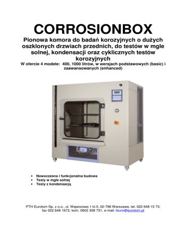 CORROSIONBOX Pionowa komora do badań korozyjnych o dużych oszklonych drzwiach przednich, do testów w mgle solnej, kondensacji oraz cyklicznych testów korozyjnych W ofercie 4 modele: 400, 1000 litrów, w wersjach podstawowych (basic) i zaawansowanych (enhanced) • • • Nowoczesna i funkcjonalna budowa Testy w mgle solnej Testy z kondensacją PTH Eurotom Sp. z o.o., ul. Wąwozowa 1 kl.II, 02-796 Warszawa, tel. 022 648 15 73, fax 022 648 1672, kom. 0602 308 751, e-mail: [email protected] Corrosionbox – daje wyniki bliższe korozji naturalnej Na całym świecie wszystkie materiały używane do produkcji różnych wyrobów wystawione są na działanie naturalnej lub przemysłowej korozji, występującej w postaci mgły solnej, wilgoci, dymów, smogu, czy też spalin samochodowych. Laboratoryjne testy korozyjne są szeroko stosowane w celu doboru materiałów i ich ochrony antykorozyjnej. Komory typu Corrosionbox są właściwym oprzyrządowaniem do badań odporności antykorozyjnej, również dla materiałów takich, jak farby, lakiery i różnego rodzaju powłoki. Normy krajowe i międzynarodowe W celu uzyskiwania wiarygodnych i porównywalnych wyników opracowano szereg metod i testów przyjętych jako międzynarodowe standardy i źródło odniesienia dla testów. Do najpopularniejszych należą: Testy z użyciem modeli podstawowych 50180 method A1/A2/A3 BS 7479 DIN 55991 /** AS 2331 method 3 BS EN 60068-2-11 ECCA T8 /* ASTM B117 /* BS EN ISO 7253 FLTM BI 103-01 ASTM B287 BS 2011 Part 2.1 GM4298P ASTM B368 D17 1058 GM4465P ASTM D1735 DEF 1053 METH 24/36 /* IEC 68-2-11 ASTM D2247 /** EF 1053 METH 36 JIS H 8502 ASTM G43 DIN 40046 Meth1/2/3 ASTM G85 A1/ A3 /*** DIN 50 017-KK /** JIS Z 2371 BS 3900/F12 DIN 50021 /* JNS 30.16.03 BS 3900/F4 DIN 50907 ISO 11503 BS 3900/F9 DIN 50958 ISO 1456 BS 5466 Part 1/2/3 DIN 53167 /* ISO 3231 /** */ testy w mgle solnej **/ testy kondensacyjne Testy z użyciem modeli zaawansowanych ISO 3768 ISO 3769 ISO 3770 ISO 4541 ISO 7253 ISO 9227 /* MIL-STD-202 NFT 30-077 NFX 41-002 RES.30.CT.117 SIS 184 190 VG 95 210 In addition to those of basic models: DRY MIL-STD-810 UNI 9399 /*** UNI 9590 /*** UNICHIM 652 UNICHIM 741 PROHESION ASTM G85 /A5 ***/ cykliczne testy korozyjne (konieczne wyposażenie dodatkowe) Testy w mgle solnej Solanka o własnościach korozyjnych rozpylana jest w postaci mgły solnej przy pomocy odpowiednio skonstruowanej dyszy, ulokowanej w centralnej części komory. Tzw. wieża dystrybucyjna służy do rozprowadzenia mgły w równomierny sposób w obszarze testu. Sprężone powietrze, użyte do wytworzenia mgły solnej, jest podgrzewane i nasycane wilgocią w nawilżaczu pod ciśnieniem, by dalej dotrzeć do dyszy rozpylającej. W zależności od pojemności komory używa się jednego lub więcej elementów grzejnych, których zadaniem jest utrzymywanie jednakowej temperatury w całej komorze. Roztwór gromadzący się na dnie komory odprowadzany jest drenem na zewnątrz. Test mgły solnej może być wykonywany we wszystkich modelach komór. Test z kondensacją wody Dno komory testowej zalewane jest wodą zdemineralizowaną. Woda ta jest podgrzewana i paruje kondensując na powierzchniach próbek. Temperatura w komorze wynosi 40 °C. Ciągły test kondensacji dostępny jest we wszystkich modelach. Cykliczny test korozyjny Wiele cyklicznych testów korozyjnych powstało przez kombinację mgły solnej, wilgoci kondensacyjnej oraz suszenia powietrzem. Ostatnie lata przyniosły zwiększone zapotrzebowanie na ten rodzaj testów. Sucha korozja jest jednym z najpowszechniejszych testów i polega na naprzemiennym aplikowaniu mgły solnej i suszeniu powietrzem. Testy cykliczne mogą być wykonywane przez modele Corrosionbox klasy zaawansowanej (enhanced). W zależności od rodzaju cykli komora może wymagać pewnych dodatkowych opcji sprzętowych montowanych w procesie jej produkowania. Konstrukcja komory Komora zbudowana jest z polipropylenu o grubości ścianki 10mm. Opcjonalnie z tworzywa PPS, by spełnić test odporności ogniowej CSA. Komora jest izolowana podwójną ścianą. Uchylna przezroczysta pokrywa zapewnia dostęp do wnętrza komory. Panel sterujący oraz inne elementy manipulacyjne rozmieszczono w sposób ergonomiczny po stronie prawej. Zbiornik solanki znajduje się po lewej stronie. Panel elektryczny przyrządu jest szczelnie zamknięty w osobnej strefie; obok niego zamontowane są elektrozawory, nawilżacz oraz pompa dozująca solankę. Każda z tych części jest łatwo dostępna w celach serwisowych. Model podstawowy (Basic) Najprostszy w konstrukcji i najłatwiejszy w obsłudze. Po pierwsze należy ustawić licznik czasu na długość testu (do 9999 godzin), następnie temperaturę na sterowniku temperatury i wcisnąć przycisk Salt spray (mgła solna) lub Condensation (kondensacja). Podczas testu licznik odlicza upływający czas i wyświetla pozostały do końca. By dokonać oględzin próbek należy przerwać test tym samym przyciskiem Salt spray lub Condensation i wcisnąć przycisk wentylacyjny, opróżniający jednocześnie dno komory z kondensatu, następnie otworzyć komorę. By kontynuować test zwyczajnie nacisnąć Salt spray lub Condensation. Test dobiegł końca, gdy licznik czasu wskazuje zero. Model zaawansowany (Enhanced) Umożliwia dowolne programowanie komory (do 15 różnych programów), wpisanych za pośrednictwem klawiatury przy użyciu prostego menu. Status komory jest w sposób ciągły wyświetlany na dużym wyświetlaczu LCD (4 linie, 20 znaków każda). Zastosowany tu mikroprocesor steruje i monitoruje pracę komory, temperaturę nawilżacza, ciśnienie dyszy rozpylającej oraz funkcje pompy dozującej RPH. System wyposażony jest w autodiagnostykę, generującą komunikaty ostrzegawcze, alarmowe, a także awaryjne wyłączenie komory. Użytkownik otrzymuje kompletny raport z przebiegu testu: temperatury komory i nawilżacza, ciśnienia powietrza dyszy oraz wydajność pompy dozującej RPH są okresowo 