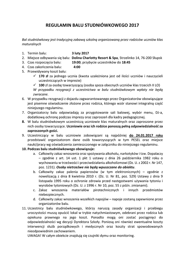REGULAMIN BALU STUDNIÓWKOWEGO 2017 Bal studniówkowy jest tradycyjną zabawą szkolną organizowaną przez rodziców uczniów klas maturalnych 1. 2. 3. 4. 5. Termin balu: 3 luty 2017 Miejsce odbywania się balu: Dolina Charlotty Resort & Spa, Strzelinko 14, 76-200 Słupsk Czas rozpoczęcia balu: 19:00; przybycie uczestników do 18:45 Czas zakończenia balu: 4:00 Przewidywany koszt balu: 170 zł za jednego ucznia (kwota uzależniona jest od ilości uczniów i nauczycieli uczestniczących w imprezie) 100 zł za osobę towarzyszącą (osoba spoza obecnych uczniów klas trzecich II LO) W przypadku rezygnacji z uczestnictwa w balu studniówkowym wpłaty nie będą zwracane. 6. W przypadku rezygnacji z dojazdu zagwarantowanego przez Organizatorów obowiązujące jest pisemne oświadczenie złożone przez rodzica, którego wzór stanowi integralną część niniejszego regulaminu. 7. Organizatorzy balu odpowiadają za przygotowanie sali balowej, wybór menu, DJ-a, dodatkową ochronę podczas imprezy oraz zaproszeń dla kadry pedagogicznej. 8. W balu studniówkowym uczestniczą uczniowie klas maturalnych oraz zaproszone przez nich osoby towarzyszące. Uczniowie oraz ich rodzice ponoszą pełną odpowiedzialność za zaproszonych gości. 9. Uczestniczący w balu uczniowie zobowiązani są najpóźniej do 24.01.2017 roku przedstawić organizatorom dane osób towarzyszących w tym PESEL oraz miejsce nauki/pracy wg oświadczenia zamieszczonego w załączniku do niniejszego regulaminu. 10. Podczas balu studniówkowego obowiązuje: a. Całkowity zakaz wnoszenia oraz spożywania alkoholu, narkotyków i tzw. Dopalaczy – zgodnie z art. 14 ust. 1 pkt 1 ustawy z dnia 26 października 1982 roku o wychowaniu w trzeźwości i przeciwdziałaniu alkoholizmowi (Dz. U. z 2002 r. Nr 147, poz. 1231). Osoby nietrzeźwe nie będą wpuszczane do obiektu. b. Całkowity zakaz palenia papierosów (w tym elektronicznych) – zgodnie z nowelizacją z dnia 8 kwietnia 2010 r. (Dz. U. Nr 81, poz. 529) Ustawy z dnia 9 listopada 1995 roku o ochronie zdrowia przed następstwami używania tytoniu i wyrobów tytoniowych (Dz. U. z 1996 r. Nr 10, poz. 55 z późn. zmianami). c. Zakaz wnoszenia materiałów pirotechnicznych i innych przedmiotów niebezpiecznych. d. Całkowity zakaz wnoszenia wszelkich napojów – napoje zostaną zapewnione przez organizatorów balu. 11. Uczestnicy balu studniówkowego, którzy naruszą zasady organizacji i przebiegu uroczystości muszą opuścić lokal w trybie natychmiastowym, odebrani przez rodzica lub opiekuna prawnego na jego koszt. Ponadto mogą oni zostać pociągnięci do odpowiedzialności wg decyzji Dyrektora Szkoły. Poniosą oni również ewentualne koszty interwencji służb porządkowych i medycznych oraz koszty strat spowodowanych nieodpowiednim zachowaniem. UWAGA! W całym obiekcie znajdują się czujniki dymu oraz monitoring. 12. Uczestnicy balu studniówkowego w trakcie trwania uroczystości mogą poruszać się po holu hotelu i korzystać z toalet przy recepcji. Nieakceptowalne jest wchodzenie na wyższe piętra hotelowe oraz korzystanie z pokoi hotelowych (zachowanie takie traktowane będzie jako zakończeniu udziału w balu i skutkować będzie wezwaniem rodziców do odbioru ucznia lub osoby towarzyszącej). 13. W trakcie trwania balu obowiązuje zakaz opuszczania budynku (wyjście z budynku traktowane będzie jako zakończeniu udziału w balu i skutkować będzie wezwaniem rodziców do odbioru ucznia lub osoby towarzyszącej). 14. Uczestnicy balu zobowiązują się do wykonywania poleceń organizatorów, obsługi lokalu, grona pedagogicznego jak też dodatkowej ochrony zorganizowanej do obsługi uroczystości. W uzasadnionych przypadkach uczestnicy (uczniowie i osoby towarzyszące) zobowiązani są do poddania kontroli wnoszonych toreb w nawiązaniu do punktu 10 niniejszego regulaminu. 15. Rodzic/opiekun prawny ponosi pełną odpowiedzialność za udowodnione zniszczenia dokonane podczas balu przez córkę/syna i zostanie obciążony kosztami ewentualnych napraw (na podstawie protokołu sporządzonego w obecności obu stron – przedstawiciela organizatora i służb hotelowych. W przypadku wystąpienia szczególnego rodzaju zabrudzeń Hotel zastrzega sobie prawo do naliczenia dodatkowej opłaty za sprzątanie w/g indywidualnej wyceny. Za zamówione zamówienia w restauracji, hotelu itd. koszt ponosi uczestnik, rodzic bądź opiekun prawny. 16. Ubiorem obowiązującym na balu studniówkowym jest strój wizytowy (dotyczy to także osób towarzyszących). 17. W trakcie balu obowiązują ogólnie przyjęte normy zachowania w miejscach publicznych. 18. Rodzice uczniów mogą uczestniczyć w części oficjalnej balu zajmując miejsca w wyznaczonej do tego celu części hotelu. 19. Po zakończeniu uroczystości rodzice odbierają młodzież osobiście lub zgodnie z dyspozycją punktu 4 oświadczenia podpisanego przez rodziców/prawnych opiekunów stanowiącego załącznik do niniejszego regulaminu. 20. Organizatorzy balu nie odpowiadają za rzeczy pozostawione czy zaginione wszystkich uczestników. 21. Oświadczenie rodziców/opiekunów prawnych uczniów II LO im. Adama Mickiewicza w Słupsku biorących udział w balu studniówkowym 2017, podpisany przez rodziców/prawnych opiekunów jako załącznik do regulaminu balu potwierdza i akceptuje niniejszy regulamin. 22. W sprawach nie ujętych w regulaminie obowiązują przepisy prawa RP i Statut Szkoły. Komitet organizacyjny Balu Studniówkowego 2017 Akceptuję regulamin Dyrektor Szkoły