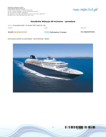 RejsClub.pl Zbigniew Kąkol Portal Rejsów Wycieczkowych 83-000 Pruszcz Gdański, ul. Podkomorzego 58/1 tel./fax: +48 58 7138200/01, email: [email protected] NIP: 6511430265, REGON: 220868580 BZ WBK EUR PL 58 1090 1098 0000 0001 2047 2434, SWIFT: WBKPPLPP BZ WBK PLN 82 1090 1098 0000 0001 2047 2390 Karaibskie Wakacje All Inclusive - sprzedane Termin: 29 grudzień 2016 - 07 styczeń 2017 (ilość dni: 10) Statek: Zenith Linia: Cena od: Pullmantur Cruises na zapytanie/os. Cena zawiera przelot na trasie Madryt - Santo Domingo - Madryt. 1/3 EV:43570 RejsClub.pl Zbigniew Kąkol Portal Rejsów Wycieczkowych 83-000 Pruszcz Gdański, ul. Podkomorzego 58/1 tel./fax: +48 58 7138200/01, email: [email protected] NIP: 6511430265, REGON: 220868580 BZ WBK EUR PL 58 1090 1098 0000 0001 2047 2434, SWIFT: WBKPPLPP BZ WBK PLN 82 1090 1098 0000 0001 2047 2390 TRASA REJSU dzień 1 Data Port Wpłynięcie Wypłynięcie czwartek 29.12.2016 Madryt --:-- --:-- Legenda Hiszpania Przelot do Madrytu (proponowane połączenie w cenniku). Po przylocie przejazd do hotelu, czas wolny i nocleg. dzień 2 piątek 30.12.2016 --:-- Santo Domingo 22:00 Republika Dominikańska Śniadanie w hotelu. Przejazd na lotnisko i wylot na Dominikanę. Po przylocie przejazd do portu, spotkanie z rezydentem i zaokrętowanie na statek. dzień 3 sobota 31.12.2016 La Romana 07:30 14:00 Republika Dominikańska Indywidualne zwiedzanie wyspy lub udział w wycieczce fakultatywnej. Dominikana zajmuje 2/3 wyspy Haiti. Dysponuje wszelkimi atutami turystycznymi, od wspaniałej architektury kolonialnej, przez porośnięte bujną roślinnością górzyste wnętrze, po jedne z najlepszych plaż na Karaibach. dzień 4 niedziela 01.01.2017 Philipsburg 13:30 19:30 Sint Maarten Indywidualne zwiedzanie miasta i wyspy lub udział w wycieczce fakultatywnej. Wyspa nazywana jest często skrzyżowaniem Karaibów. Sint Maarten jest podzielona: południowa część należy do Holandii, północna zaś do Francji. Philipsburg to stolica holenderskiej części i jeden z najważniejszych portów statków wycieczkowych w całym regionie Karaibów. dzień 5 poniedziałek 02.01.2017 Saint John's, Antigua 08:00 17:00 Antigua i Barbuda Czas na plażowanie lub udział w wycieczce fakultatywnej. Antigua i Barbuda to wyspiarskie państwo w archipelagu Małych Antyli. Antigua jest wyspą powulkaniczną i górzystą z licznymi, ładnymi plażami. dzień 6 wtorek 03.01.2017 Castries 09:00 18:00 Saint Lucia Czas wolny na indywidualne zwiedzanie lub udział w wycieczce fakultatywnej. St. Lucia to wyspa górzysta, pokryta wilgotnym lasem równikowym. Z malowniczymi szczytami wyłaniającymi się prosto z morza, złotymi plażami, rzadkimi papugami i obfitością wspaniałych tropikalnych kwiatów jest jedną z najpiękniejszych pereł Karaibów. dzień 7 środa 04.01.2017 Bridgetown 06:00 14:00 Barbados Indywidualny wypoczynek lub zwiedzanie wyspy albo udział w wycieczce fakultatywnej. Malownicza wyspa wchodząca w skład Małych Antyli. Stolica wyspy – Bridgetown – niegdyś nazywane Miastem Świętego Michała, została wpisana na listę światowego dziedzictwa UNESCO w 2011 roku. Piaszczyste plaże, turkusowa woda i zielone palmy kuszą niezwykłą urodą. Wyspa dzięki swojemu tropikalnemu klimatowi jest rajem dla miłośników sportów wodnych i plażowiczów, a także ulubionym miejscem wypoczynku wielu znanych osób. dzień 8 czwartek 05.01.2017 dzień 9 piątek 06.01.2017 Dzień na morzu --:-- --:-- Santo Domingo 10:00 --:-- Republika Dominikańska Pożegnanie z rezydentem i wyokrętowanie. Przejazd na lotnisko i wylot do Madrytu. Stolica Dominikany to wspaniały pomnik epoki kolonialnej. To nowoczesne i kosmopolityczne miasto, które było niegdyś kolebką cywilizacji w Ameryce. 500-letnie budynki kolonialne łączą się z nowoczesną architekturą, dając miastu naprawdę wyjątkowy klimat. dzień 10 sobota 07.01.2017 Warszawa --:-- --:-- Polska Przylot do Madrytu, przesiadka na samolot do kraju. Przylot do Polski. 2/3 EV:43570 RejsClub.pl Zbigniew Kąkol Portal Rejsów Wycieczkowych 83-000 Pruszcz Gdański, ul. Podkomorzego 58/1 tel./fax: +48 58 7138200/01, email: [email protected] NIP: 6511430265, REGON: 220868580 BZ WBK EUR PL 58 1090 1098 0000 0001 2047 2434, SWIFT: WBKPPLPP BZ WBK PLN 82 1090 1098 0000 0001 2047 2390 CENNIK Cena katalogowa Kabina wewnętrzna 7 745.00zł Kabina zewnętrzna z oknem 8 445.00zł Kabina zewnętrzna z balkonem 9 345.00zł Kabina jednoosobowa na zapytanie 3 i 4 osoba dorosła w kabinie na zapytanie dziecko od 2 do 17 lat jako 3 i 4 osoba w kabinie na zapytanie dziecko od 0 do 2 lat jako 3 i 4 osoba w kabinie na zapytanie Opłaty portowe Bilet lotniczy (w PLN) Cena promocyjna w cenie na zapytanie Uwaga! Ceny za osobę w kabinie dwuosobowej. Cena zawiera: 8 dniowy rejs statkiem Zenith - zakwaterowanie w 2 os. kabinie wybranej kategorii; pełne wyżywienie w trakcie rejsu: 3 główne posiłki, przekąski między posiłkami, bufet lub przekąski o północy; opcję all inclusive - napoje gazowane i niegazowane, drinki, piwo, wino itp. serwowane w barach i restauracjach; serwis bagażowy podczas wejścia i zejścia ze statku oraz serwis kabinowy; korzystanie ze wszystkich urządzeń sportowo - rekreacyjnych znajdujących się na pokładzie statku (basen, jacuzzi, sala fitness, itp.); udział we wszystkich imprezach organizowanych na statku (przedstawienia w teatrze, koncerty, programy animacyjne itp.); 1 noclegi ze śniadaniem w hotelu 3* w Madrycie przed wylotem; wszystkie transfery zgodnie z programem; opłaty portowe i ubezpieczenie: KL, NNW i bagażu; przelot na trasie Madryt-Dominikana-Madryt; opieka polskiego pilota w trakcie całej imprezy. Cena nie zawiera: biletu lotniczego do Madrytu; wycieczek fakultatywnych w trakcie rejsu; korzystania z punktów usługowych (fryzjer, pralnia, fotograf, salon piękności i odnowy biologicznej, internet); ubezpieczenia od kosztów rezygnacji i chorób przewlekłych; napiwków dla obsługi na st