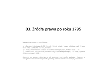 03. Źródła prawa po roku 1795 konspekt opracowany na podstawie: 1/ J. Bardach, Z. Leśnodorski, M. Pietrzak, Historia ustroju i prawa polskiego, wyd. V, Lexis Nexis 2003, s. 343-345, 472-473, 552-556. 2/ S. Płaza, Historia prawa w Polsce na tle porównawczym, cz. II, Kraków 1998, 17-38. 3/ A. Korobowicz, W. Witkowski, Historia ustroju i państwa polskiego (1772-1918), wydanie 4, Wolters Kluwer, 2009, s Konspekt jest pomocą dydaktyczną, nie zastępuje podręcznika, wykładu i ćwiczeń, w szczególności nie zawiera wszystkich informacji zamieszczonych w zalecanym podręczniku. Prawo sądowe – wiek wielkich kodyfikacji •potrzeba zmian prawa, potrzeba kodyfikacji, wprowadzenia równości wobec prawa, oświeceniowe idee zbudowane na zasadzie racjonalności •wpływ zmian gospodarczych; oświeceniowa idea prawa natury o charakterze areligijnym, racjonalnego na wzór procesów fizycznych i biologicznych •prawo natury bezwzględne – nienaruszalne: „nienaruszalność własności, dotrzymywanie umów, wynagrodzenie szkody, karalność czynów niedozwolonych” •prawo natury względne – uwzględnia prawo miejscowe, jeśli jest zgodne z prawem bezwzględnym •prawo stanowione miało być zgodne z powyższymi •XIX w. dominacja idei szkoły historycznej (historyczny rozwój prawa) •zmiany w edukacji prawniczej Idea kodyfikacji w epoce Oświecenia 1/ tworzenie prawa od nowa (łagodniej – zwolennicy względnego prawa natury) 2/ prawo w służbie dobru i szczęściu ogólnemu (niebezpieczeństwo drobiazgowych regulacji) 3/ niewzruszalna sprawiedliwość, wolność i równość 4/ ujednolicanie prawa 5/ prawo zupełne, kompletne, bez luk 6/ zwięzłość prawa, rezygnacja z kazuistyki 7/ przepisy ścisłe i precyzyjne 8/ rozgraniczenie prawa publicznego i prywatnego 9/ prawo prywatne: cywilne, handlowe, pracy; osobne kodeksy karne i cywilne materialne i procesowe Doktryna prawa cywilnego - pozytywizm ustawowy (szkoła egzegezy): Francja w XIX w. - pozytywizm naukowy (Niemcy): w oparciu o naukę, ponieważ do 1896 brak było jednolitego kodeksu - doktryna szkoły historycznej F.K. von Savigny - nurt socjalny pod wpływem rozwoju gospodarki kapitalistycznej i trudną sytuacją robotników (antyindywidualistyczny i antyliberany); prawo pracy, regulacje administracyjne; duża rola orzecznictwa, w sprzeczności z abstrakcyjnymi koncepcjami pozytywistów - koniec XIX w. naturalizm prawniczy w miejsce pozytywizmu: •a/ jurysprudencja interesów (Rudolf Ihering) metoda teleologiczna w wykładni, dalej zmodyfikowane przez pojęcie interesu w przypadku luki prawnej (domniemanie woli ustawodawcy) •b/ szkoła wolnego prawa w razie luki precedensy sędziego Doktryna prawa karnego (1) a/ kierunek humanitarny (Oświecenie) •postulaty kodyfikacji, prawo powszechne i jednolite, równość wobec prawa; •nullum crimen sine lege poenali anteriori (formalna definicja przestępstwa), pełna subiektywizacja odpowiedzialności (zerwanie z odpowiedzialnością obiektywną za skutek) oraz indywidualizacja (zerwanie z odpowiedzialnością zbiorową); •racjonalizacja utylitarna (prewencja indywidualna i generalna) a nie metafizyczna czy na zasadzie odwetu; •zniesienie kar mutylacyjnych i kary śmierci (Józefina, Franciszkana, Landrecht) b/ szkoła klasyczna kwestie normatywne; analiza obowiązującego prawa, brak zainteresowania materialnymi źródłami prawa; ścisła systematyka i terminologia w kodeksach; przestępstwo to zjawisko prawne a nie społeczne; odpowiedzialność karna oparta na teorii autonomii woli podstawą wina sprawcy; racjonalizacja odwetowa kary •Immanuel Kant – teoria odwetu etycznego •Georg Wilhelm Friedrich Hegel – teoria odwetu dialektycznego •Anzelm Feuerbach – teoria przymusu psychologicznego •Edmund Krzymuski (okres międzywojenny) Doktryna prawa karnego (2) c/ doktryny pozytywistyczne prawa karnego! •zerwanie z Kantem i Heglem •tryumf nauk szczegółowych •wzrastająca przestępczość szkoła antropologiczna – 70’ XIX Włochy (Cezare Lombroso); psychiatria, przestępstwo to zjawisko przyrodnicze, przestępca z urodzenia, dziedziczenie popędu do zbrodni, cechy fizyczne; pojęcie winy zastąpione „niebezpieczeństwem społecznym”; konieczność prewencji – szybko obalona koncepcja szkoła socjologiczna – od 70’ XIX w.; F. von Liszt; Julian Makarewicz i Wacław Makowski; przestępstwo to zjawisko społeczne; odrzucenie indeterminizmu, determinizm społeczny; nie czyn a osoba podlega karaniu; kara to nie jest sprawiedliwa odpłata ale dostosowanie do osoby przestępcy; środki zabezpieczające oparte na osobowości sprawcy; kodeks niemiecki 1871, polski 1932 d/ kierunek normatywny kon. XIX w.-I poł. XX w.; Karol Ludwik Binding i Ernest Beling; przeciwko nurtom antropologicznym i socjologicznym; przestępstwo – naruszenie posłuchu wobec państwa; ustawodawstwo jako samodzielny byt normatywny, nieważne są kwestie pozaprawne – powrót do szkoły klasycznej; teoria czynu – zgodnie z formalnymi przesłankami Prawodawstwo w zaborze pruskim (1) Okres monarchii absolutnej (do poł. XIX w.) [Witkowski, Korobowicz, s. 22-23] Absolutne prawodawstwo króla pruskiego: •ustawy •edykty •rozporządzenia (deklaracje, instrukcje, regulaminy) •na terenie ziem zajęty patenty Królewskie zarządzenia wykonawcze: •obwieszczenia •proklamacje •zawiadomienia Akty prawne w odpowiedzi na zapytania niższych urzędów i w sytuacjach szczególnych: •reskrypty •rozkazy gabinetowe •Cyrkularze Prawodawstwo w zaborze pruskim (2) Dążenie do unifikacji prawa partykularnego •1772 w Prusach Zachodnich uchylenie prawa polskiego, wprowadzenie Landrechtu wschodniopruskiego z 1721 r. •29 III 1794 w Prusach Południowych wprowadzenie Powszechnego Prawa Krajowego dla Państw Pruskich (PPK, Landrecht Pruski z 1794 r.) jako prawa subsydiarnego wobec prawa polskiego •1797 Landrecht prawem zasadniczym w Prusach Południowych (wobec niesko