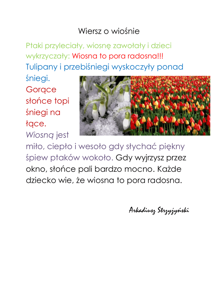 Wiersz o wiośnie Ptaki przyleciały, wiosnę zawołały i dzieci wykrzyczały: Wiosna to pora radosna!!! Tulipany i przebiśniegi wyskoczyły ponad śniegi. Gorące słońce topi śniegi na łące. Wiosną jest miło, ciepło i wesoło gdy słychać piękny śpiew ptaków wokoło. Gdy wyjrzysz przez okno, słońce pali bardzo mocno. Każde dziecko wie, że wiosna to pora radosna. Arkadiusz Strzyżyński