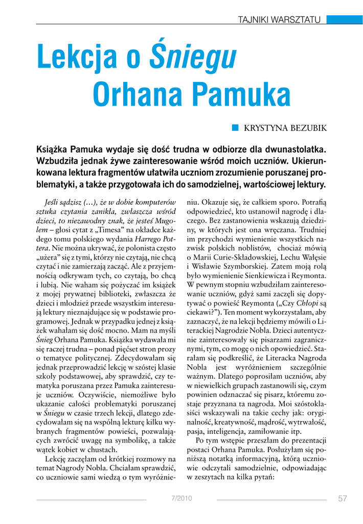 TAJNIKI WARSZTATU Lekcja o Śniegu Orhana Pamuka Krystyna Bezubik Książka Pamuka wydaje się dość trudna w odbiorze dla dwunastolatka. Wzbudziła jednak żywe zainteresowanie wśród moich uczniów. Ukierunkowana lektura fragmentów ułatwiła uczniom zrozumienie poruszanej problematyki, a także przygotowała ich do samodzielnej, wartościowej lektury. Jeśli sądzisz (…), że w dobie komputerów sztuka czytania zanikła, zwłaszcza wśród dzieci, to niezawodny znak, że jesteś Mugolem – głosi cytat z „Timesa” na okładce każdego tomu polskiego wydania Harrego Pottera. Nie można ukrywać, że polonista często „użera” się z tymi, którzy nie czytają, nie chcą czytać i nie zamierzają zacząć. Ale z przyjemnością odkrywam tych, co czytają, bo chcą i lubią. Nie waham się pożyczać im książek z mojej prywatnej biblioteki, zwłaszcza że dzieci i młodzież przede wszystkim interesują lektury nieznajdujące się w podstawie programowej. Jednak w przypadku jednej z książek wahałam się dość mocno. Mam na myśli Śnieg Orhana Pamuka. Książka wydawała mi się raczej trudna – ponad pięćset stron prozy o tematyce politycznej. Zdecydowałam się jednak przeprowadzić lekcję w szóstej klasie szkoły podstawowej, aby sprawdzić, czy tematyka poruszana przez Pamuka zainteresuje uczniów. Oczywiście, niemożliwe było ukazanie całości problematyki poruszanej w Śniegu w czasie trzech lekcji, dlatego zdecydowałam się na wspólną lekturę kilku wybranych fragmentów powieści, pozwalających zwrócić uwagę na symbolikę, a także wątek kobiet w chustach. Lekcję zaczęłam od krótkiej rozmowy na temat Nagrody Nobla. Chciałam sprawdzić, co uczniowie sami wiedzą o tym wyróżnie- niu. Okazuje się, że całkiem sporo. Potrafią odpowiedzieć, kto ustanowił nagrodę i dlaczego. Bez zastanowienia wskazują dziedziny, w których jest ona wręczana. Trudniej im przychodzi wymienienie wszystkich nazwisk polskich noblistów, chociaż mówią o Marii Curie-Składowskiej, Lechu Wałęsie i Wisławie Szymborskiej. Zatem moją rolą było wymienienie Sienkiewicza i Reymonta. W pewnym stopniu wzbudziłam zainteresowanie uczniów, gdyż sami zaczęli się dopytywać o powieść Reymonta („Czy Chłopi są ciekawi?”). Ten moment wykorzystałam, aby zaznaczyć, że na lekcji będziemy mówili o Literackiej Nagrodzie Nobla. Dzieci autentycznie zainteresowały się pisarzami zagranicznymi, tym, co mogę o nich opowiedzieć. Starałam się podkreślić, że Literacka Nagroda Nobla jest wyróżnieniem szczególnie ważnym. Dlatego poprosiłam uczniów, aby w niewielkich grupach zastanowili się, czym powinien odznaczać się pisarz, któremu zostaje przyznana ta nagroda. Moi szóstoklasiści wskazywali na takie cechy jak: oryginalność, kreatywność, mądrość, wytrwałość, pasja, inteligencja, zamiłowanie itp. Po tym wstępie przeszłam do prezentacji postaci Orhana Pamuka. Posłużyłam się poniższą notatką informacyjną, którą uczniowie odczytali samodzielnie, odpowiadając w zeszytach na kilka pytań: 7/2010 57 TAJNIKI WARSZTATU Literacką Nagrodę Nobla (2006) otrzymał Orhan Pamuk1. Nagrodzono pisarza, który w poszukiwaniu melancholijnej duszy swojego rodzinnego miasta odkrył nowe symbole zderzenia i przenikania się kultur – Szwedzka Akademia Królewska napisała w uzasadnieniu werdyktu. Orhan Pamuk urodził się w 1952 roku w Stambule. Jest jednym z najwybitniejszych pisarzy europejskich i laureatem wielu nagród literackich, m.in. Międzynarodowej Dublińskiej Nagrody Literackiej IMPAC. Książki Pamuka wydano dotąd w 40 krajach i przetłumaczono na ponad 30 języków na całym świecie. Przed tygodniem także w Polsce ukazała się pierwsza, przetłumaczona na polski, książka Orhana Pamuka: Śnieg. Jak twierdzi sam pisarz: jest to pierwsza i ostatnia powieść polityczna, jaką napisał. Jak mówi Anna Polat, tłumaczka i turkolożka, Śnieg to powieść wielowątkowa. Impulsem do napisania Śniegu stało się pogorszenie stosunków między muzułmańskim Wschodem a Zachodem. Powieść jest próbą dotarcia do korzeni współczesnego terroryzmu. Od dawna zresztą Pamuk uważany jest za drogmana – przewodnika i tłumacza po niezrozumiałym dla przedstawicieli zachodniej cywilizacji Wschodzie. Orhan Pamuk urodził się w zamożnej, tureckiej rodzinie; jest stambulczykiem z dziada pradziada i to bardzo silnie wpłynęło na jego światopogląd i postawę literacką. W każdej jego książce przewijają się wątki autobiograficzne. Szczególnie w Turcji jest osobą bardzo kontrowersyjną; jego wypowiedzi nie mieszczą się w kanonie takich, których oczekuje się od osób publicznych w tym kraju. – Bez ogródek mówi o sprawach, które są nie tylko niewygodne dla Turków, ale także uznane za przestępstwo, na przykład w wywiadzie dla jednego ze szwajcarskich tygodników stwierdził, że w Turcji zamordowano ponad milion Ormian – przypomina Anna Polat. Wcześniej Pamuk udzielił wywiadu prasie niemieckiej. Stwierdził w nim, że na turecką demokrację bardzo źle wpływa armia tego kraju. Obydwa te wywiady spotkały się z żywą reakcją Turków. Ludzie palili książki Pamuka na ulicach, szczególnie upodobali sobie powieść Śnieg. Anna Polat zwraca uwagę, że Pamuk nie szczędzi słów krytyki własnemu narodowi także w wywiadach udzielanych w Turcji. Pytania do tekstu: • Z jakiego kraju pochodzi Orhan Pamuk? • O jakiej powieści mówi się w artykule? • Jaka tematyka powraca w książkach i wypowiedziach pisarza? • Jak odbierane są wypowiedzi Pamuka w jego rodzinnym kraju? Odnalezienie poprawnych odpowiedzi nie stanowiło problemu, a stosunkowo łatwe zadanie stało się pretekstem do powiązania znanych uczniom z telewizji faktów z krajem Pamuka. Szóstoklasiści wskazali, że polityka krajów islamu łączy się z takimi pojęciami jak religia, terroryzm, sytuacja kobiet. Kolejnym zadaniem była prób