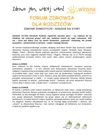 FORUM ZDROWIA DLA RODZICÓW ZDROWE INWESTYCJE – RODZICE NA START Zaledwie 10–20% dorosłych Polaków regularnie uprawia sport – czy należysz do tej chlubnej, tak nielicznej grupy? Jeśli tak, mobilizuj innych do zajęć ruchowych. Jeśli nie – teraz jest dobry czas, by swoim działaniem „poprawić” statystykę, ale przede wszystkim… zainwestować w zdrowie – swoje i swojego dziecka. W ramach międzynarodowego projektu Bridging East-West Health Gap naukowcy badali aktywność fizyczną mieszkańców sześciu europejskich krajów: Finlandii, Rosji, Hiszpanii, Węgier, Polski i Niemiec. Wyniki pokazały ogromne zróżnicowanie dotyczące aktywności fizycznej, przy czym najgorzej wypadli Polacy i Węgrzy. Okazuje się, że aż 79,2% naszego społeczeństwa prowadzi bierny tryb życia! Jakie zatem wzorce przekazujemy swoim dzieciom? Rodzic na GÓRZE Dom rodzinny to dla dziecka miejsce zdobywania doświadczeń, czerpania wzorców zachowania, nawyków – w tym również tych dotyczących aktywności fizycznej. Dzieci najlepiej i najskuteczniej przyswajają sobie nawyki poprzez naśladownictwo. Stara maksyma, że przykład idzie z góry, może więc tym razem stać się doskonałym, budującym punktem wyjścia do korzystnych zmian w życiu. Rodzice, chcąc dać dobry przykład dziecku, powinni na początek zainwestować w siebie – w rozwój swojej aktywności fizycznej. Wtedy łatwiej będzie zaszczepić w dziecku „sportowego ducha” i pokazać, jak przez aktywność fizyczną można dbać o własne ciało, a dzięki temu – o zdrowie i samopoczucie. Rodzic na STARCIE W jednej z polskich szkół rodzice stwierdzili, że faktycznie mało czasu i uwagi poświęcają aktywności fizycznej. Bardzo żywiołowo zareagowali na przytoczone powyżej wyniki badań. Stwierdzili, że aby wymagać od dzieci, muszą najpierw zacząć wymagać od siebie i stworzyli tzw. grupę aktywnych. Działalność tej grupy opiera się na dobrowolnych cyklicznych spotkaniach, w trakcie których rodzice wspólnie uprawiają wybrany sport, np. nordic walking czy bieganie. Rodzice zdecydowali też, że na treningi będą przychodzić z dziećmi, aby „zarazić” je aktywnością fizyczną i tym samym odciągnąć od telewizora czy komputera, a także by wspólnie spędzić czas. Rodzic na MEDAL Jako ludzie dorośli mamy świadomość, że tzw. aktywny wypoczynek odgrywa w naszym życiu ogromną rolę i jest dla naszego organizmu o wiele bardziej korzystny niż wypoczynek bierny. I nie trzeba zaraz uprawiać sportów ekstremalnych – każdy z nas jest w stanie znaleźć taką dyscyplinę sportu, którą będzie lubił i uprawianiem której może postarać się „zarazić” swoje dziecko. Taki Rodzic jest na medal! Wytworzenie u dziecka prawidłowych nawyków już od najmłodszych lat sprawi, że będzie ono traktowało codzienną dawkę ruchu jako coś zupełnie naturalnego i potrzebnego. A to na pewno zaprocentuje w przyszłości – jest to zatem zdrowa inwestycja! Jeśli nie masz pomysłu od czego zacząć, potrzebujesz motywacji, wejdź na stronę: www.aktywniepozdrowie.pl/po-co-byc-aktywnym. Polecamy zwłaszcza artykuł o przewrotnym tytule: „Każdy może być olimpijczykiem”.