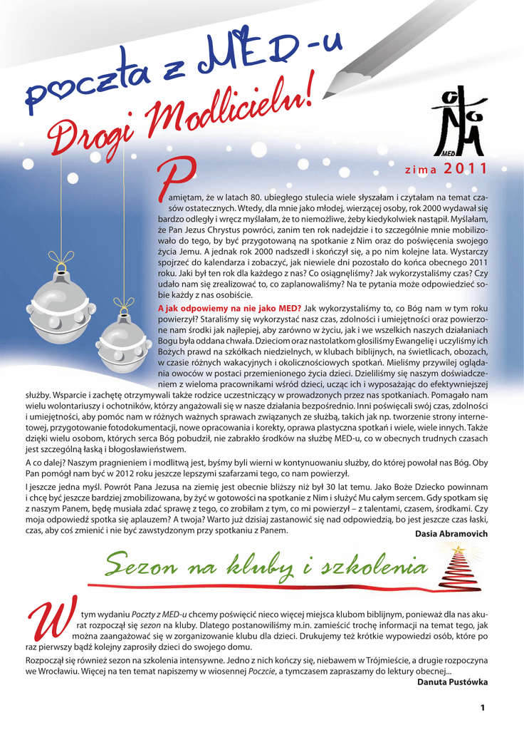 p z a t ocz i g o r D u D ME ! u l e i c i l d o M P zima 2011 amiętam, że w latach 80. ubiegłego stulecia wiele słyszałam i czytałam na temat czasów ostatecznych. Wtedy, dla mnie jako młodej, wierzącej osoby, rok 2000 wydawał się bardzo odległy i wręcz myślałam, że to niemożliwe, żeby kiedykolwiek nastąpił. Myślałam, że Pan Jezus Chrystus powróci, zanim ten rok nadejdzie i to szczególnie mnie mobilizowało do tego, by być przygotowaną na spotkanie z Nim oraz do poświęcenia swojego życia Jemu. A jednak rok 2000 nadszedł i skończył się, a po nim kolejne lata. Wystarczy spojrzeć do kalendarza i zobaczyć, jak niewiele dni pozostało do końca obecnego 2011 roku. Jaki był ten rok dla każdego z nas? Co osiągnęliśmy? Jak wykorzystaliśmy czas? Czy udało nam się zrealizować to, co zaplanowaliśmy? Na te pytania może odpowiedzieć sobie każdy z nas osobiście. A jak odpowiemy na nie jako MED? Jak wykorzystaliśmy to, co Bóg nam w tym roku powierzył? Staraliśmy się wykorzystać nasz czas, zdolności i umiejętności oraz powierzone nam środki jak najlepiej, aby zarówno w życiu, jak i we wszelkich naszych działaniach Bogu była oddana chwała. Dzieciom oraz nastolatkom głosiliśmy Ewangelię i uczyliśmy ich Bożych prawd na szkółkach niedzielnych, w klubach biblijnych, na świetlicach, obozach, w czasie różnych wakacyjnych i okolicznościowych spotkań. Mieliśmy przywilej oglądania owoców w postaci przemienionego życia dzieci. Dzieliliśmy się naszym doświadczeniem z wieloma pracownikami wśród dzieci, ucząc ich i wyposażając do efektywniejszej służby. Wsparcie i zachętę otrzymywali także rodzice uczestniczący w prowadzonych przez nas spotkaniach. Pomagało nam wielu wolontariuszy i ochotników, którzy angażowali się w nasze działania bezpośrednio. Inni poświęcali swój czas, zdolności i umiejętności, aby pomóc nam w różnych ważnych sprawach związanych ze służbą, takich jak np. tworzenie strony internetowej, przygotowanie fotodokumentacji, nowe opracowania i korekty, oprawa plastyczna spotkań i wiele, wiele innych. Także dzięki wielu osobom, których serca Bóg pobudził, nie zabrakło środków na służbę MED-u, co w obecnych trudnych czasach jest szczególną łaską i błogosławieństwem. A co dalej? Naszym pragnieniem i modlitwą jest, byśmy byli wierni w kontynuowaniu służby, do której powołał nas Bóg. Oby Pan pomógł nam być w 2012 roku jeszcze lepszymi szafarzami tego, co nam powierzył. I jeszcze jedna myśl. Powrót Pana Jezusa na ziemię jest obecnie bliższy niż był 30 lat temu. Jako Boże Dziecko powinnam i chcę być jeszcze bardziej zmobilizowana, by żyć w gotowości na spotkanie z Nim i służyć Mu całym sercem. Gdy spotkam się z naszym Panem, będę musiała zdać sprawę z tego, co zrobiłam z tym, co mi powierzył – z talentami, czasem, środkami. Czy moja odpowiedź spotka się aplauzem? A twoja? Warto już dzisiaj zastanowić się nad odpowiedzią, bo jest jeszcze czas łaski, czas, aby coś zmienić i nie być zawstydzonym przy spotkaniu z Panem. Dasia Abramovich W Sezon na kluby i szkolenia tym wydaniu Poczty z MED-u chcemy poświęcić nieco więcej miejsca klubom biblijnym, ponieważ dla nas akurat rozpoczął się sezon na kluby. Dlatego postanowiliśmy m.in. zamieścić trochę informacji na temat tego, jak można zaangażować się w zorganizowanie klubu dla dzieci. Drukujemy też krótkie wypowiedzi osób, które po raz pierwszy bądź kolejny zaprosiły dzieci do swojego domu. Rozpoczął się również sezon na szkolenia intensywne. Jedno z nich kończy się, niebawem w Trójmieście, a drugie rozpoczyna we Wrocławiu. Więcej na ten temat napiszemy w wiosennej Poczcie, a tymczasem zapraszamy do lektury obecnej... Danuta Pustówka 1 „Wszystkie dzieci nasze s¹” Klub w domu śpiewała kiedyś Majka Jeżowska i z pewnością wielu z nas razem z nią. Czy jednak tak rzeczywiście myślimy? Czy wszystkie dzieci są dla nas ważne? Czy leży nam na sercu ich życie, ich przyszłość, ich wiara? Czy pragnieniem naszego serca jest to, aby poznały one Pana Jezusa? Jeżeli tak, to należałoby się zastanowić, co możemy dla nich zrobić? Z dziećmi w zborze sprawa jest prosta – można dla nich zorganizować szkółki niedzielne czy inne spotkania, ale co zrobić dla dzieci z sąsiedztwa lub dla przyjaciół naszych dzieci? Przecież nie każde przyjdzie do naszego kościoła, a może nawet żadne z nich. Co w takim razie zrobić? Można na przykład zorganizować klub biblijny w swoim domu albo w domu innych ludzi wierzących. Czym są kluby biblijne? Są to regularne spotkania, w czasie których dzieci mogą usłyszeć ewangelię poprzez lekcje biblijne, historie misyjne, pieśni chrześcijańskie czy wersety z Biblii, których uczą się na pamięć. Mogą również uczyć się modlić o siebie nawzajem, brać udział w różnego rodzaju konkursach biblijnych oraz zabawach. Jest to więc doskonała okazja do tego, by ewangelizować dzieci niewierzące, a wierzącym pomagać w ich duchowym wzroście oraz utwierdzać w ich sercach poznane prawdy biblijne. Dlaczego organizować je w domach? Powodów jest wiele, ale najważniejszym jest ten, że dzieciom łatwiej przyjść do domu w sąsiedztwie czy do rodziny, którą znają niż do obcego dla nich miejsca, którym może być na przykład kościół. Poza tym, czują się swobodniej wśród swoich przyjaciół. Oczywiście rodzicom również prościej jest posłać swoje pociechy do domu sąsiadów, bo odpada problem z dowożeniem ich do jakiegoś odległego miejsca. Co jeszcze? Nauczycielowi łatwiej jest utrzymywać kontakt z dziećmi z sąsiedztwa i stworzyć z nimi bliższą relację. Dzieciaki mogą nie tylko słuchać teorii na temat tego, jak wygląda życie chrześcijan, ale także obserwować je w domu, w którym kluby się odbywają. Jak Ty możesz zorganizować klub biblijny dla dzieci? Zacz