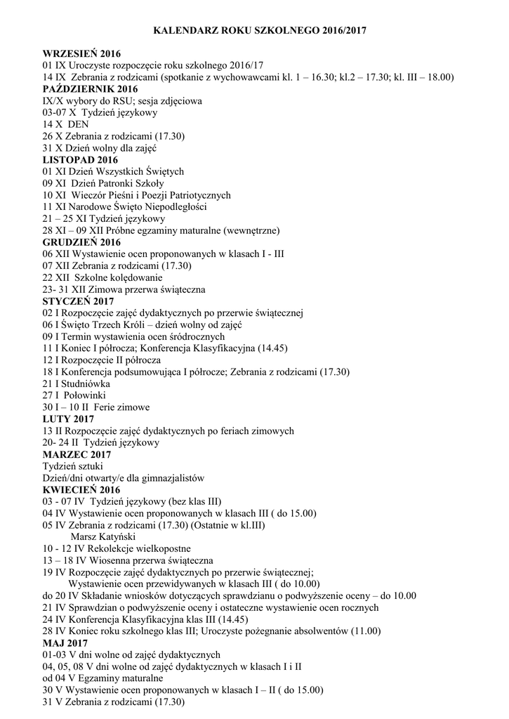 KALENDARZ ROKU SZKOLNEGO 2016/2017 WRZESIEŃ 2016 01 IX Uroczyste rozpoczęcie roku szkolnego 2016/17 14 IX Zebrania z rodzicami (spotkanie z wychowawcami kl. 1 – 16.30; kl.2 – 17.30; kl. III – 18.00) PAŹDZIERNIK 2016 IX/X wybory do RSU; sesja zdjęciowa 03-07 X Tydzień językowy 14 X DEN 26 X Zebrania z rodzicami (17.30) 31 X Dzień wolny dla zajęć LISTOPAD 2016 01 XI Dzień Wszystkich Świętych 09 XI Dzień Patronki Szkoły 10 XI Wieczór Pieśni i Poezji Patriotycznych 11 XI Narodowe Święto Niepodległości 21 – 25 XI Tydzień językowy 28 XI – 09 XII Próbne egzaminy maturalne (wewnętrzne) GRUDZIEŃ 2016 06 XII Wystawienie ocen proponowanych w klasach I - III 07 XII Zebrania z rodzicami (17.30) 22 XII Szkolne kolędowanie 23- 31 XII Zimowa przerwa świąteczna STYCZEŃ 2017 02 I Rozpoczęcie zajęć dydaktycznych po przerwie świątecznej 06 I Święto Trzech Króli – dzień wolny od zajęć 09 I Termin wystawienia ocen śródrocznych 11 I Koniec I półrocza; Konferencja Klasyfikacyjna (14.45) 12 I Rozpoczęcie II półrocza 18 I Konferencja podsumowująca I półrocze; Zebrania z rodzicami (17.30) 21 I Studniówka 27 I Połowinki 30 I – 10 II Ferie zimowe LUTY 2017 13 II Rozpoczęcie zajęć dydaktycznych po feriach zimowych 20- 24 II Tydzień językowy MARZEC 2017 Tydzień sztuki Dzień/dni otwarty/e dla gimnazjalistów KWIECIEŃ 2016 03 - 07 IV Tydzień językowy (bez klas III) 04 IV Wystawienie ocen proponowanych w klasach III ( do 15.00) 05 IV Zebrania z rodzicami (17.30) (Ostatnie w kl.III) Marsz Katyński 10 - 12 IV Rekolekcje wielkopostne 13 – 18 IV Wiosenna przerwa świąteczna 19 IV Rozpoczęcie zajęć dydaktycznych po przerwie świątecznej; Wystawienie ocen przewidywanych w klasach III ( do 10.00) do 20 IV Składanie wniosków dotyczących sprawdzianu o podwyższenie oceny – do 10.00 21 IV Sprawdzian o podwyższenie oceny i ostateczne wystawienie ocen rocznych 24 IV Konferencja Klasyfikacyjna klas III (14.45) 28 IV Koniec roku szkolnego klas III; Uroczyste pożegnanie absolwentów (11.00) MAJ 2017 01-03 V dni wolne od zajęć dydaktycznych 04, 05, 08 V dni wolne od zajęć dydaktycznych w klasach I i II od 04 V Egzaminy maturalne 30 V Wystawienie ocen proponowanych w klasach I – II ( do 15.00) 31 V Zebrania z rodzicami (17.30) CZERWIEC 2017 12VI Wystawienie ocen przewidywanych w klasach I - II ( do 10.00) do 13 VI Składanie wniosków dotyczących sprawdzianu o podwyższenie oceny – do 10.00 14 VI Sprawdzian o podwyższenie oceny i ostateczne wystawienie ocen rocznych; 15 VI Boże Ciało 16 VI Dzień wolny od zajęć 19 VI Konferencja Klasyfikacyjna klas I - II (14.45) 20 VI Dzień Sportu 21 VI Dzień porządkowy; 22 VI Dzień małej turystyki 23 VI Uroczyste zakończenie roku szkolnego 2016/17 (Msza św. 8.00, apel – 9.15); 26 VI Rada Podsumowująca rok szkolny 2016/17 (9.00) 26 VI – 31 VIII 2017r. Ferie letnie 30 VI Wydanie świadectw maturalnych 3
