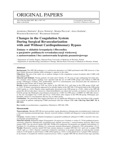 ORIGINAL PAPERS Adv Clin Exp Med 2007, 16, 4, 507–512 ISSN 1230−025X © Copyright by Silesian Piasts University of Medicine in Wrocław AGNIESZKA NIEPOKÓJ1, RAFAŁ NOWICKI1, MAREK PELCZAR1, ANNA GOŹDZIK1, WOJCIECH KUSTRZYCKI1, WALDEMAR GOŹDZIK2 Changes in the Coagulation System During Surgical Revascularization with and Without Cardiopulmonary Bypass Zmiany w układzie krzepnięcia i fibrynolizy u pacjentów poddanych rewaskularyzacji wieńcowej z zastosowaniem i bez zastosowania krążenia pozaustrojowego 1 2 Department of Cardiac Surgery, Silesian Piasts University of Medicine in Wrocław, Poland Department of Anaesthesiology and Intensive Therapy, Silesian Piasts University of Medicine in Wrocław, Poland Abstract Background. The OPCAB technique is a well−known alternative to CABG performed with CPB; however, it has been widely discussed whether either technique is superior to the other. Objectives. The aim of the study was to analyze changes in the coagulation system of patients after CABG with and without CPB. Material and Methods. Twenty patients (16 male and 4 female, 47–79 years of age) undergoing first−time elec− tive coronary artery bypass grafting were operated with the use of CPB (CPB group) and without it (OPCAB group). Fibrinogen, D−dimer, TAT, prothrombin, and F1+2 concentrations were measured after the induction of anesthesia and 8 hours and 24 hours after surgery. Results. Initial concentration of TAT was lower in the OPCAB (5.41 µg/l) than in the CPB group (16.66 µg/l, p = 0.01). D−dimer concentration appeared to be initially higher in the OPCAB (1128 ng/ml) than in the CPB group (448.8 ng/ml, p = 0.03). Platelet count significantly decreased in the CPB group (p = 0.02), while in the OPCAB group this did not take place; moreover, when hemodilution was taken into account, an increase was observed. In both the groups the fibrinogen concentration increased (p = 0.001 for CPB and p = 0.00007 for OPCAB); howev− er, the rise was higher 8 (p = 0.04) and 24 (p = 0.03) hours after surgery in the OPCAB group. Fibrinogen, pro− thrombin, and F1+2 concentrations did not vary in either group. Conclusions. The presented data suggest that there are no significant differences in the activation of the coagula− tion system in patients undergoing CABG performed with and without CPB (Adv Clin Exp Med 2007, 16, 4, 507–512). Key words: revascularization, coagulation, fibrinolysis, OPCAB, CPB. Streszczenie Wprowadzenie. Metoda OPCAB jest powszechnie znaną alternatywą chirurgicznej rewaskularyzacji wieńcowej z użyciem krążenia pozaustrojowego, chociaż wyższość jednej z technik nad drugą jest wciąż przedmiotem dys− kusji. Cel pracy. Analiza zmian w układzie krzepnięcia u pacjentów poddanych zabiegowi CABG z użyciem i bez uży− cia krążenia pozaustrojowego. Materiał i metody. Badaniem objęto 20 pacjentów (16 mężczyzn i 4 kobiety w wieku 47–79 lat) poddanych pierw− szorazowo planowej chirurgicznej rewaskularyzacji mięśnia sercowego z zastosowaniem maszyny płuco−serce (grupa CPB) i bez jej użycia (grupa OPCAB). Próbki krwi pobierano od pacjentów po indukcji znieczulenia (1), 8 godzin (2) i 24 godziny po zabiegu (3) i oznaczano stężenia fibrynogenu, d−dimerów, TAT, protrombiny i F1+2. Wyniki. Wyjściowe wartości stężeń TAT były istotnie mniejsze w grupie OPCAB (5,41 µg/L) niż w grupie CPB (16,66 µg/L; p = 0,01). Stężenie wyjściowe d−dimerów natomiast w tej grupie okazało się statystycznie istotnie większe (1128 ng/ml) w porównaniu z CPB (448,8 ng/ml; p = 0,03). Liczba płytek krwi w grupie CPB zmniejszy− ła się istotnie w stosunku do wartości wyjściowych (p = 0,02), w grupie OPCAB nie obserwowano tego zjawiska, 508 A. NIEPOKÓJ et al. a nawet po uwzględnieniu rozcieńczenia krwi stwierdzono istotny ich wzrost w 24 godz. od zakończenia zabiegu chirurgicznego. W obu badanych grupach stwierdzono istotne zwiększenie wartości stężenia fibrynogenu (dla CPB p = 0,001; dla OPCAB p = 7.12 × 10–05). Wzrost ten był istotnie większy w grupie OPCAB w 8 godz. (p = 0,04) i w 24 godz. od zakończenia zabiegu (p = 0,03). Nie stwierdzono istotnych statystycznie różnic między stężenia− mi kompleksów TAT, F1+2, ATIII między obu grupami podczas całego okresu badawczego. Wnioski. Przedstawione dane sugerują, że nie ma istotnych różnic w aktywacji układu krzepnięcia i fibrynolizy u pacjentów poddawanych rewaskularyzacji wieńcowej z użyciem i bez użycia krążenia pozaustrojowego (Adv Clin Exp Med 2007, 16, 4, 507–512). Słowa kluczowe: rewaskularyzacja, krzepnięcie, fibrynoliza, OPCAB, CPB. Coronary vascular disease is a type of general− ized atheromatic process in the coronary arteries and it is the leading cause of death in developed countries. Nowadays there are two main invasive methods of treating coronary vascular disease: angioplasty of the coronary arteries and surgical procedures [1]. It is worth noting that advances in interventional cardiological techniques have caused a rise in the number of high−risk patients qualified for surgical treatment. One of the routine methods of treating coronary vascular disease is surgical revascularization of the heart muscle with the use of cardiopulmonary bypass (CPB). Efforts to minimize the risk of complications have result− ed in the introduction of the OPCAB technique (off−pump coronary artery bypass), which means performing the operation on a beating heart, i.e. without arresting it with cardioplegic solution and without the use of a heart−lung machine. Although the necessity of performing such operations is without doubt, they are still connect− ed with intra− and post−operative complications, such as bleeding, stroke, and myocardial infarc− tion. Avoiding CPB results in a significant decrease in the number of neurological complica− tions, but does not influence the number of throm− bolic events or postoperative bleeding