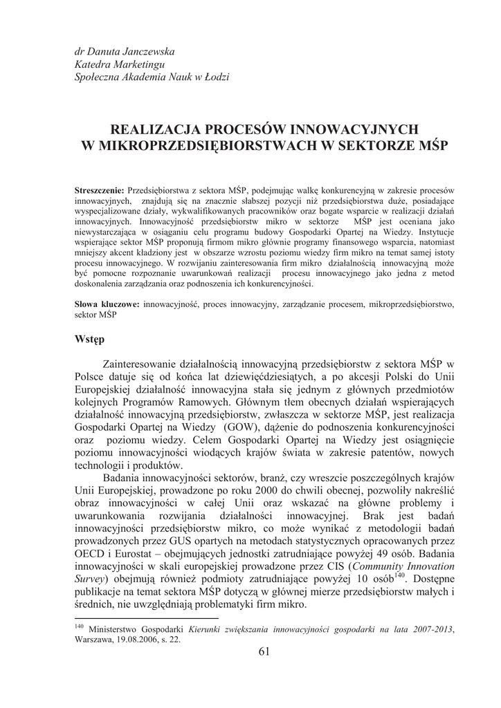 dr Danuta Janczewska Katedra Marketingu Społeczna Akademia Nauk w Łodzi REALIZACJA PROCESÓW INNOWACYJNYCH W MIKROPRZEDSIĘBIORSTWACH W SEKTORZE MŚP Streszczenie: Przedsiębiorstwa z sektora MŚP, podejmując walkę konkurencyjną w zakresie procesów innowacyjnych, znajdują się na znacznie słabszej pozycji niż przedsiębiorstwa duże, posiadające wyspecjalizowane działy, wykwalifikowanych pracowników oraz bogate wsparcie w realizacji działań innowacyjnych. Innowacyjność przedsiębiorstw mikro w sektorze MŚP jest oceniana jako niewystarczająca w osiąganiu celu programu budowy Gospodarki Opartej na Wiedzy. Instytucje wspierające sektor MŚP proponują firmom mikro głównie programy finansowego wsparcia, natomiast mniejszy akcent kładziony jest w obszarze wzrostu poziomu wiedzy firm mikro na temat samej istoty procesu innowacyjnego. W rozwijaniu zainteresowania firm mikro działalnością innowacyjną może być pomocne rozpoznanie uwarunkowań realizacji procesu innowacyjnego jako jedna z metod doskonalenia zarządzania oraz podnoszenia ich konkurencyjności. Słowa kluczowe: innowacyjność, proces innowacyjny, zarządzanie procesem, mikroprzedsiębiorstwo, sektor MŚP Wstęp Zainteresowanie działalnością innowacyjną przedsiębiorstw z sektora MŚP w Polsce datuje się od końca lat dziewięćdziesiątych, a po akcesji Polski do Unii Europejskiej działalność innowacyjna stała się jednym z głównych przedmiotów kolejnych Programów Ramowych. Głównym tłem obecnych działań wspierających działalność innowacyjną przedsiębiorstw, zwłaszcza w sektorze MŚP, jest realizacja Gospodarki Opartej na Wiedzy (GOW), dążenie do podnoszenia konkurencyjności oraz poziomu wiedzy. Celem Gospodarki Opartej na Wiedzy jest osiągnięcie poziomu innowacyjności wiodących krajów świata w zakresie patentów, nowych technologii i produktów. Badania innowacyjności sektorów, branż, czy wreszcie poszczególnych krajów Unii Europejskiej, prowadzone po roku 2000 do chwili obecnej, pozwoliły nakreślić obraz innowacyjności w całej Unii oraz wskazać na główne problemy i uwarunkowania rozwijania działalności innowacyjnej. Brak jest badań innowacyjności przedsiębiorstw mikro, co może wynikać z metodologii badań prowadzonych przez GUS opartych na metodach statystycznych opracowanych przez OECD i Eurostat – obejmujących jednostki zatrudniające powyżej 49 osób. Badania innowacyjności w skali europejskiej prowadzone przez CIS (Community Innovation Survey) obejmują również podmioty zatrudniające powyżej 10 osób140. Dostępne publikacje na temat sektora MŚP dotyczą w głównej mierze przedsiębiorstw małych i średnich, nie uwzględniają problematyki firm mikro. 140 Ministerstwo Gospodarki Kierunki zwiększania innowacyjności gospodarki na lata 2007-2013, Warszawa, 19.08.2006, s. 22. 61 1. Miejsce przedsiębiorstw mikro w strukturze gospodarczej Sektor MŚP obejmuje 99,8 % ogólnej liczby przedsiębiorstw w Polsce. Największą grupę przedsiębiorstw tworzą firmy mikro, w których znajduje zatrudnienie ponad 3,5 mln pracowników. Dane dotyczące firm mikro w Unii Europejskiej wskazują na porównywalny poziom wskaźników statystycznych w 27 krajach unijnych, kształtując się odpowiednio na poziomie 96,1% i 92,1% (por. tabela 1). Wyniki dotyczące liczby przedsiębiorstw przedstawione w tabeli 1 wskazują na podobne tendencje w strukturze przedsiębiorstw w gospodarce Polski i Unii Europejskiej. Tabela 1. Podstawowe dane statystyczne dla sektora MŚP w Polsce i w krajach Unii Europejskiej Liczba przedsiębiorstw Polska Wielkość przedsiębiorstwa Liczba Mikro 1495325 Zatrudnienie UE-27 Polska UE-27 Udział Udział Liczba Udział Udział 96,1% 92,1% 3530558 38,1% 29,8% Małe 42557 2,7% 6,6% 957115 10,9% 20,4% Średnie 15303 1,0% 1,1% 1611947 18,4% 16,8% 99,8% 99,8% 5899620 67,5% 67,0% MŚP 1552965 Duże 3321 0,2% 0,2% 2846524 32,5% 33,0% 1556286 100% 100% 8746154 100% 100% Razem Źródło: Opracowanie własne na podstawie arkusza informacyjnego SBA Polska 2010/2011 za http://eteuropa.eu/enterprise/policies/sme/facts-figures-analysis/performance-review/files/countries-sheets/20102011/poland_en.pdf Działalność innowacyjna sektora MŚP jest oceniana jako niezadowalająca, zwłaszcza dotyczy to najmniejszych firm o zasięgu lokalnym, których celem jest przetrwanie na rynku. Działania charakterystyczne dla innowacji, takie jak badania i rozwój, posiadanie patentów i licencji, znaków towarowych, nowoczesnych i unikatowych produktów, występują w sektorze MŚP sporadycznie141. 2. Instytucjonalne uwarunkowania działalności innowacyjnej mikrofirm w sektorze MŚP Systemy innowacyjne wspierania innowacyjnej działalności przedsiębiorstw powstawały w Polsce od początku lat dziewięćdziesiątych i jako forma zinstytucjonalizowana przekształciły się w sieć ośrodków transferu wiedzy, 141 R. Wolański, Wiedza i innowacje w małych i średnich przedsiębiorstwach- postęp czy stagnacja, http://www.instytut.info/IIIkonf/referaty.pdf 62 technologii142, w których przedsiębiorstwa MŚP mogły otrzymać informacje niezbędne do uzyskania pomocy finansowej, specjalistyczne porady oraz możliwość kontaktu z instytucjami naukowo-badawczymi. Obecnie rolę centrów transferu technologii pełnią inicjatywy sieciowe, zarówno krajowe, jak i europejskie143. Kolejne programy wsparcia działalności innowacyjnej doprowadziły do powstania szeregu instytucji oferujących pomoc przedsiębiorstwom MŚP w zakresie działań innowacyjnych w ramach Narodowego Systemu Innowacji144. 7 Program Ramowy ma na celu wspieranie kluczowych aspektów europejskiego potencjału w zakresie badań, rozwoju i innowacji. Kolejnym programem ważnym dla międzynarodowej konkurencyjności i innowacyjności przedsiębiorstw w Polsce jest Program Ramowy na rzez Konkurencyjności i Innowacyjności – CIP. Wspieraniem działalności innowacyjnej firm z sektora MŚP zajmuj