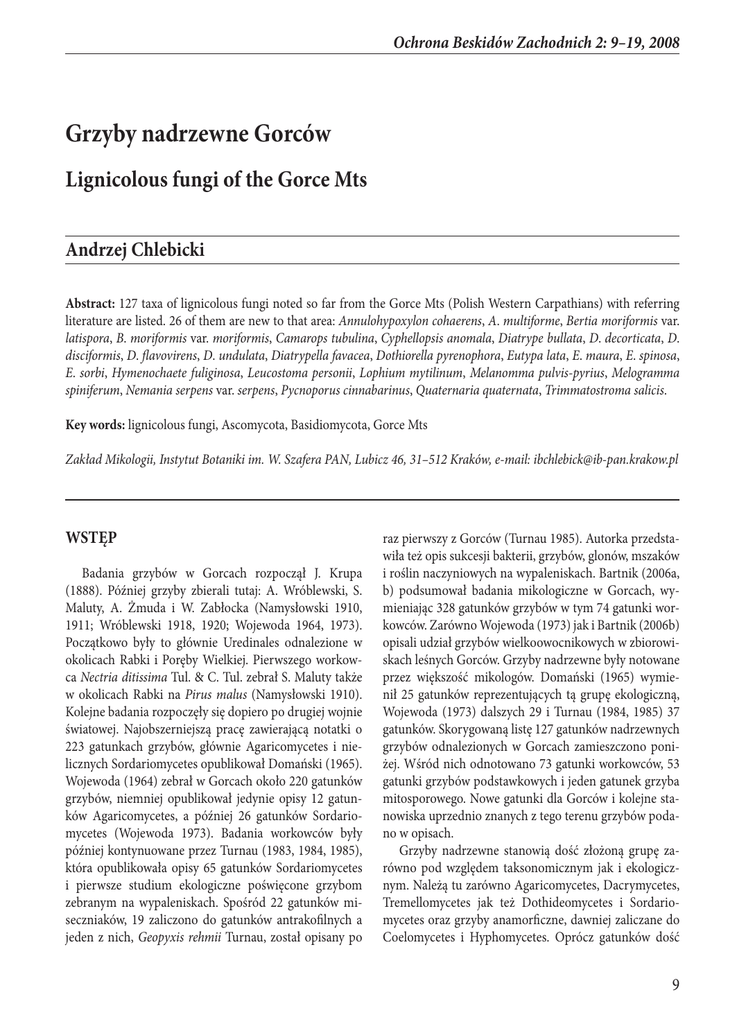 Ochrona Beskidów Zachodnich 2: 9–19, 2008 Grzyby nadrzewne Gorców Lignicolous fungi of the Gorce Mts Andrzej Chlebicki Abstract: 127 taxa of lignicolous fungi noted so far from the Gorce Mts (Polish Western Carpathians) with referring literature are listed. 26 of them are new to that area: Annulohypoxylon cohaerens, A. multiforme, Bertia moriformis var. latispora, B. moriformis var. moriformis, Camarops tubulina, Cyphellopsis anomala, Diatrype bullata, D. decorticata, D. disciformis, D. flavovirens, D. undulata, Diatrypella favacea, Dothiorella pyrenophora, Eutypa lata, E. maura, E. spinosa, E. sorbi, Hymenochaete fuliginosa, Leucostoma personii, Lophium mytilinum, Melanomma pulvis-pyrius, Melogramma spiniferum, Nemania serpens var. serpens, Pycnoporus cinnabarinus, Quaternaria quaternata, Trimmatostroma salicis. Key words: lignicolous fungi, Ascomycota, Basidiomycota, Gorce Mts Zakład Mikologii, Instytut Botaniki im. W. Szafera PAN, Lubicz 46, 31–512 Kraków, e-mail: [email protected] WSTĘP Badania grzybów w Gorcach rozpoczął J. Krupa (1888). Później grzyby zbierali tutaj: A. Wróblewski, S. Maluty, A. Żmuda i W. Zabłocka (Namysłowski 1910, 1911; Wróblewski 1918, 1920; Wojewoda 1964, 1973). Początkowo były to głównie Uredinales odnalezione w okolicach Rabki i Poręby Wielkiej. Pierwszego workowca Nectria ditissima Tul. & C. Tul. zebrał S. Maluty także w okolicach Rabki na Pirus malus (Namysłowski 1910). Kolejne badania rozpoczęły się dopiero po drugiej wojnie światowej. Najobszerniejszą pracę zawierającą notatki o 223 gatunkach grzybów, głównie Agaricomycetes i nielicznych Sordariomycetes opublikował Domański (1965). Wojewoda (1964) zebrał w Gorcach około 220 gatunków grzybów, niemniej opublikował jedynie opisy 12 gatunków Agaricomycetes, a później 26 gatunków Sordariomycetes (Wojewoda 1973). Badania workowców były później kontynuowane przez Turnau (1983, 1984, 1985), która opublikowała opisy 65 gatunków Sordariomycetes i pierwsze studium ekologiczne poświęcone grzybom zebranym na wypaleniskach. Spośród 22 gatunków miseczniaków, 19 zaliczono do gatunków antrakofilnych a jeden z nich, Geopyxis rehmii Turnau, został opisany po raz pierwszy z Gorców (Turnau 1985). Autorka przedstawiła też opis sukcesji bakterii, grzybów, glonów, mszaków i roślin naczyniowych na wypaleniskach. Bartnik (2006a, b) podsumował badania mikologiczne w Gorcach, wymieniając 328 gatunków grzybów w tym 74 gatunki workowców. Zarówno Wojewoda (1973) jak i Bartnik (2006b) opisali udział grzybów wielkoowocnikowych w zbiorowiskach leśnych Gorców. Grzyby nadrzewne były notowane przez większość mikologów. Domański (1965) wymienił 25 gatunków reprezentujących tą grupę ekologiczną, Wojewoda (1973) dalszych 29 i Turnau (1984, 1985) 37 gatunków. Skorygowaną listę 127 gatunków nadrzewnych grzybów odnalezionych w Gorcach zamieszczono poniżej. Wśród nich odnotowano 73 gatunki workowców, 53 gatunki grzybów podstawkowych i jeden gatunek grzyba mitosporowego. Nowe gatunki dla Gorców i kolejne stanowiska uprzednio znanych z tego terenu grzybów podano w opisach. Grzyby nadrzewne stanowią dość złożoną grupę zarówno pod względem taksonomicznym jak i ekologicznym. Należą tu zarówno Agaricomycetes, Dacrymycetes, Tremellomycetes jak też Dothideomycetes i Sordariomycetes oraz grzyby anamorficzne, dawniej zaliczane do Coelomycetes i Hyphomycetes. Oprócz gatunków dość 9 Ochrona Beskidów Zachodnich 2: 9–19, 2008 pospolitych, o szerokiej skali ekologicznej, jak np. Fomitopsis pinicola (Swartz) P. Karst., występują na drewnie również wyspecjalizowane gatunki, jak i gatunki rzadko spotykane w lasach, np. Hymenochaete fuliginosa (Pers.) Lév., H. cruenta (Pers.) Donk i Hericium flagellum (Scop.) Pers. Ponadto granica pomiędzy pasożytniczymi i saprotroficznymi grzybami nadrzewnymi jest dość trudna do przeprowadzenia (Chesters 1950). Anamorfy niektórych nadrzewnych grzybów żyją jako endofity w pędach roślinności zielnej i dopiero pod koniec sezonu wegetacyjnego zmieniają żywiciela i owocują na drewnie. Podłoże, na którym żyją nadrzewne grzyby jest kolejnym elementem wpływającym na zmienność i zróżnicowanie zbiorowiska grzybów. Drewno jest złożoną strukturą, odmienną dla każdego gatunku drzewa, organu (gałęzie, pnie), stanu tych organów (żywe, zamierające, martwe), położenia (leżące na ziemi lub nadal związane z żywym drzewem). Pozbawione kory drewno jest twarde i suche, w związku z tym jest trudno dostępne dla wielu gatunków higrofilnych grzybów. Nadrzewne workowce mają niewielkie, skorupowate owocowania, przystosowane do życia w warunkach deficytu wody. Często grzyby te tworzą tzw. „strefy brzuszne” zagłębione w drewnie. Obszar drewna otoczony taką strefą ulega podsuszeniu i dzięki temu jest niedostępny dla grzybów podstawkowych, które nie są przystosowane do tak skrajnych warunków. Strefy brzuszne workowców sięgają płytko w głąb drewna, najczęściej kilka cm, rzadziej kilkanaście. Skutkiem działalności workowców jest utrata perydermy i kory na pniach i gałęziach. Dalszego rozkładu drewna dokonują grzyby podstawkowe powodujące brunatną i białą zgniliznę. Najczęściej są one późnymi kolonizatorami martwej substancji drzewnej. Na pniach i gałęziach buków w Gorcach występują charakterystyczne zbiorowiska grzybów nadrzewnych. Stojące, żywe lub zamierające buki są atakowane przez pasożytnicze gatunki Fomitopsis pinicola, Fomes fomentarius i Kretzchmaria deusta, na zamierających młodych bukach u podstawy pnia jest spotykana Melogramma spiniferum i wyżej Diatrypella favacea. Leżące pnie i grube gałęzie buków są zasiedlane na dużych powierzchniach przez ceglastoczerwone podkładki Hypoxylon fragiforme i czarne Eutypa spinosa, w pobliżu korzeni występuje Kretschmaria deusta, miejscowo na niewielkich powierzchniach występuj