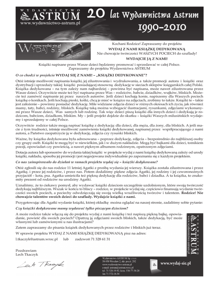 Kochani Rodzice! Zapraszamy do projektu WYDAJ Z NAMI KSIĄŻKĘ DEDYKOWANĄ Nie chowajcie twórczości WASZYCH POCIECH do szuflady! WYDAJCIE JĄ Z NAMI! Książki napisane przez Wasze dzieci będziemy promować i sprzedawać w całej Polsce. Zapraszamy do projektu Wydawnictwa Astrum O co chodzi w projekcie WYDAJ SIĘ Z NAMI! – „KSIĄŻKI DEDYKOWANE”? Otóż istnieje możliwość napisania książki, jej zilustrowania i wydrukowania, a także promocji autora i książki oraz dystrybucji i sprzedaży takiej książki posiadającej stosowną dedykację w sieciach sklepów księgarskich całej Polski. Książka dedykowana – na tym zależy nam najbardziej – powinna być napisana, może nawet zilustrowana przez Wasze dzieci. Oczywiście może też być napisana przez Was – rodziców, babcie, dziadków, wujków, bliskich. Możecie też zamówić napisanie jej przez naszych autorów. Jeśli dzieci kochają konie, napiszemy dla Waszych pociech książkę o konikach. Jeśli kochają pieski, kotki, chcą je mieć w książce na zdjęciach, zrobimy to także. Książki te – takie jest założenie – powinny posiadać dedykację. Mile widziane zdjęcia dzieci w różnych okresach ich życia, jak również mamy, taty, babci, rodziny, bliskich. Książkę taką można wzbogacić ilustracjami, rysunkami, zdjęciami wykonanymi przez Wasze dzieci, Was samych lub rodzinę. Tak więc dzieci piszą książki dla innych dzieci i dedykują je rodzicom, babciom, dziadkom, bliskim. My – jeśli projekt dojdzie do skutku – książki Waszych milusińskich wydajemy i sprzedajemy w całej Polsce. Oczywiście rodzice także mogą napisać książkę z dedykacją: dla dzieci, dla męża, dla żony, dla bliskich. A jeśli macie z tym trudności, istnieje możliwość zamówienia książki dedykowanej, napisanej przez współpracującego z nami autora, a Państwo zaopatrzycie ją w dedykację, zdjęcia czy rysunki bliskich. Ważne, by książka dedykowana była adresowana – poprzez dedykację, zdjęcia – bezpośrednio do najbliższej osoby czy grupy osób. Książki te mogą być w niewielkim, jak i w dużym nakładzie. Mogą być bajkami dla dzieci, tomikiem poezji, opowiadań czy powieścią, a nawet pięknym albumem rodzinnym, opatrzonym zdjęciami. Dotacja autora lub sponsorów do wydania takiej książki w projekcie wydaj z nami książkę dedykowaną zależy od urody książki, nakładu, sposobu jej promocji i jest negocjowana indywidualnie po zapoznaniu się z każdym projektem. Co nas zainspirowało do działań w ramach projektu wydaj się – książki dedykowane? Otóż zgłosili się do nas rodzice 11 letniej Agatki z prośbą wydania jej wierszy. Książka została zilustrowana i przez Agatkę, i przez jej rodziców, i przez nas. Potem dodaliśmy piękne zdjęcia Agatki, jej rodziny i jej czworonożnych przyjaciół – kota, psa. Agatka umieściła też piękną dedykację dla rodziców, babci i dziadka. A ta książka, to znakomity prezent od rodziców na urodziny Agatki. Uznaliśmy, że to ciekawy pomysł, aby wydawać książki dzieciom szczególnie uzdolnionym, które swoją twórczość dedykują najbliższym. Wszak w końcu to bliscy – rodzice, w projekcie wydaj się, częściowo finansują wydanie twórczości swoich pociech, a pociechy odwdzięczają się swoją wielką wrażliwością twórców i talentem. Rodzice! Nie chowajcie talentów swoich dzieci do szuflady. Wydajcie książki z nami. Przygotowując dla Agatki wydanie książki, której okładkę można oglądać na naszej stronie, zadaliśmy sobie pytanie: Czy książki dedykowane mamy wydawać tylko piszącym dzieciom? A może rodzice także włączą się do projektu wydaj z nami książkę i też napiszą piękną bajkę, opowiadanie, powieść dla swoich pociech? Opatrzą ją zdjęciami swoich bliskich, także dedykacją, być może własnymi lub zamówionymi u nas ilustracjami? Zatem zapraszamy do pisania książek dedykowanych przez rodziców i bliskich już teraz. W sprawie projektu wydaj z nami książkę dedykowaną pisz na adres: [email protected] Pozdrawiam Lech Tkaczyk lub zadzwoń 71 328 61 31
