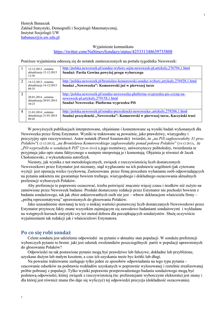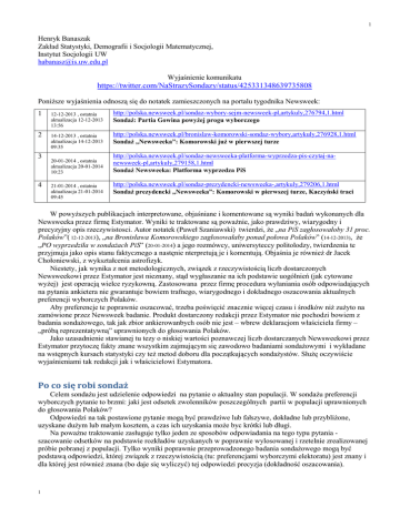1 Henryk Banaszak Zakład Statystyki, Demografii i Socjologii Matematycznej, Instytut Socjologii UW [email protected] Wyjaśnienie komunikatu https://twitter.com/NaStrazySondazy/status/425331348639735808 Poniższe wyjaśnienia odnoszą się do notatek zamieszczonych na portalu tygodnika Newsweek: 1 12-12-2013 , ostatnia aktualizacja 12-12-2013 13:56 http://polska.newsweek.pl/sondaz-wybory-sejm-newsweek-pl,artykuly,276794,1.html Sondaż: Partia Gowina powyżej progu wyborczego 2 14-12-2013 , ostatnia aktualizacja 14-12-2013 09:35 http://polska.newsweek.pl/bronislaw-komorowski-sondaz-wybory,artykuly,276928,1.html Sondaż „Newsweeka”: Komorowski już w pierwszej turze 3 4 20-01-2014 , ostatnia aktualizacja 20-01-2014 10:23 21-01-2014 , ostatnia aktualizacja 21-01-2014 09:45 http://polska.newsweek.pl/sondaz-newsweeka-platforma-wyprzedza-pis-czytaj-nanewsweek-pl,artykuly,279158,1.html Sondaż Newsweeka: Platforma wyprzedza PiS http://polska.newsweek.pl/sondaz-prezydencki-newsweeka-,artykuly,279206,1.html Sondaż prezydencki „Newsweeka”: Komorowski w pierwszej turze, Kaczyński traci W powyższych publikacjach interpretowane, objaśniane i komentowane są wyniki badań wykonanych dla Newsweeka przez firmę Estymator. Wyniki te traktowane są poważnie, jako prawdziwy, wiarygodny i precyzyjny opis rzeczywistosci. Autor notatek (Paweł Szaniawski) twierdzi, że „na PiS zagłosowałoby 31 proc. Polaków”( 12-12-2013), „na Bronisława Komorowskiego zagłosowałaby ponad połowa Polaków” (14-12-2013), że „PO wyprzedziła w sondażach PiS” (20-01-2014) a jego rozmówcy, uniwersyteccy politolodzy, twierdzenia te przyjmuja jako opis stanu faktycznego a nastęnie nterpretują je i komentują. Objaśnia je również dr Jacek Chołoniewski, z wykształcenia astrofizyk. Niestety, jak wynika z not metodologicznych, związek z rzeczywistością liczb dostarczonych Newsweekowi przez Estymator jest nieznany, stąd wygłaszanie na ich podstawie uogólnień (jak cytowane wyżej) jest operacją wielce ryzykowną. Zastosowana przez firmę procedura wyłaniania osób odpowiadających na pytania ankietera nie gwarantuje bowiem trafnego, wiarygodnego i dokładnego oszacowania aktualnych preferencji wyborczych Polaków. Aby preferencje te poprawnie oszacować, trzeba poświęcić znacznie więcej czasu i środków niż zużyto na zamówione przez Newsweek badanie. Produkt dostarczony redakcji przez Estymator nie pochodzi bowiem z badania sondażowego, tak jak zbior ankierowanbych osób nie jest – wbrew deklaracjom właściciela firmy – „próbą reprezentatywną” uprawnionych do głosowania Polaków. Jako uzasadnienie stawianej tu tezy o niskiej wartości poznawczej liczb dostarczanych Newsweekowi przez Estymator przytoczę fakty znane wszystkim zajmującym się zawodowo badaniami sondażowymi i wykładane na wstępnych kursach statystyki czy też metod doboru dla początkujących sondażystów. Służę oczywiście wyjaśnieniami tak redakcji jak i właścicielowi Estymatora. Po co się robi sondaż Celem sondażu jest udzielenie odpowiedzi na pytanie o aktualny stan populacji. W sondażu preferencji wyborczych pytanie to brzmi: jaki jest odsetek zwolenników poszczególnych partii w populacji uprawnionych do głosowania Polaków? Odpowiedzi na tak postawione pytanie mogą być prawdziwe lub fałszywe, dokładne lub przybliżone, uzyskane dużym lub małym kosztem, a czas ich uzyskania może byc krótki lub długi. Na poważne traktowanie zasługuje tylko jeden ze sposobów odpowiadania na tego typu pytania szacowanie odsetków na podstawie rozkładów uzyskanych w poprawnie wylosowanej i rzetelnie zrealizowanej próbie pobranej z populacji. Tylko wyniki poprawnie przeprowadzonego badania sondażowego mogą być podstawą odpowiedzi, której związek z rzeczywistością (tu: preferencjami wyborczymi elektoratu) jest znany i dla której jest również znana (bo daje się wyliczyć) tej odpowiedzi precyzja (dokładność oszacowania). 1 2 Nie oznacza to bynajmniej, że przepowiednie wróżek, poglądy ekspertów czy też wyniki przedsięwzięć sondażo-podobnych (sond ulicznych, plebiscytów audio-tele, ankiet internetowych itp.) są zawsze nietrafne różnie to bywa. Sondażowe sposoby odpowiadania na pytania o cechy populacji mają jednak cechy, których wróżby, poglądy ekspertów i wyniki przedsięwzięć sondażo-podobnych nie mają, bo mieć nie mogą. Poprawnie wykonany sondaż daje oszacowania tak samo trafne i tak samo precyzyjne zawsze, bez wzlędu na to, czy dotyczy poglądów politycznych czy też ulubionego proszku do prania, czy pogoda w „miejscach publicznych” sprzyjała konwersjacjom z ankieterem czy nie i czy wróżnka lub ekspert mieli dobry czy zły dzień. I tym sondaż rózni się od wróżb i przedsięwzięć sondażo-podobnych. Niestety, nie za darmo. Dobry sondaż kosztuje Poprawnie zaprojektowany i uczciwie zrealizowany sondaż musi kosztować. Próba, na podstawie której będą szacowane parametry populacji (jak odsetki czy średnie) musi zostać z populacji wylosowana. Kosztuje operat losowania i projekt schematu doboru, łątwy i tani w realizacji badania (mało dojazdów) a zarazem statystycznie efektywny (wystarczająca dokłądność oszacowań). Jeśli precyzja oszacowań ma być wysoka, próba musi być duża i trzeba ją rzetelniej zrealizować w terenie, co kosztuje dodatkowo. Najwięcej kosztuje dotarcie do osoby wylosowanej. W poprawnie prowadzonym badaniu sondażowym ankieter musi dotrzeć do każdego z wylosowanych i przekonać go do udziału w badaniu. To kosztuje przciętny koszt dojazdu do 1 osoby wylosowanej w badaniu na próbie ogólnopolskiej to kwota rzędu 20-40 złotych. Kosztuje również wynagrodzenia ankietera. Jeśli jest zbyt niskie, jego skuteczność docierania do osób wylosowanych i uzyskiwania od nich odpowiedzi spada, odsetek jednostek wylosowanych lecz niedostępnych wzrasta a dokładność oszacowań drastycznie się poga