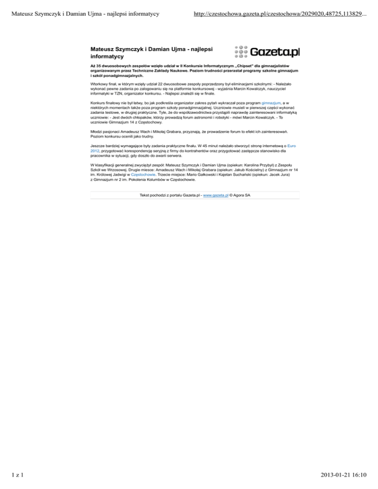 Mateusz Szymczyk i Damian Ujma - najlepsi informatycy http://czestochowa.gazeta.pl/czestochowa/2029020,48725,113829... Mateusz Szymczyk i Damian Ujma - najlepsi informatycy Aż 35 dwuosobowych zespołów wzięło udział w II Konkursie Informatycznym ,,Chipset" dla gimnazjalistów organizowanym przez Techniczne Zakłady Naukowe. Poziom trudności przerastał programy szkolne gimnazjum i szkół ponadgimnazjalnych. Wtorkowy finał, w którym wzięły udział 22 dwuosobowe zespoły poprzedzony był eliminacjami szkolnymi: - Należało wykonać pewne zadania po zalogowaniu się na platformie konkursowej - wyjaśnia Marcin Kowalczyk, nauczyciel informatyki w TZN, organizator konkursu. - Najlepsi znaleźli się w finale. Konkurs finałowy nie był łatwy, bo jak podkreśla organizator zakres pytań wykraczał poza program gimnazjum, a w niektórych momentach także poza program szkoły ponadgimnazjalnej. Uczniowie musieli w pierwszej części wykonać zadania testowe, w drugiej praktyczne. Tyle, że do współzawodnictwa przystąpili naprawdę zainteresowani informatyką uczniowie: - Jest dwóch chłopaków, którzy prowadzą forum astronomii i robotyki - mówi Marcin Kowalczyk. - To uczniowie Gimnazjum 14 z Częstochowy. Młodzi pasjonaci Amadeusz Wach i Mikołaj Grabara, przyznają, że prowadzenie forum to efekt ich zainteresowań. Poziom konkursu ocenili jako trudny. Jeszcze bardziej wymagające były zadania praktyczne finału. W 45 minut należało stworzyć stronę internetową o Euro 2012, przygotować korespondencję seryjną z firmy do kontrahentów oraz przygotować zastępcze stanowisko dla pracownika w sytuacji, gdy doszło do awarii serwera. W klasyfikacji generalnej zwyciężył zespół: Mateusz Szymczyk i Damian Ujma (opiekun: Karolina Przybył) z Zespołu Szkół we Wrzosowej. Drugie miesce: Amadeusz Wach i Mikołaj Grabara (opiekun: Jakub Kościelny) z Gimnazjum nr 14 im. Królowej Jadwigi w Częstochowie. Trzecie miejsce: Mario Gałkowski i Kajetan Suchański (opiekun: Jacek Jura) z Gimnazjum nr 2 im. Pokolenia Kolumbów w Częstochowie. Tekst pochodzi z portalu Gazeta.pl - www.gazeta.pl © Agora SA 1z1 2013-01-21 16:10