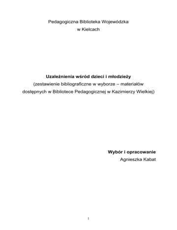 Pedagogiczna Biblioteka Wojewódzka w Kielcach Uzależnienia wśród dzieci i młodzieży (zestawienie bibliograficzne w wyborze – materiałów dostępnych w Bibliotece Pedagogicznej w Kazimierzy Wielkiej) Wybór i opracowanie Agnieszka Kabat 1 I. Druki zwarte: 1. Alkohol a młode pokolenie Polaków połowy lat dziewięćdziesiątych / pod red. Renaty Durdy. – Warszawa : Państwowa Agencja Rozwiązywania Problemów Alkoholowych, 1999 Sygn. 28726 Wypożyczalnia 2. Alkoholizm a niedostosowanie społeczne dzieci i młodzieży : materiały z sesji popularnonaukowej / pod red. Tadeusza Pluty. – Kielce : Wyższa Szkoła Pedagogiczna, 1979 Sygn. 19013 Wypożyczalnia 3. Górski, Stanisław : Uwaga rodzice-narkomania / Stanisław Górski. – Warszawa : Instytut Wydawniczy Związków Zawodowych, 1985 Sygn. 24285 Wypożyczalnia 4. Jakubowska, Hanna : Promocja zdrowia i profilaktyka uzależnień. Przewodnik nauczyciela szkoły podstawowej i gimnazjum / Hanna Jakubowska. – Warszawa : Wydawnictwo Szkolne PWN, 1999 Sygn. 28836 Wypożyczalnia 5. Kołakowska-Przełomiec, Helena : Społeczne uwarunkowania alkoholizowania się nieletnich / Helena Kołakowska-Przełomiec. – Wrocław : Zakład Narodowy im. Ossolińskich, 1979 Sygn. 17837 Wypożyczalnia 6. Lowe, Geoff : Picie młodzieży a style życia w rodzinie / Geoff Lowe, David R. Foxcroft, David Sibley. – Warszawa : Państwowa Agencja Rozwiązywania Problemów Alkoholowych, 2000 Sygn. 28813 Wypożyczalnia 7. Marzec-Tarasińska, Anna : Praca wychowawcza z uczniem zagrożonym uzależnieniem od środków odurzających // W : Praca wychowawcza z dziećmi i młodzieżą / pod red. Mieczysława Łobockiego. – Lublin : Wydawnictwo Uniwersytetu im. Marii Curie-Skłodowskiej, 1998. – S. 151-160 Sygn. 28704 Wypożyczalnia 8. Problemy zagrożenia młodzieży uzależnieniem : z doświadczeń praktyków / pod red. Jacka Kamińskiego i Jadwigi Raczkowskiej. – Warszawa : Centralny Ośrodek Metodyczny Poradnictwa Wychowawczo-Zawodowego, 1990 Sygn. 1853 P Wypożyczalnia 9. Śledzianowski, Jan : Uzależnienia dzieci i młodzieży // W : Encyklopedia Pedagogiczna XXI wieku. T. VI / pod red. Tadeusza Pilcha. – Warszawa : Wydawnictwo Akademickie „Żak”, 2007. – S. 1183-1188 Sygn. 30222 Czytelnia 10. Tobis, Tomasz : Postawy młodzieży wobec papierosów i alkoholu w świetle badań na terenie Tczewa // W : Psychospołeczne uwarunkowania zjawisk dewiacyjnych wśród młodzieży w okresie transformacji ustrojowej w Polsce / pod red. Henryka Machela, Krzysztofa Wszeborowskiego. – Gdańsk; Sopot : 2 Wydawnictwo Uniwersytetu Gdańskiego, 1999. – S. 183-193 Sygn. 29313 Wypożyczalna 11. Vogler, Roger E : Nastolatki i alkohol : kiedy nie wystarczy powiedzieć „nie” / Roger E. Vogler, Wayne R. Bartz. – Warszawa : Państwowa Agencja Rozwiązywania Problemów Alkoholowych, 1999 Sygn. 28727 Wypożyczalnia Artykuły z prasy: 1. Araszczuk, Zofia : Narkomania czyli rzecz o smutku młodości. Scenariusz spotkania z młodzieżą szkół średnich / Zofia Araszczuk // „Biblioteka w Szkole”. – 2001, nr 5, s. 14-16 2. Bakuła, Anna : Jak pomagać młodym / Anna Bakuła, Piotr Bakuła // „Świat Problemów”. – 2005, nr 12, s. 22-24 3. Bakuła, Piotr : Rodzice uzależnionego dziecka / Piotr Bakuła // „Świat Problemów”. – 2004, nr 7-8, s. 34-36 4. Białek, Dorota : Wokół jednej lektury „Stop” narkotykom / Dorota Białek // „Język Polski w Gimnazjum”. – 2001/2002, nr 3, s. 29-36 5. Błażejewska, Halina : Świat bez uzależnień byłby lepszy. Debata dla uczniów gimnazjum realizowana metodą projektu / Halina Błażejewska // „Biblioteka w Szkole”. – 2001, nr 9, s. 13-14 6. Boćwińska-Kiluk, Beata : Uzależnienia wśród młodzieży / Beata BoćwińskaKiluk // „Edukacja i Dialog”. – 2000, nr 4, s. 58-63 7. Boy, Urszula : Rola nauczyciela wychowania fizycznego w zwalczaniu uzależnień / Urszula Boy // „Inspiracje”. – 2002, nr 1, s. 29-30 8. Choina, Mirosław : Moda na „branie” / Mirosław Choina // „Nowa Szkoła”. – 2003, nr 8, s. 41-45 9. Cibor, Ryszard : Pedagog wobec zagrożenia alkoholizmem dzieci i młodzieży / Ryszard Cibor // „Ruch Pedagogiczny”. – 1992, nr 3-4, s. 52-59 10. Czajkowska, Irena : Film, rodzina, alkoholizm i narkomania a rozwój zachowań przestępczych młodzieży w świetle badań / Irena Czajkowska // „Opieka, Wychowanie, Terapia”. – 1999, nr 4, s. 24-27 11. Czerwińska, Anna : W poszukiwaniu nowych form pracy z młodzieżą-cz. II / Anna Czerwińska // „Remedium”. – 2009, nr 6, s. 13-15 12. Esmund, Kazimierz : Młodzież wobec problemu alkoholu i narkotyków / Kazimierz Esmund // „Problemy Opiekuńczo-Wychowawcze”. – 1995, nr 9, s. 610 (wkładka) 13. Gacek, Maria : Wybrane uwarunkowania stosowania substancji uzależniających przez młodzież szkolną / Maria Gacek // „Lider”. – 1997, nr 12, s. 22-23 3 14. Gała, Aleksandra : Komputerowi chłopcy / Aleksandra Gała // „Edukacja i Dialog”. – 2003, nr 6, s. 39-44 15. Gaś, Zbigniew : Funkcjonowanie systemu rodzinnego młodzieży używającej środków odurzających / Zbigniew Gaś // „Psychologia Wychowawcza”. – 1992, nr 5, s. 355-365 16. Gawron, Bogdan : Palenie tytoniu a rozwój uczniów / Bogdan Gawron // „Opieka, Wychowanie, Terapia”. – 1995, nr 3, s. 20-31, 31-35 17. Głowacka, Anna : Edukacja antynikotynowa w szkołach ponadpodstawowych / Anna Głowacka // „Inspiracje”. – 2000, nr 1, s. 18-19 18. Górska, Magdalena : Relacje rodzic-dziecko w rodzinach młodzieży uzależnionych od narkotyków / Magdalena Górska // „Alkoholizm i Narkomania”. – 2007, nr 1, s. 11-31 19. Gryniuk-Toruń, Iwona : Trudności w diagnozowaniu problemu narkotykowego wśród młodzieży szkolnej / Iwona Gryniuk-Toruń // „Remedium”. – 2005, nr 11, s. 20-21 20. Hańska, Małgorzata : Chrońmy dzieci przed nikotyną / Małgorzata Hańska // „Problemy Opiekuńczo-Wychowawcze”. 