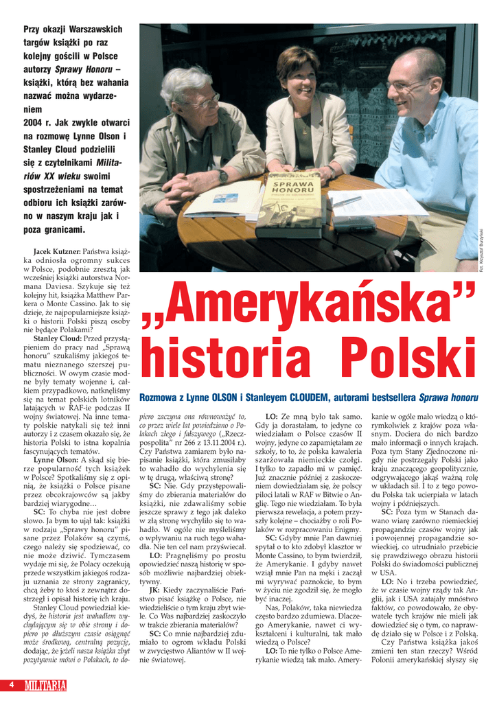 Jacek Kutzner: Pañstwa ksi¹¿ka odnios³a ogromny sukces w Polsce, podobnie zreszt¹ jak wczeœniej ksi¹¿ki autorstwa Normana Daviesa. Szykuje siê te¿ kolejny hit, ksi¹¿ka Matthew Parkera o Monte Cassino. Jak to siê dzieje, ¿e najpopularniejsze ksi¹¿ki o historii Polski pisz¹ osoby nie bêd¹ce Polakami? Stanley Cloud: Przed przyst¹pieniem do pracy nad „Spraw¹ honoru” szukaliœmy jakiegoœ tematu nieznanego szerszej publicznoœci. W owym czasie modne by³y tematy wojenne i, ca³kiem przypadkowo, natknêliœmy siê na temat polskich lotników lataj¹cych w RAF-ie podczas II wojny œwiatowej. Na inne tematy polskie natykali siê te¿ inni autorzy i z czasem okaza³o siê, ¿e historia Polski to istna kopalnia fascynuj¹cych tematów. Lynne Olson: A sk¹d siê bierze popularnoœæ tych ksi¹¿ek w Polsce? Spotkaliœmy siê z opini¹, ¿e ksi¹¿ki o Polsce pisane przez obcokrajowców s¹ jakby bardziej wiarygodne… SC: To chyba nie jest dobre s³owo. Ja bym to uj¹³ tak: ksi¹¿ki w rodzaju „Sprawy honoru” pisane przez Polaków s¹ czymœ, czego nale¿y siê spodziewaæ, co nie mo¿e dziwiæ. Tymczasem wydaje mi siê, ¿e Polacy oczekuj¹ przede wszystkim jakiegoœ rodzaju uznania ze strony zagranicy, chc¹ ¿eby to ktoœ z zewn¹trz dostrzeg³ i opisa³ historiê ich kraju. Stanley Cloud powiedzia³ kiedyœ, ¿e historia jest wahad³em wychylaj¹cym siê w obie strony i dopiero po d³u¿szym czasie osi¹gn¹æ mo¿e œrodkow¹, centraln¹ pozycjê, dodaj¹c, ¿e je¿eli nasza ksi¹¿ka zbyt pozytywnie mówi o Polakach, to do- 4 Fot. Krzysztof Burzyński Przy okazji Warszawskich targów ksi¹¿ki po raz kolejny goœcili w Polsce autorzy Sprawy Honoru – ksi¹¿ki, któr¹ bez wahania nazwaæ mo¿na wydarzeniem 2004 r. Jak zwykle otwarci na rozmowê Lynne Olson i Stanley Cloud podzielili siê z czytelnikami Militariów XX wieku swoimi spostrze¿eniami na temat odbioru ich ksi¹¿ki zarówno w naszym kraju jak i poza granicami. „Amerykañska” historia Polski Rozmowa z Lynne OLSON i Stanleyem CLOUDEM, autorami bestsellera Sprawa honoru piero zaczyna ona równowa¿yæ to, co przez wiele lat powiedziano o Polakach z³ego i fa³szywego („Rzeczpospolita” nr 266 z 13.11.2004 r.). Czy Pañstwa zamiarem by³o napisanie ksi¹¿ki, która zmusi³aby to wahad³o do wychylenia siê w tê drug¹, w³aœciw¹ stronê? SC: Nie. Gdy przystêpowaliœmy do zbierania materia³ów do ksi¹¿ki, nie zdawaliœmy sobie jeszcze sprawy z tego jak daleko w z³¹ stronê wychyli³o siê to wahad³o. W ogóle nie myœleliœmy o wp³ywaniu na ruch tego wahad³a. Nie ten cel nam przyœwieca³. LO: Pragnêliœmy po prostu opowiedzieæ nasz¹ historiê w sposób mo¿liwie najbardziej obiektywny. JK: Kiedy zaczynaliœcie Pañstwo pisaæ ksi¹¿kê o Polsce, nie wiedzieliœcie o tym kraju zbyt wiele. Co Was najbardziej zaskoczy³o w trakcie zbierania materia³ów? SC: Co mnie najbardziej zdumia³o to ogrom wk³adu Polski w zwyciêstwo Aliantów w II wojnie œwiatowej. LO: Ze mn¹ by³o tak samo. Gdy ja dorasta³am, to jedyne co wiedzia³am o Polsce czasów II wojny, jedyne co zapamiêta³am ze szko³y, to to, ¿e polska kawaleria szar¿owa³a niemieckie czo³gi. I tylko to zapad³o mi w pamiêæ. Ju¿ znacznie póŸniej z zaskoczeniem dowiedzia³am siê, ¿e polscy piloci latali w RAF w Bitwie o Angliê. Tego nie wiedzia³am. To by³a pierwsza rewelacja, a potem przysz³y kolejne – chocia¿by o roli Polaków w rozpracowaniu Enigmy. SC: Gdyby mnie Pan dawniej spyta³ o to kto zdoby³ klasztor w Monte Cassino, to bym twierdzi³, ¿e Amerykanie. I gdyby nawet wzi¹³ mnie Pan na mêki i zacz¹³ mi wyrywaæ paznokcie, to bym w ¿yciu nie zgodzi³ siê, ¿e mog³o byæ inaczej. Nas, Polaków, taka niewiedza czêsto bardzo zdumiewa. Dlaczego Amerykanie, nawet ci wykszta³ceni i kulturalni, tak ma³o wiedz¹ o Polsce? LO: To nie tylko o Polsce Amerykanie wiedz¹ tak ma³o. Amery- kanie w ogóle ma³o wiedz¹ o którymkolwiek z krajów poza w³asnym. Dociera do nich bardzo ma³o informacji o innych krajach. Poza tym Stany Zjednoczone nigdy nie postrzega³y Polski jako kraju znacz¹cego geopolitycznie, odgrywaj¹cego jak¹œ wa¿n¹ rolê w uk³adach si³. I to z tego powodu Polska tak ucierpia³a w latach wojny i póŸniejszych. SC: Poza tym w Stanach dawano wiarê zarówno niemieckiej propagandzie czasów wojny jak i powojennej propagandzie sowieckiej, co utrudnia³o przebicie siê prawdziwego obrazu historii Polski do œwiadomoœci publicznej w USA. LO: No i trzeba powiedzieæ, ¿e w czasie wojny rz¹dy tak Anglii, jak i USA zataja³y mnóstwo faktów, co powodowa³o, ¿e obywatele tych krajów nie mieli jak dowiedzieæ siê o tym, co naprawdê dzia³o siê w Polsce i z Polsk¹. Czy Pañstwa ksi¹¿ka jakoœ zmieni ten stan rzeczy? Wœród Polonii amerykañskiej s³yszy siê nia, na którymœ ze spotkañ z czytelnikami g³os zabra³ pewien wysokiej rangi polski urzêdnik – mniejsza o jego nazwisko – który oznajmi³, ¿e Polaków ta ksi¹¿ka nie zainteresuje, bo Polacy swoj¹ historiê ju¿ znaj¹. Spotkaliœmy tego cz³owieka ponownie w listopadzie ubieg³ego roku, ju¿ po ukazaniu siê polskiego t³umaczenia, na jakiejœ oficjalnej imprezie i tym razem opiniê mia³ ju¿ ca³kiem odmienn¹. Zachowywa³ siê jak gdyby nigdy przedtem nie wypowiada³ siê na temat Sprawy honoru (œmiech). Ca³kiem sporo ludzi zmieni³o swój pierwotny, sceptyczny stosunek do tej ksi¹¿ki. JK: Mieli Pañstwo okazjê uczestniczyæ w wielu spotkaniach z czytelnikami. Czy dowiedzieliœcie siê na tych spotkaniach czegoœ nowego? Czy dziœ chcieliby Pañstwo coœ w Waszej ksi¹¿ce zmieniæ, coœ uzupe³niæ, mo¿e coœ z niej wyrzuciæ? LO: Nie s¹dzê, byœmy cokolwiek chcieli zmieniaæ. Czasem zarzuca siê nam, ¿e Sprawa honoru to jakby dwie ksi¹¿ki w jednej oprawie – jedna traktuje o Dywizjonie 303, a druga o historii Polski. To prawda, ale nie wydaje mi siê, ¿eby tê ksi¹¿kê da³o siê napisaæ w 