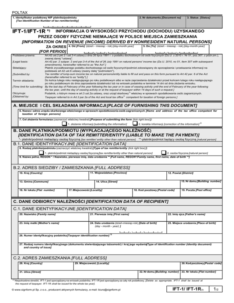 POLTAX 2. Nr dokumentu [Document no] 1. Identyfikator podatkowy NIP płatnika/podmiotu [Tax Identification Number of tax remitter/entity] 3. Status [Status] INFORMACJA O WYSOKOŚCI PRZYCHODU (DOCHODU) UZYSKANEGO PRZEZ OSOBY FIZYCZNE NIEMAJĄCE W POLSCE MIEJSCA ZAMIESZKANIA [INFORMATION ON REVENUE (INCOME) DERIVED BY NONRESIDENT NATURAL PERSONS] ZA OKRES [FOR PERIOD] 4. Od [From] (dzień - miesiąc - rok) [day-month-year] 5. Do [To] (dzień - miesiąc - rok) [day-month-year] Art.42 ust.2 pkt 2 i ust.3-4 ustawy z dnia 26 lipca 1991 r. o podatku dochodowym od osób fizycznych (Dz.U. z 2010 r. Nr 51, poz.307, z późn.zm.), zwanej danej "ustawą". [Legal basis: Art.42 par. 2 subpar. 2 and par.3-4 of the Act of 26 July 1991 on natural persons' income tax (Dz.U. 2010, no 51, item 307 with subsequent amendments), hereinafter referred to as "the Act".] Płatnik zryczałtowanego podatku dochodowego od osób fizycznych/podmiot zobowiązany do sporządzenia i przekazania informacji na Składający: podstawie art.42 ust.6 ustawy (zwany dalej "podmiotem"). Tax remitter of lump-sum income tax on natural persons/entity liable to fill out and pass on this form pursuant to Art.42 par. 6 of the Act [Submitted by: (hereinafter referred to as "entity").] Do końca lutego roku następującego po roku podatkowym albo w razie zaprzestania działalności przed końcem lutego roku następującego Termin składania: po roku podatkowym do dnia zaprzestania działalności lub na wniosek podatnika w terminie 14 dni od dnia złożenia wniosku. [Time limit for submitting: By the last day of February of the year following the tax year or in case of ceasing activity until the end of February of the year following the tax year, until the day of ceasing activity or at the request of taxpayer within 14 days of such a request.] 1) Otrzymuje: Podatnik, o którym mowa w art.3 ust.2a ustawy, oraz urząd skarbowy właściwy w sprawach opodatkowania osób zagranicznych. 1) [Obtained by: Taxpayer referred to in Art.3 par.2a of the Act and local tax office competent for taxation of foreign persons.] Podstawa prawna: A. MIEJSCE I CEL SKŁADANIA INFORMACJI [PLACE OF FURNISHING THIS DOCUMENT] 6. Nazwa i adres urzędu skarbowego właściwego w sprawach opodatkowania osób zagranicznych [Name and address of the tax office competent for taxation of foreign persons] 7. Cel złożenia formularza (zaznaczyć właściwy kwadrat) [Purpose of submitting the form (tick right box) ]: 1. złożenie informacji [submitting the information] 2. korekta informacji [correction of the information] 2) B. DANE PŁATNIKA/PODMIOTU (WYPŁACAJĄCEGO NALEŻNOŚĆ) [IDENTIFICATION DATA OF TAX REMITTER/ENTITY (LIABLE TO MAKE THE PAYMENT)] *- płatnik/podmiot niebędący osobą fizyczną [tax remitter/ entity other than natural person] **-płatnik/podmiot będący osobą fizyczną [natural person] B.1. DANE IDENTYFIKACYJNE [IDENTIFICATION DATA] 8. Rodzaj płatnika/podmiotu (zaznaczyć właściwy kwadrat) [Type of tax remitter/entity (tick right box) ]: 1. płatnik/podmiot niebędący osobą fizyczną [tax remitter/entity other than natural person] 2. osoba fizyczna [natural person] 9. Nazwa pełna, REGON * / Nazwisko, pierwsze imię, data urodzenia ** [Full name, REGON*/Family name, first name, date of birth **] B.2. ADRES SIEDZIBY / ZAMIESZKANIA [FULL ADDRESS] 10. Kraj [Country] 13. Gmina [Commune] 16. Nr lokalu [Flat number] 11. Województwo [Province] 12. Powiat [District] 15. Nr domu [Building number] 14. Ulica [Street] 17. Miejscowość [Locality] 18. Kod pocztowy [Postal code] 19. Poczta [Post office] C. DANE ODBIORCY NALEŻNOŚCI [IDENTIFICATION DATA OF RECIPIENT] C.1. DANE IDENTYFIKACYJNE [IDENTIFICATION DATA] 20. Nazwisko [Family name] 21. Pierwsze imię [First name] 22. Imię ojca [Father's name] 23. Imię matki [Mother's name] 24. Data urodzenia (dzień-miesiąc-rok) [Date of birth] (day - month - year) ] 25. Miejsce urodzenia [Place of birth] 26. Numer identyfikacyjny podatnika [Taxpayer identification number] 3) 27. Rodzaj numeru identyfikacyjnego (dokumentu stwierdzającego tożsamość) i kraj jego wydania[Type of identification number (identity document) and country of issue] C.2. ADRES ZAMIESZKANIA [FULL ADDRESS] 28. Kraj [Country] 29. Miejscowość [Locality] 31. Ulica [Street] 30. Kod pocztowy [Postal code] 32. Nr domu [Building number] 33. Nr lokalu [Flat number] *) Niepotrzebne skreślić. IFT-1 jest sporządzany na wniosek podatnika. IFT-1R jest sporządzany za cały rok podatkowy. [Delete as appropriate. IFT-1 shall be issued at the request of taxpayer. IFT-1R shall be issued for the whole tax year]. © www.signform.pl Sp. z o.o., producent aktywnych formularzy, e-mail: [email protected] IFT-1/ IFT-1R(9) 1/2 POLTAX D. RODZAJE PRZYCHODÓW (DOCHODÓW) I WYSOKOŚĆ POBRANEGO ZRYCZAŁTOWANEGO PODATKU [TYPE OF REVENUE (INCOME) AND AMOUNT OF TAX WITHHELD] 4) Symbol [Code] a b D.1 8 D.2 10 D.3 Kwota dochodu Kwota dochodu zwolnionego podlegającego z opodatkowania opodatkowaniu [Amount of income [Amount of taxable exempted from taxation] income] Rodzaj przychodu (dochodu) [Type of revenue (income)] c Dochody z żeglugi morskiej, żeglugi śródlądowej i transportu lotniczego [Income from shipping, inland waterways and transport] d Stawka podatku w% [Rate of tax %] e Kwota pobranego podatku [Amount of tax withheld] f g 34. 35. 36. 37. Dywidendy [Dividends] 38. 39. 40. 41. 11 Odsetki [Interest] 42. 43. 44. 45. D.4 12 Należności licencyjne [Royalties] 46. 47. 48. 49. D.5 14 50. 51. 52. 53. D.6 16 Dochód z wykonywania wolnych zawodów [Independent Personal Services] Wynagrodzenie dyrektorów [Directors' Fees] 54. 55. 56. 57. D.7 17 58. 59. 60. 61. D.8 18 62. 63. 64. 65. D.9 21 Dochód z działalności artystycznej lub sportowej [Artists and Sportsmen] Dochód z emerytury lub renty i innych podobnych świadczeń [Pension and other similar payments] Inne dochody [Other Income] 66. 67. 68. 69. 70. 71. 72. 73. D.10 99 Przychód określony zgodnie z ar