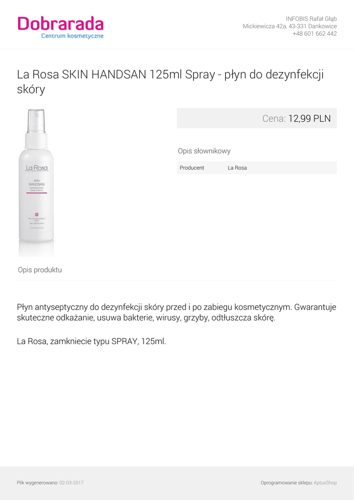 INFOBIS Rafał Głąb Mickiewicza 42a, 43-331 Dankowice +48 601 662 442 La Rosa SKIN HANDSAN 125ml Spray - płyn do dezynfekcji skóry Cena: 12,99 PLN Opis słownikowy Producent La Rosa Opis produktu Płyn antyseptyczny do dezynfekcji skóry przed i po zabiegu kosmetycznym. Gwarantuje skuteczne odkażanie, usuwa bakterie, wirusy, grzyby, odtłuszcza skórę. La Rosa, zamkniecie typu SPRAY, 125ml. Plik wygenerowano: 02-03-2017 Oprogramowanie sklepu: AptusShop INFOBIS Rafał Głąb Mickiewicza 42a, 43-331 Dankowice +48 601 662 442 Galeria Plik wygenerowano: 02-03-2017 Powered by TCPDF (www.tcpdf.org) Oprogramowanie sklepu: AptusShop