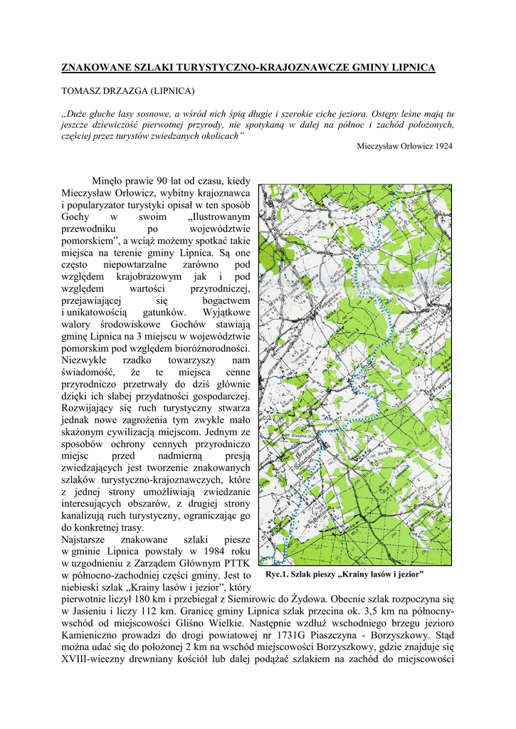 ZNAKOWANE SZLAKI TURYSTYCZNO-KRAJOZNAWCZE GMINY LIPNICA TOMASZ DRZAZGA (LIPNICA) „Duże głuche lasy sosnowe, a wśród nich śpią długie i szerokie ciche jeziora. Ostępy leśne mają tu jeszcze dziewiczość pierwotnej przyrody, nie spotykaną w dalej na północ i zachód położonych, częściej przez turystów zwiedzanych okolicach” Mieczysław Orłowicz 1924 Minęło prawie 90 lat od czasu, kiedy Mieczysław Orłowicz, wybitny krajoznawca i popularyzator turystyki opisał w ten sposób Gochy w swoim „Ilustrowanym przewodniku po województwie pomorskiem”, a wciąż możemy spotkać takie miejsca na terenie gminy Lipnica. Są one często niepowtarzalne zarówno pod względem krajobrazowym jak i pod względem wartości przyrodniczej, przejawiającej się bogactwem i unikatowością gatunków. Wyjątkowe walory środowiskowe Gochów stawiają gminę Lipnica na 3 miejscu w województwie pomorskim pod względem bioróżnorodności. Niezwykle rzadko towarzyszy nam świadomość, że te miejsca cenne przyrodniczo przetrwały do dziś głównie dzięki ich słabej przydatności gospodarczej. Rozwijający się ruch turystyczny stwarza jednak nowe zagrożenia tym zwykle mało skażonym cywilizacją miejscom. Jednym ze sposobów ochrony cennych przyrodniczo miejsc przed nadmierną presją zwiedzających jest tworzenie znakowanych szlaków turystyczno-krajoznawczych, które z jednej strony umożliwiają zwiedzanie interesujących obszarów, z drugiej strony kanalizują ruch turystyczny, ograniczając go do konkretnej trasy. Najstarsze znakowane szlaki piesze w gminie Lipnica powstały w 1984 roku w uzgodnieniu z Zarządem Głównym PTTK w północno-zachodniej części gminy. Jest to Ryc.1. Szlak pieszy „Krainy lasów i jezior” niebieski szlak „Krainy lasów i jezior”, który pierwotnie liczył 180 km i przebiegał z Siemirowic do Żydowa. Obecnie szlak rozpoczyna się w Jasieniu i liczy 112 km. Granicę gminy Lipnica szlak przecina ok. 3,5 km na północnywschód od miejscowości Gliśno Wielkie. Następnie wzdłuż wschodniego brzegu jezioro Kamieniczno prowadzi do drogi powiatowej nr 1731G Piaszczyna - Borzyszkowy. Stąd można udać się do położonej 2 km na wschód miejscowości Borzyszkowy, gdzie znajduje się XVIII-wieczny drewniany kościół lub dalej podążać szlakiem na zachód do miejscowości Łąkie, skąd okrążając od południa jezioro Wiejskie dotrzeć do Brzeźna Szlacheckiego, gdzie znajduje się drugi zachowany XVIII-wieczny drewniany kościół na Gochach. Z Brzeźna szlak prowadzi gminnymi drogami na zachód w kierunku miejscowości Pietrzykowo, leżącej już w gminie Koczała. Drugi znakowany szlak pieszy to 8 km czarny szlak łącznikowy. Łączy on wspomniany szlak „Krainy lasów i jezior” z 52 km żółtym szlakiem MiastkoPrzechlewo. Prowadzi on z Brzeźna na południe wzdłuż drogi powiatowej nr 1744G Brzeźno Szlacheckie - Bielsko do miejscowości Stara Brda Pilska. Do 2004 roku były to jedyne znakowane szlaki turystyczne na terenie gminy Lipnica. Tego roku otwarto ścieżkę dla rowerzystów o kaszubskiej nazwie „Kòłowe stegne Gochów”, czyli „Rowerowe ścieżki Gochów”. Jej powstanie finansował Powiatowy Urząd Pracy w ramach Ryc.2. „Rowerowe ścieżki Gochów” programu Gryf oraz Urząd Gminy Lipnica. Łącznie ścieżka rowerowa liczy 66 km. Jest doskonale oznaczona. W niedużych odstępach na trasie leżą znaki w formie kamieni ze strzałkami informującymi rowerzystów o kierunku jazdy. Oprócz tego są też tablice informacyjne o odległościach do poszczególnych wsi. Trasę poprowadzono głównie utwardzonymi gminnymi drogami gruntowymi, co wpływa na komfort jazdy. Zwiedzanie gminy rowerem można rozpocząć w Lipnicy, wybierając jeden z dwóch kierunków: wschodni, prowadzący w stronę Lubonia i Zapcenia, gdzie za miejscowością Hamer Młyn szlak łączy się ze ścieżkami rowerowymi na terenie gminy Studzienice oraz zachodni - umożliwiający objechanie dookoła polodowcowej rynny jezior Gwieździniec i Gwiazda, a także zwiedzenie miejscowości Prądzona, Brzeźno Szlacheckie, Borowy Młyn. Obie pętle łączy południowa trasa przebiegająca przez Wierzchocinę, Katarzynki, Upiłkę, Osusznicę i Mielno. W 2007 roku nauczyciele Zespołu Szkół w Brzeźnie Szlacheckim stworzyli ścieżkę edukacyjną "Atrakcje turystyczne okolic Brzeźna" prezentującą walory przyrodniczo-kulturowe tego terenu. Na ścieżce znajduje się 10 oznakowanych i opisanych stanowisk dydaktycznych. Ścieżka rozpoczyna się przy miejscowym Zespole Szkół. Następnie prowadzi wzdłuż zachodnich brzegów Jeziora Gwieździniec aż do wybudowania Brzeziński Młyn. Stąd drogami leśnymi i polnymi trasa prowadzi do wspomnianego powyżej pieszego czarnego szlaku łącznikowego, którego największą atrakcją jest aleja lipowa zasadzona w 250 rocznicę Odsieczy Wiedeńskiej oraz XVIII- Ryc.3. Ścieżka edukacyjna „Atrakcje wieczny drewniany kościół. Całkowity czas przejścia turystyczne okolic Brzeźna” ścieżki wynosi około 3 godzin. W 2008 roku w ramach projektu "Przyjazna Szkoła" uczniowie bytowskiego liceum wraz z opiekunami utworzyli na terenie gminy Lipnica 4 km ścieżkę przyrodniczą "Na szlaku kaszubskich jezior i bagien". Ścieżka rozpoczyna się około 3 km za miejscowością Borzyszkowy, w miejscu postoju nad Jeziorem Piaszno znajdującym się 500 metrów na południe od drogi powiatowej nr 1731G Piaszczyna - Borzyszkowy. Obejmuje sześć oznakowanych, tematycznych Ryc.4. Ścieżka przyrodnicza „Na szlaku kaszubskich przystanków umiejscowionych przy jezior i bagien” trzech jeziorach (Piaszno, Ostronek, Borzyszkowskie) oraz trzech torfowiskach (Diable Błotko, Bagno Zielone i Bagno Kampiste). Sieć znakowanych szlaków pieszych i rowerowych na terenie gminy uzupełniają szlaki kajakowe. Spływy odbywają się głównie na rzece Zbrzyca z dopływami Kłonecznica i Boryń oraz na rzece Chocina z dopływ