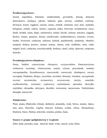 Środkowojęzykowe: Jesień, najeźdźca, kilometr, siedmiolatek, gwoździk, dzisiaj, dzięcioł, dzieciństwo, siedzący, jakość, ludność, gips, siewny, oziębiać, cielesny, dwieście, kisiel, ciągłość, sierota, ciasto, zielnik, ciśnienie, sieć, kiść, siedziba, kilogram, sielski, cukier, śmierć, ciąŜenie, kitka, Giewont, świadomość, ciecz, śledź, środek, ciąŜa, ślepy, ośmiornica, siekać, klosik, zielony, macierz, ciągnik, Kielce, zimny, ginięcie, dziura, niedźwiedź, siedmiodniowy, kimono, ćwierć, średni, kwiecień, cielęcina, siekiera, kielich, październik, niedziela, obudzić, sierpień, dzikus, jezioro, ziemia, sienny, ziarno, cień, siedlisko, ziele, ciało, magiel, kisić, ciełęcina, rozcieńczalnik, bodziec, nieść, cichy, śpiewać, cielęcina, dziecko. Przedniojęzykowo-dziąsłowe: Szary, budŜet, czeszczyzna, chrząszcz, oczyszczalnia, francuszczyzna, zwłaszcza, sczeznąć, włoszczyzna, szarŜa, czynsz, przystanek, szantaŜ, rzeczpospolita, Szczebrzeszyn, rzeczownik, czerwczyk, chrabąszcz, szczyt, szczupak, DŜakarta, drŜący, szczelina, szczebel, futrzany, trzaskać, szczypiorek, wyrzut, szczoteczka, szybkostrzelny, wczasowicz, sczernieć, częściowy, sczyszczony, zuŜyty, szaszłyk, uszkodzenie, sprzedaŜ, skrzydło, wjeŜdŜać, chrząstka, skrzypce, droŜdŜe, zrzeszenie, narzeczona, TadŜykistan, dŜungla, marzyciel. Zmiękczone: Piast, piana, Białystok, klimat, diabetyk, piramida, wiek, bitwa, miasto, lipiec, aria, pies, filozofia, wigilia, hiacynt, kobieta, widok, oficer, Monachium, biuletyn, biuro, Halina, telewidz, miedza, piołun, liana. Sonora w grupie spółgłoskowej w wyglosie: śubr, kadr, piosnka, teatr, latorośl, baśń, wiatr, umysł, rytm, blizn.