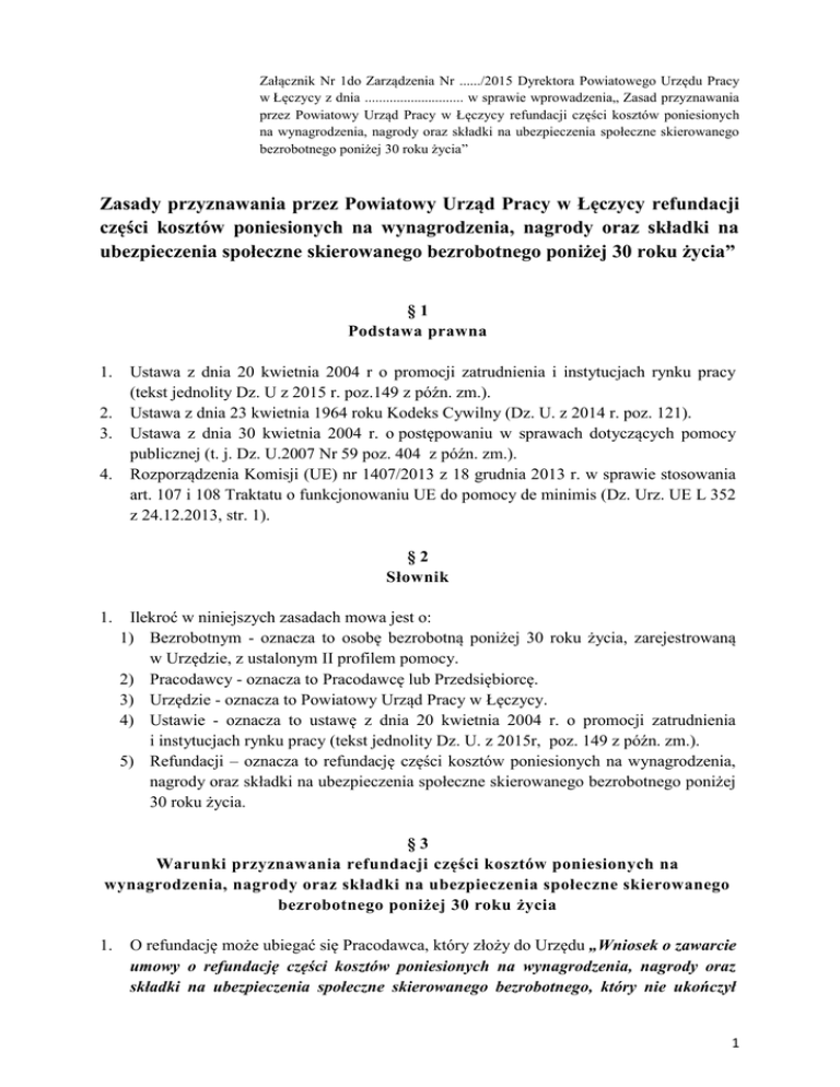 Załącznik Nr 1do Zarządzenia Nr ....../2015 Dyrektora Powiatowego Urzędu Pracy w Łęczycy z dnia ............................ w sprawie wprowadzenia„ Zasad przyznawania przez Powiatowy Urząd Pracy w Łęczycy refundacji części kosztów poniesionych na wynagrodzenia, nagrody oraz składki na ubezpieczenia społeczne skierowanego bezrobotnego poniżej 30 roku życia” Zasady przyznawania przez Powiatowy Urząd Pracy w Łęczycy refundacji części kosztów poniesionych na wynagrodzenia, nagrody oraz składki na ubezpieczenia społeczne skierowanego bezrobotnego poniżej 30 roku życia” §1 Podstawa prawna 1. 2. 3. 4. Ustawa z dnia 20 kwietnia 2004 r o promocji zatrudnienia i instytucjach rynku pracy (tekst jednolity Dz. U z 2015 r. poz.149 z późn. zm.). Ustawa z dnia 23 kwietnia 1964 roku Kodeks Cywilny (Dz. U. z 2014 r. poz. 121). Ustawa z dnia 30 kwietnia 2004 r. o postępowaniu w sprawach dotyczących pomocy publicznej (t. j. Dz. U.2007 Nr 59 poz. 404 z późn. zm.). Rozporządzenia Komisji (UE) nr 1407/2013 z 18 grudnia 2013 r. w sprawie stosowania art. 107 i 108 Traktatu o funkcjonowaniu UE do pomocy de minimis (Dz. Urz. UE L 352 z 24.12.2013, str. 1). §2 Słownik 1. Ilekroć w niniejszych zasadach mowa jest o: 1) Bezrobotnym - oznacza to osobę bezrobotną poniżej 30 roku życia, zarejestrowaną w Urzędzie, z ustalonym II profilem pomocy. 2) Pracodawcy - oznacza to Pracodawcę lub Przedsiębiorcę. 3) Urzędzie - oznacza to Powiatowy Urząd Pracy w Łęczycy. 4) Ustawie - oznacza to ustawę z dnia 20 kwietnia 2004 r. o promocji zatrudnienia i instytucjach rynku pracy (tekst jednolity Dz. U. z 2015r, poz. 149 z późn. zm.). 5) Refundacji – oznacza to refundację części kosztów poniesionych na wynagrodzenia, nagrody oraz składki na ubezpieczenia społeczne skierowanego bezrobotnego poniżej 30 roku życia. §3 Warunki przyznawania refundacji części kosztów poniesionych na wynagrodzenia, nagrody oraz składki na ubezpieczenia społeczne skierowanego bezrobotnego poniżej 30 roku życia 1. O refundację może ubiegać się Pracodawca, który złoży do Urzędu „Wniosek o zawarcie umowy o refundację części kosztów poniesionych na wynagrodzenia, nagrody oraz składki na ubezpieczenia społeczne skierowanego bezrobotnego, który nie ukończył 1 2. 3. 4. 5. 30 roku życia” wraz z wymaganymi załącznikami, którymi są: 1) Aktualny dokument poświadczający formę prawną istnienia firmy. 2) Dokument potwierdzający nadanie numeru NIP i REGON. 3) Formularz „.Informacji przedstawianych przy ubieganiu się o pomoc de minimis” (dotyczy Pracodawców będących beneficjentami pomocy publicznej w rozumieniu ustawy z dnia 30 kwietnia 2004 r. o postępowaniu w sprawach dotyczących pomocy publicznej (Dz. U. z 2007 r. Nr 59, poz. 404, z późn. zm.)) oraz zaświadczenia lub oświadczenia w zakresie, o którym mowa w art. 37 ust. 1 i 2 tej ustawy). 4) Oświadczenie Pracodawcy. 5) Świadectwo pracy oraz inne dokumenty poświadczające zmniejszenie zatrudnienia u Pracodawcy (jeśli takie nastąpiło w ciągu 6 miesięcy przed złożeniem „Wniosku....”. Refundacja jest udzielana zgodnie z warunkami dopuszczalności pomocy de minimis. Urząd Pracy w terminie 30 dni od dnia złożenia wniosku informuje Pracodawcę o rozpatrzeniu wniosku i podjętej decyzji. W przypadku gdy wniosek jest nieprawidłowo wypełniony lub niekompletny, Urząd Pracy wyznacza Pracodawcy co najmniej 7-dniowy termin na jego uzupełnienie. Wnioski nieuzupełnione we wskazanym terminie pozostawia się bez rozpatrzenia. Refundacja przekazywana jest przelewem na konto bankowe wskazane przez Pracodawcę we „Wniosku o zwrot części kosztów poniesionych na wynagrodzenia, nagrody i składki na ubezpieczenie społeczne za skierowanych bezrobotnych poniżej 30 roku życia” składanym przez Pracodawcę do Urzędu w terminie i na zasadach szczegółowo określonych w umowie pomiędzy Urzędem a Pracodawcą. Starosta nie może zawrzeć umowy o refundację z Pracodawcą, u którego w okresie ostatnich 6 miesięcy przed złożeniem wniosku nastąpiło zmniejszenie zatrudnienia z przyczyn dotyczących zakładu pracy. §4 Warunki umowy Umowa w sprawie przyznania refundacji zawiera: 1. Wysokość refundacji. 2. Okres refundacji. 3. Termin i sposób wypłaty środków Funduszu Pracy. 4. Obowiązki i konsekwencje dla Pracodawcy: 1) W przypadku nieutrzymania w zatrudnieniu w pełnym wymiarze czasu pracy przez okres, za który dokonywana jest refundacja oraz przez okres 12 miesięcy po zakończeniu tej refundacji Pracodawca jest obowiązany do zwrotu uzyskanej pomocy w kwocie proporcjonalnej do okresu, w którym nie utrzymał zatrudnienia skierowanej osoby, wraz z odsetkami ustawowymi naliczonymi od dnia otrzymania refundacji za pierwszy miesiąc, w terminie 30 dni od dnia doręczenia wezwania Urzędu. 2) W przypadku rozwiązania umowy o pracę przez skierowanego bezrobotnego, rozwiązania z nim umowy o pracę na podstawie art. 52 ustawy z dnia 26 czerwca 1974 r. – Kodeks pracy, lub wygaśnięcia stosunku pracy skierowanego bezrobotnego w trakcie okresu objętego refundacją albo przed upływem okresu 12 miesięcy po 2 zakończeniu refundacji, Urząd kieruje na zwolnione stanowisko pracy innego bezrobotnego. 3) W przypadku braku możliwości skierowania bezrobotnego przez urząd pracy na zwolnione stanowisko pracy w sytuacji określonej w § 4 ust. 4 pkt 2 „Zasad...” Pracodawca nie zwraca uzyskanej pomocy za okres, w którym uprzednio skierowany bezrobotny pozostawał w zatrudnieniu. 4) W przypadku odmowy przyjęcia skierowanego bezrobotnego na zwolnione stanowisko pracy, w sytuacji określonej w § 4 pkt 2 „Zasad ....” Pracodawca zwraca uzyskaną pomoc w kwocie proporcjonalnej do okresu, w którym nie utrzymał zatrudnienia skierowanej osoby, wraz z odsetkami ustawowymi naliczonymi od dnia otrzymania pierwszej refundacji, w terminie 30 dni od dnia doręczenia wezwania Urzędu. W ciągu 30 dni 