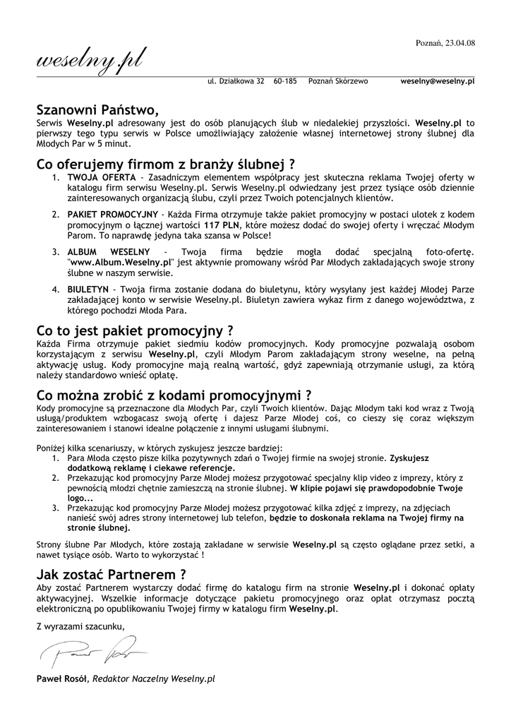 Poznań, 23.04.08 weselny.pl ul. Działkowa 32 60-185 Poznań Skórzewo [email protected] Szanowni Państwo, Serwis Weselny.pl adresowany jest do osób planujących ślub w niedalekiej przyszłości. Weselny.pl to pierwszy tego typu serwis w Polsce umożliwiający założenie własnej internetowej strony ślubnej dla Młodych Par w 5 minut. Co oferujemy firmom z branży ślubnej ? 1. TWOJA OFERTA - Zasadniczym elementem współpracy jest skuteczna reklama Twojej oferty w katalogu firm serwisu Weselny.pl. Serwis Weselny.pl odwiedzany jest przez tysiące osób dziennie zainteresowanych organizacją ślubu, czyli przez Twoich potencjalnych klientów. 2. PAKIET PROMOCYJNY - Każda Firma otrzymuje także pakiet promocyjny w postaci ulotek z kodem promocyjnym o łącznej wartości 117 PLN, które możesz dodać do swojej oferty i wręczać Młodym Parom. To naprawdę jedyna taka szansa w Polsce! 3. ALBUM WESELNY Twoja firma będzie mogła dodać specjalną foto-ofertę. "www.Album.Weselny.pl" jest aktywnie promowany wśród Par Młodych zakładających swoje strony ślubne w naszym serwisie. 4. BIULETYN - Twoja firma zostanie dodana do biuletynu, który wysyłany jest każdej Młodej Parze zakładającej konto w serwisie Weselny.pl. Biuletyn zawiera wykaz firm z danego województwa, z którego pochodzi Młoda Para. Co to jest pakiet promocyjny ? Każda Firma otrzymuje pakiet siedmiu kodów promocyjnych. Kody promocyjne pozwalają osobom korzystającym z serwisu Weselny.pl, czyli Młodym Parom zakładającym strony weselne, na pełną aktywację usług. Kody promocyjne mają realną wartość, gdyż zapewniają otrzymanie usługi, za którą należy standardowo wnieść opłatę. Co można zrobić z kodami promocyjnymi ? Kody promocyjne są przeznaczone dla Młodych Par, czyli Twoich klientów. Dając Młodym taki kod wraz z Twoją usługą/produktem wzbogacasz swoją ofertę i dajesz Parze Młodej coś, co cieszy się coraz większym zainteresowaniem i stanowi idealne połączenie z innymi usługami ślubnymi. Poniżej kilka scenariuszy, w których zyskujesz jeszcze bardziej: 1. Para Młoda często pisze kilka pozytywnych zdań o Twojej firmie na swojej stronie. Zyskujesz dodatkową reklamę i ciekawe referencje. 2. Przekazując kod promocyjny Parze Młodej możesz przygotować specjalny klip video z imprezy, który z pewnością młodzi chętnie zamieszczą na stronie ślubnej. W klipie pojawi się prawdopodobnie Twoje logo... 3. Przekazując kod promocyjny Parze Młodej możesz przygotować kilka zdjęć z imprezy, na zdjęciach nanieść swój adres strony internetowej lub telefon, będzie to doskonała reklama na Twojej firmy na stronie ślubnej. Strony ślubne Par Młodych, które zostają zakładane w serwisie Weselny.pl są często oglądane przez setki, a nawet tysiące osób. Warto to wykorzystać ! Jak zostać Partnerem ? Aby zostać Partnerem wystarczy dodać firmę do katalogu firm na stronie Weselny.pl i dokonać opłaty aktywacyjnej. Wszelkie informacje dotyczące pakietu promocyjnego oraz opłat otrzymasz pocztą elektroniczną po opublikowaniu Twojej firmy w katalogu firm Weselny.pl. Z wyrazami szacunku, Paweł Rosół, Redaktor Naczelny Weselny.pl