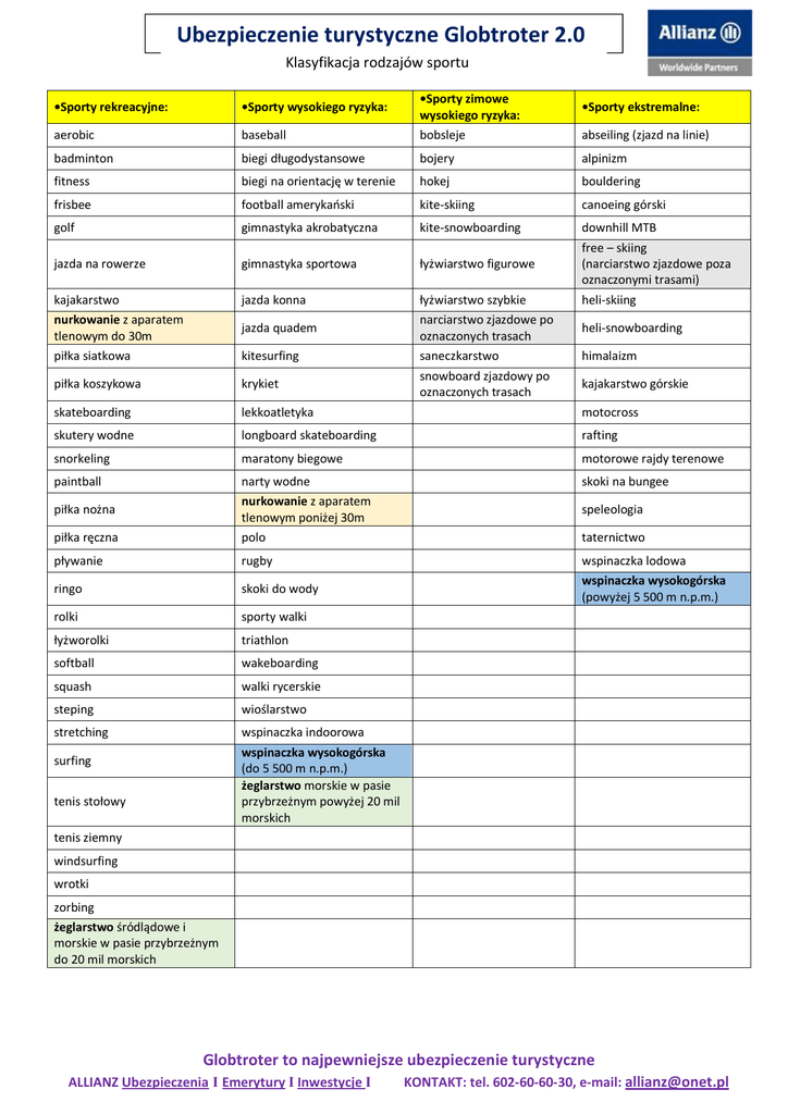 Ubezpieczenie turystyczne Globtroter 2.0 Klasyfikacja rodzajów sportu •Sporty rekreacyjne: •Sporty wysokiego ryzyka: •Sporty zimowe wysokiego ryzyka: •Sporty ekstremalne: aerobic baseball bobsleje abseiling (zjazd na linie) badminton biegi długodystansowe bojery alpinizm fitness biegi na orientację w terenie hokej bouldering frisbee football amerykański kite-skiing canoeing górski golf gimnastyka akrobatyczna kite-snowboarding downhill MTB jazda na rowerze gimnastyka sportowa łyżwiarstwo figurowe kajakarstwo nurkowanie z aparatem tlenowym do 30m piłka siatkowa jazda konna piłka koszykowa krykiet łyżwiarstwo szybkie narciarstwo zjazdowe po oznaczonych trasach saneczkarstwo snowboard zjazdowy po oznaczonych trasach skateboarding lekkoatletyka motocross skutery wodne longboard skateboarding rafting snorkeling maratony biegowe motorowe rajdy terenowe paintball skoki na bungee piłka ręczna narty wodne nurkowanie z aparatem tlenowym poniżej 30m polo pływanie rugby ringo skoki do wody wspinaczka lodowa wspinaczka wysokogórska (powyżej 5 500 m n.p.m.) rolki sporty walki łyżworolki triathlon softball wakeboarding squash walki rycerskie steping wioślarstwo stretching wspinaczka indoorowa wspinaczka wysokogórska (do 5 500 m n.p.m.) żeglarstwo morskie w pasie przybrzeżnym powyżej 20 mil morskich jazda quadem kitesurfing piłka nożna surfing tenis stołowy free – skiing (narciarstwo zjazdowe poza oznaczonymi trasami) heli-skiing heli-snowboarding himalaizm kajakarstwo górskie speleologia taternictwo tenis ziemny windsurfing wrotki zorbing żeglarstwo śródlądowe i morskie w pasie przybrzeżnym do 20 mil morskich Globtroter to najpewniejsze ubezpieczenie turystyczne ALLIANZ Ubezpieczenia I Emerytury I Inwestycje I KONTAKT: tel. 602-60-60-30, e-mail: [email protected]