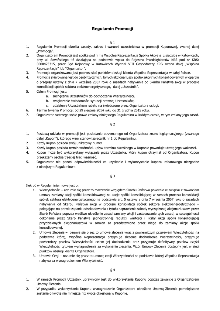 Regulamin Promocji 1. 2. 3. 4. 5. 6. 7. §1 Regulamin Promocji określa zasady, zakres i warunki uczestnictwa w promocji Kuponowej, zwanej dalej „Promocją”. Organizatorem Promocji jest spółka pod firmą Wspólna Reprezentacja Spółka Akcyjna z siedzibą w Katowicach, przy ul. Sowińskiego 46 działająca na podstawie wpisu do Rejestru Przedsiębiorców KRS pod nr KRS: 0000473315, przez Sąd Rejonowy w Katowicach Wydział VIII Gospodarczy KRS zwana dalej „Wspólna Reprezentacja” lub "Organizator". Promocja organizowana jest poprzez sieć punktów obsługi klienta Wspólna Reprezentacja w całej Polsce. Promocja skierowana jest do osób fizycznych, byłych akcjonariuszy spółek akcyjnych konsolidowanych w oparciu o przepisy ustawy z dnia 7 września 2007 roku o zasadach nabywania od Skarbu Państwa akcji w procesie konsolidacji spółek sektora elektroenergetycznego, dalej „Uczestnik”. Celem Promocji jest: a. zachęcenie Uczestników do dochodzenia Wierzytelności, b. zwiększenie świadomości sytuacji prawnej Uczestników, c. udzielenie Uczestnikom rabatu na świadczone przez Organizatora usługi. Termin trwania Promocji: od 29 sierpnia 2014 roku do 31 grudnia 2015 roku. Organizator zastrzega sobie prawo zmiany niniejszego Regulaminu w każdym czasie, w tym zmiany jego zasad. §2 1. 2. 3. 4. 5. Postawą udziału w promocji jest posiadanie otrzymanego od Organizatora znaku legitymacyjnego (zwanego dalej „Kupon”), którego wzór stanowi załącznik nr 1 do Regulaminu. Każdy Kupon posiada swój unikatowy numer. Każdy Kupon posiada termin ważności, upływ terminu określnego w Kuponie powoduje utratę jego ważności. Kupon może być wykorzystany wyłącznie przez Uczestnika, który kupon otrzymał od Organizatora. Kupon przekazany osobie trzeciej traci ważność. Organizator nie ponosi odpowiedzialności za uzyskanie i wykorzystanie kuponu rabatowego niezgodne z niniejszym Regulaminem. §3 Ilekroć w Regulaminie mowa jest o: 1. Wierzytelności – rozumie się przez to roszczenie względem Skarbu Państwa powstałe w związku z zawarciem umowy zamiany akcji spółki konsolidowanej na akcje spółki konsolidującej w ramach procesu konsolidacji spółek sektora elektroenergetycznego na podstawie art. 5 ustawy z dnia 7 września 2007 roku o zasadach nabywania od Skarbu Państwa akcji w procesie konsolidacji spółek sektora elektroenergetycznego – polegające na prawie żądania odszkodowania z tytułu naprawienia szkody wyrządzonej akcjonariuszowi przez Skarb Państwa poprzez wadliwe określenie zasad zamiany akcji i zastosowanie tych zasad, w szczególności dokonanie przez Skarb Państwa jednostronnej redukcji wartości i liczby akcji spółki konsolidującej przydzielonych akcjonariuszowi w zamian za przedstawione przez niego do zamiany akcje spółki konsolidowanej. 2. Umowie Zlecenia – rozumie się przez to umowę zlecenia wraz z powierniczym przelewem Wierzytelności na podstawie której, Wspólna Reprezentacja przyjmuje zlecenie dochodzenia Wierzytelności, przyjmuje powierniczy przelew Wierzytelności celem jej dochodzenia oraz przyjmuje definitywny przelew części Wierzytelności tytułem wynagrodzenia za wykonanie zlecenia. Wzór Umowy Zlecenia dostępny jest w sieci punktów obsługi klienta Organizatora. 3. Umowie Cesji – rozumie się przez to umowę cesji Wierzytelności na podstawie której Wspólna Reprezentacja nabywa za wynagrodzeniem Wierzytelność. §4 1. 2. W ramach Promocji Uczestnik uprawniony jest do wykorzystania Kuponu poprzez zawarcie z Organizatorem Umowy Zlecenia. W przypadku wykorzystania Kuponu wynagrodzenie Organizatora określone Umową Zlecenia pomniejszone zostanie o kwotę nie mniejszą niż kwota określoną w Kuponie. 3. 4. 5. Pomniejszenie wynagrodzenia, o którym mowa w ust. 2 skutkować będzie analogicznym wzrostem części Wierzytelności objętej umową Zlecenia, do dochodzenia której zobowiązuje się Wspólna Reprezentacja. Uczestnik może wykorzystać tylko jeden Kupon. Kupon nie może być wykorzystany do zawarcia umów z negocjowanym poziomem wynagrodzenia Organizatora. §5 1. 2. 3. 4. 5. W przypadku gdyby Uczestnik zrezygnował z wykorzystania Kuponu w sposób określony w § 3 Regulaminu uczestnik może zawrzeć Umowę Cesji. W przypadku zawarcia Umowy Cesji Uczestnik zbywa na rzecz Organizatora Wierzytelność, za wynagrodzeniem nie mniejszym niż kwota wskazana na Kuponie. W przypadku zawarcia Umowy Cesji uprawnienie z Kuponu wygasa. W opinii Organizatora zawarcie Umowy Cesji może być mniej korzystne dla Uczestnika niż zawarcie Umowy Zlecenia, przy czym do czasu zakończenia postępowań sądowych prowadzonych przez Organizatora jednoznaczna ocena skutków zawarcia obu wyżej wymienionych umów nie jest możliwa. Uczestnik zawierający Umowę Cesji oświadcza, że zapoznał się z pełną ofertą Organizatora w zakresie dochodzenia Wierzytelności. §6 1. 2. 3. Uczestnik ma prawo zgłosić pisemną reklamację związaną z realizacją Promocji na adres Organizatora, w terminie do 14 dni od zakończenia Promocji. Zgłoszenie powinno zawierać dane identyfikujące Uczestnika oraz wskazanie i dokładne uzasadnienie reklamacji. Organizator rozpatrzy reklamację w ciągu 14 dni od jej otrzymania. O swojej decyzji Organizator powiadomi Uczestnika pisemnie na adres wskazany w zgłoszeniu reklamacyjnym przez Uczestnika. §7 1. 2. 3. W Promocji nie mogą brać udziału pracownicy Organizatora ani członkowie ich najbliższej rodziny (małżonkowie, zstępni, wstępni, rodzeństwo, powinowaci do II stopnia oraz osoby pozostające z nimi w stosunku przysposobienia). Przez „pracowników” rozumie się również osoby wykonujące stale usługi na podstawie umowy cywilnoprawnej. Organizator może wykluczyć Uczestnika z udziału w Promocji, w przypadku gdy Uczestnik narusza postanowienia niniejszego Regulaminu. O fakcie wykluczenia z Promocji Uczestnik zostanie poinformowany w formie pisemnej. Organizator nie po