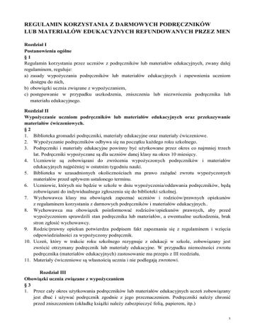 REGULAMIN KORZYSTANIA Z DARMOWYCH PODRĘCZNIKÓW LUB MATERIAŁÓW EDUKACYJNYCH REFUNDOWANYCH PRZEZ MEN Rozdział I Postanowienia ogólne §1 Regulamin korzystania przez uczniów z podręczników lub materiałów edukacyjnych, zwany dalej regulaminem, reguluje: a) zasady wypożyczania podręczników lub materiałów edukacyjnych i zapewnienia uczniom dostępu do nich, b) obowiązki ucznia związane z wypożyczaniem, c) postępowanie w przypadku uszkodzenia, zniszczenia lub niezwrócenia podręcznika lub materiału edukacyjnego. Rozdział II Wypożyczanie uczniom podręczników lub materiałów edukacyjnych oraz przekazywanie materiałów ćwiczeniowych. §2 1. Biblioteka gromadzi podręczniki, materiały edukacyjne oraz materiały ćwiczeniowe. 2. Wypożyczanie podręczników odbywa się na początku każdego roku szkolnego. 3. Podręczniki i materiały edukacyjne powinny być użytkowane przez okres co najmniej trzech lat. Podręczniki wypożyczane są dla uczniów danej klasy na okres 10 miesięcy. 4. Uczniowie są zobowiązani do zwrócenia wypożyczonych podręczników i materiałów edukacyjnych najpóźniej w ostatnim tygodniu nauki. 5. Biblioteka w uzasadnionych okolicznościach ma prawo zażądać zwrotu wypożyczonych materiałów przed upływem ustalonego terminu. 6. Uczniowie, których nie będzie w szkole w dniu wypożyczenia/oddawania podręczników, będą zobowiązani do indywidualnego zgłoszenia się do biblioteki szkolnej. 7. Wychowawca klasy ma obowiązek zapoznać uczniów i rodziców/prawnych opiekunów z regulaminem korzystania z darmowych podręczników i materiałów edukacyjnych.. 8. Wychowawca ma obowiązek poinformować rodziców/opiekunów prawnych, aby przed wypożyczeniem sprawdzili stan podręcznika lub materiałów, a ewentualne uszkodzenia, brak stron zgłosić wychowawcy. 9. Rodzic/prawny opiekun potwierdza podpisem fakt zapoznania się z regulaminem i wzięcia odpowiedzialności za wypożyczony podręcznik. 10. Uczeń, który w trakcie roku szkolnego rezygnuje z edukacji w szkole, zobowiązany jest zwrócić otrzymany podręcznik lub materiały edukacyjne. W przypadku niemożności zwrotu podręcznika (materiałów edukacyjnych) zastosowanie ma przepis z III rozdziału. 11. Materiały ćwiczeniowe są własnością ucznia i nie podlegają zwrotowi. Rozdział III Obowiązki ucznia związane z wypożyczaniem §3 1. Przez cały okres użytkowania podręczników lub materiałów edukacyjnych uczeń zobowiązany jest dbać i używać podręcznik zgodnie z jego przeznaczeniem. Podręczniki należy chronić przed zniszczeniem (okładkę książki należy zabezpieczyć folią, papierem, itp.) 1 2. 3. Zabrania się dokonywania jakichkolwiek wpisów i notatek w podręcznikach i materiałach edukacyjnych. Jedynie dopuszczalne jest używanie ołówka w celu zaznaczenia pracy domowej. Przed zwrotem książek uczeń powinien usunąć wszystkie wpisy dokonane ołówkiem. Z wypożyczonych podręczników i materiałów edukacyjnych uczeń może korzystać w domu. Rozdział IV Postępowanie w przypadku uszkodzenia, zniszczenia lub niezwrócenia w terminie podręcznika lub materiału edukacyjnego §4 1. Uczeń/rodzic/opiekun prawny ponosi pełną odpowiedzialność materialną za wszelkie uszkodzenia lub zniszczenia podręczników. 2. W przypadku uszkodzenia, zagubienia lub zniszczenia podręcznika, szkoła może żądać od rodzica/prawnego opiekuna ucznia poniesienia odpowiedzialności finansowej (na podst. Art. 22 ak ust.3 i 4 Ustawy o Systemie Oświaty). Wartość podręcznika lub materiału edukacyjnego zgodna z fakturą zakupu (w bibliotece szkolnej). 3. Przez uszkodzenie podręcznika lub materiału edukacyjnego rozumie się działanie, które powoduje pomniejszenie wartości użytkowej podręcznika lub materiału edukacyjnego (np. zabrudzenie, poplamienie, popisanie, zgniecenie, rozerwanie), ale możliwe jest usunięcie skutków tych naruszeń. Na żądanie bibliotekarza uczeń, który doprowadził do uszkodzenia, zobowiązany jest podręcznik lub materiał edukacyjny naprawić. 4. Przez zniszczenie podręcznika lub materiału edukacyjnego rozumie się działanie, które uniemożliwia dalsze ich wykorzystanie, a usunięcie skutków naruszeń jest niemożliwe (np. trwałe poplamienie, trwałe zabrudzenie, rozerwanie, wyrwanie, zagubienie kartek). §5 1. W celu uzyskania od rodziców kosztu uszkodzonych, zniszczonych lub niezwróconych podręczników i materiałów edukacyjnych wychowawca powiadamia rodzica/opiekuna prawnego o konieczności odkupienia w/w książki. 2. Jeżeli do podręcznika lub materiału edukacyjnego była dołączona płyta CD/DVD, mapy, plansze, itp., należy je zwrócić wraz z podręcznikiem lub materiałem edukacyjnym. Zagubienie płyty CD skutkuje koniecznością zwrotu całego podręcznika lub materiałów edukacyjnych. Rozdział V Postanowienia końcowe §6 1. Uczniowie i rodzice zobowiązani są do zapoznania się z treścią niniejszego Regulaminu i stosowania się do zawartych w nim postanowień. 2. Bibliotekarze zobowiązani są do udostępniania uczniom i rodzicom Regulaminu biblioteki na każde ich życzenie. 3. Decyzje w innych kwestiach z zakresu udostępniania podręczników lub materiałów edukacyjnych, które nie zostały ujęte w niniejszym regulaminie, podejmuje Dyrektor szkoły. 4. Regulamin wchodzi w życie z dniem 1 września 2015r. 2 Gdańsk, dnia……………. OŚWIADCZENIE Przyjmuję do wiadomości postanowienia powyższego regulaminu. Biorę na siebie pełną odpowiedzialność finansową za wypożyczone przez córkę/syna podręczniki będące własnością biblioteki Szkoły Podstawowej nr 1 im. M. Zaruskiego w Gdańsku. l.p Imię nazwisko ucznia/uczennicy Podpis rodzica/opiekuna prawnego Uwagi 1. 2. 3. 4. 5. 6. 7. 8. 9. 10. 11. 12. 13. 14. 15. 16. 17. 18. 19. 20. 21. 22. 23. 24. 25. 26. 27. 28. 3