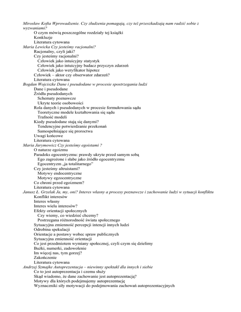 Mirosław Kofta Wprowadzenie. Czy złudzenia pomagają, czy też przeszkadzają nam radzić sobie z wyzwaniami? O czym mówią poszczególne rozdziały tej książki Konkluzje Literatura cytowana Maria Lewicka Czy jesteśmy racjonalni? Racjonalny, czyli jaki? Czy jesteśmy racjonalni? Człowiek jako intuicyjny statystyk Człowiek jako intuicyjny badacz przyczyn zdarzeń Człowiek jako weryfikator hipotez Człowiek – aktor czy obserwator zdarzeń? Literatura cytowana Bogdan Wojciszke Dane i pseudodane w procesie spostrzegania ludzi Dane i pseudodane Źródła pseudodanych Schematy poznawcze Ukryte teorie osobowości Rola danych i pseudodanych w procesie formułowania sądu Teoretyczne modele kształtowania się sądu Trafność modeli Kiedy pseudodane stają się danymi? Tendencyjne potwierdzanie przekonań Samospełniające się proroctwa Uwagi końcowe Literatura cytowana Maria Jarymowicz Czy jesteśmy egoistami ? O naturze egoizmu Paradoks egocentryzmu: prawdy ukryte przed samym sobą Ego zagrożone i słabe jako źródło egocentryzmu Egocentryzm „ja totalitarnego” Czy jesteśmy altruistami? Motywy endocentryczne Motywy egzocentryczne Co chroni przed egoizmem? Literatura cytowana Janusz Ł. Grzelak Ja, my, oni? Interes własny a procesy poznawcze i zachowanie ludzi w sytuacji konfliktu Konflikt interesów Interes własny Interes wielu interesów? Efekty orientacji społecznych Czy wiemy, co wiedzieć chcemy? Postrzegana różnorodność świata społecznego Sytuacyjna zmienność percepcji intencji innych ludzi Odrobina spekulacji Orientacje a postawy wobec spraw publicznych Sytuacyjna zmienność orientacji Co jest przedmiotem wymiany społecznej, czyli czym się dzielimy Buźki, numerki, zadowolenie Im więcej nas, tym gorzej? Zakończenie Literatura cytowana Andrzej Szmajke Autoprezentacja – niewinny spektakl dla innych i siebie Co to jest autoprezentacja i czemu służy Skąd wiadomo, że dane zachowanie jest autoprezentacją? Motywy dla których podejmujemy autoprezentację Wyznaczniki siły motywacji do podejmowania zachowań autoprezentacyjnych Przydatność odpowiedniego wizerunku własnej osoby do osiągania pożądanych celów społecznych Subiektywna wartość celów społecznych Rozbieżność między aktualną impresją a impresją pożądaną Strategie autoprezentacji - najpopularniejsze wizerunki autoprezentacyjne Taksonomia Jonesa i Pittman Taksonomia zachowań autoprezentacyjnych Schutz Co decyduje o stylu autoprezentacji podejmowanej przez jednostkę Samowiedza Wyobrażenie tożsamości pożądanej i niepożądanej Wymagania roli społecznej Spostrzegane oczekiwania widowni Aktualne i rzeczywiste oraz przyszłe i potencjalne konsekwencje publicznego wizerunku Autoprezentacje negatywne Formy autoprezentacji – różne sposoby kreowania publicznych wizerunków Autoprezentacja pośrednia: „pławienie się w cudzej chwale” Autoprezentacja „wprost” i „niewprost” Powszechność autoprezentacji Prawdziwe „ja” a autoprezentacja Literatura cytowana Helena Grzegołowska-Klarkowska Samoobrona przez samooszukiwanie się Dlaczego ludzie oszukują samych siebie? Koncepcje psychoanalityczne Inne koncepcje psychicznej samoobrony przez samooszukiwanie się: obrona poprzez ucieczkę od własnego prawdziwego „ja” Rola i narzędzia samoobrony. Wybrane przejawy samooszukiwania się Wybrane badania nad mechanizmami obronnymi Nie wiedzą czy nie chcą powiedzieć? Czy wyparcie istnieje? Co uruchamia mechanizmy obronne? Skuteczność samooszukiwania się jako środka samoobrony psychicznej Literatura cytowana Mirosław Kofta Poczucie kontroli, złudzenia na temat siebie, a adaptacja psychologiczna Czy człowiek ma potrzebę sprawstwa? Badania nad wolnością wyboru Badania nad percepcją wpływu na bieg wydarzeń Czynniki wpływające na percepcję kontroli Czy ocena własnego sprawstwa jest realistyczna? Iluzja kontroli Egotyzm atrybucyjny Racjonalizacja zdarzeń negatywnych Myślenie życzeniowe przy planowaniu działań Skąd bierze się „chciejstwo” Czy podmiotowa kontrola służy adaptacji? Badanie Schultza: podmiotowa kontrola a przystosowanie psychiczne u osób starszych Podmiotowa kontrola a adaptacja: mechanizmy psychologiczne Orientacja na działanie a poczucie kontroli Samoodradzanie się poczucia kontroli Osobowościowe wyznaczniki poczucia kontroli i samoodradzania się Styl eksplanacyjny Naiwne teorie inteligencji Siła woli Wnioski Literatura cytowana Grzegorz Sędek Jak ludzie radzą sobie z sytuacjami, na które nie ma rady? Niekontrolowalność w postaci nagłych, nieoczekiwanych i traumatycznych zdarzeń Model Klingera Model Shontza Model Taylor Negatywne konsekwencje długotrwałych intensywnych prób wpływania na obiektywnie niemodyfikowalne sytuacje Klasyczne doświadczenia laboratoryjne nad reakcjami zwierząt na niekontrolowane wzmocnienia Koncepcja Weissa Pierwotny model wyuczonej bezradności Seligmana Krytyczna analiza modelu egotystycznego Informacyjny model bezradności Wnioski, konkluzje... i trochę spekulacji Literatura cytowana Dariusz Doliński Pozytywna rola negatywnych złudzeń Optymalny margines iluzji, czyli co za dużo to nie zdrowo Negatywne iluzje Kiedy negatywne iluzje pozwalają (dobrze) żyć? Literatura cytowana Janusz Czapiński Szczęście – złudzenie czy konieczność? Cebulowa teoria szczęścia w świetle nowych danych empirycznych Pojęcie szczęścia we współczesnej psychologii empirycznej Źródła poczucia szczęścia Warunki życia a szczęście Osobowość i temperament Czynniki fizyczne i biologiczne Podsumowanie Po co ludziom poczucie szczęścia? Powszechność poczucia szczęścia Efekt negatywności Efekt feniksa Strategie i mechanizmy radzenia sobie ze stresem Asymetria mózgowych ośrodków afektu pozytywnego i negatywnego Mechanizmy pamięci Endogenny mechanizm znieczulający Naturalne procesy adaptacji Porównania społeczne Zmiana tożsamości Atrybucja przyczynowa czyli niewdzięczne s
