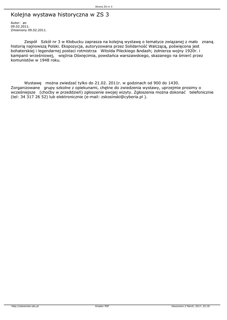 Strona ZS nr 3 Kolejna wystawa historyczna w ZS 3 Autor: an 09.02.2011. Zmieniony 09.02.2011. Zespół Szkół nr 3 w Kłobucku zaprasza na kolejną wystawę o tematyce związanej z mało znaną historią najnowszą Polski. Ekspozycja, autoryzowana przez Solidarność Walczącą, poświęcona jest bohaterskiej i legendarnej postaci rotmistrza Witolda Pileckiego – żołnierza wojny 1920r. i kampanii wrześniowej, więźnia Oświęcimia, powstańca warszawskiego, skazanego na śmierć przez komunistów w 1948 roku. Wystawę można zwiedzać tylko do 21.02. 2011r. w godzinach od 900 do 1430. Zorganizowane grupy szkolne z opiekunami, chętne do zwiedzenia wystawy, uprzejmie prosimy o wcześniejsze (choćby w przeddzień) zgłoszenie swojej wizyty. Zgłoszenia można dokonać telefonicznie (tel: 34 317 26 52) lub elektronicznie (e-mail: [email protected] ). http://zskosinski.edu.pl Kreator PDF Utworzono 2 March, 2017, 22:18
