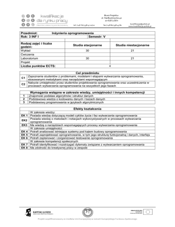Przedmiot: Inżynieria oprogramowania Rok: 3 INF I Semestr: V