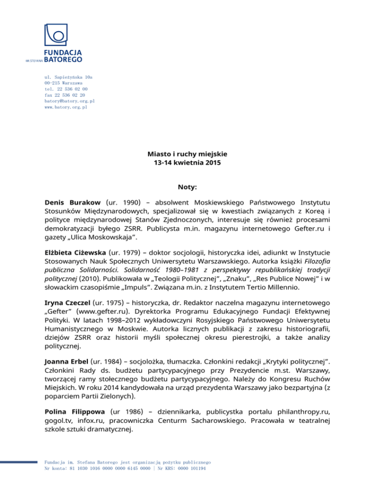 ul. Sapieżyńska 10a 00-215 Warszawa tel. 22 536 02 00 fax 22 536 02 20 [email protected] www.batory.org.pl Miasto i ruchy miejskie 13-14 kwietnia 2015 Noty: Denis Burakow (ur. 1990) – absolwent Moskiewskiego Państwowego Instytutu Stosunków Międzynarodowych, specjalizował się w kwestiach związanych z Koreą i polityce międzynarodowej Stanów Zjednoczonych, interesuje się również procesami demokratyzacji byłego ZSRR. Publicysta m.in. magazynu internetowego Gefter.ru i gazety „Ulica Moskowskaja”. Elżbieta Ciżewska (ur. 1979) – doktor socjologii, historyczka idei, adiunkt w Instytucie Stosowanych Nauk Społecznych Uniwersytetu Warszawskiego. Autorka książki Filozofia publiczna Solidarności. Solidarność 1980–1981 z perspektywy republikańskiej tradycji politycznej (2010). Publikowała w „Teologii Politycznej”, „Znaku”, „Res Publice Nowej” i w słowackim czasopiśmie „Impuls”. Związana m.in. z Instytutem Tertio Millennio. Iryna Czeczel (ur. 1975) – historyczka, dr. Redaktor naczelna magazynu internetowego „Gefter” (www.gefter.ru). Dyrektorka Programu Edukacyjnego Fundacji Efektywnej Polityki. W latach 1998–2012 wykładowczyni Rosyjskiego Państwowego Uniwersytetu Humanistycznego w Moskwie. Autorka licznych publikacji z zakresu historiografii, dziejów ZSRR oraz historii myśli społecznej okresu pierestrojki, a także analizy politycznej. Joanna Erbel (ur. 1984) – socjolożka, tłumaczka. Członkini redakcji „Krytyki politycznej”. Członkini Rady ds. budżetu partycypacyjnego przy Prezydencie m.st. Warszawy, tworzącej ramy stołecznego budżetu partycypacyjnego. Należy do Kongresu Ruchów Miejskich. W roku 2014 kandydowała na urząd prezydenta Warszawy jako bezpartyjna (z poparciem Partii Zielonych). Polina Filippowa (ur 1986) – dziennikarka, publicystka portalu philanthropy.ru, gogol.tv, infox.ru, pracowniczka Centurm Sacharowskiego. Pracowała w teatralnej szkole sztuki dramatycznej. Fundacja im. Stefana Batorego jest organizacją pożytku publicznego Nr konta: 81 1030 1016 0000 0000 6145 0000 | Nr KRS: 0000 101194 Michaił Fiszman (ur. 1972) – filolog, dziennikarz, redaktor naczelny „Slon.ru”. Były redaktor naczelny rosyjskiego wydania „Newsweeka”. Prowadził autorski program „I tak dalej” w TV Dożd, redaktor portalu informacyjnego „Cityboom”, publicysta „Forbes” a także „Die Welt” i „Wiedomosti”. Pracował również w radiu „Echo Moskwy”, „Kommiersant”, „Itogi”, „Gazeta.ru”, felietonista internetowego wydania „Polit.ru”. Łukasz Jasina (ur. 1980) – historyk, publicysta, komentator. Doktoryzował się w Instytucie Sztuki PAN. Szef Działu Wschodniego zespołu „Kultury Liberalnej”. redaktor prowadzący "Newsweeka Historia", pracownik Muzeum Historii Polski ,Współpracownik Harvard Ukrainian Research Institute. Specjalizuje się w historii filmu brytyjskiego i radzieckiego oraz analizie współczesnych procesów kulturowych na obszarze postradzieckim. Leszek Jażdżewski (ur. 1982) – współzałożyciel i redaktor naczelny „LIBERTE!”. Politolog, publicysta. Stały felietonista tygodnika „Wprost”. Działacz społeczny, wiceprzewodniczący Forum Liberalnego, sekretarz Towarzystwa Integracji Transportu, członek rady Fundacji Projekt: Polska, członek European Convention of Liberal Democracy. Publikował m.in. w „Gazecie Wyborczej” „Newsweek”, i „Rzeczpospolitej”. Łukasz Jurczyszyn (ur. 1980) – socjolog, dr. Pracownik Centrum Badań Solidarności i Ruchów Społecznych Instytutu Socjologii UW. Współzałożyciel Zespołu Analizy Ruchów Społecznych. Członek Centrum Analizy i Interwencji Socjologicznych i Centrum Badań Wschodnich w Paryżu, gdzie realizuje projekt Understanding Violence in Russia. Rafał Kalukin (ur. 1974) – dziennikarz i komentator polityczny. Studiował psychologię, pracował w „Głosie Wybrzeża”, „Gazecie Gdańskiej”, „Gazecie Wyborczej (Duży Format)”, we „Wprost” i obecnie w „Newsweeku”. Paweł Kazarin (ur. 1983) – dziennikarz i publicysta. Stały współpracownik portalu „Slon.ru” oraz Agencji Informacyjnej Rosbałt, a także tygodnika „The New Times” i Radia Swoboda. Specjalizuje się w analizie politycznej krajów b. ZSRR, a także stosunków ukraińsko-rosyjskich. Współpracuje z wieloma ukraińskimi mediami. Urodził się i wychował w Symferopolu na Krymie. Od dwóch lat mieszka i pracuje w Moskwie. Dominika Kozłowska (ur. 1978) – redaktorka naczelna miesięcznika „Znak”, filozofka, dr. Związana ze środowiskiem uczniów i przyjaciół ks. Józefa Tischnera skupionych wokół Instytutu Myśli Józefa Tischnera. Wcześniej była redaktorką naczelną „Thinking in Values”. Magdalena Kubecka (ur. 1985) - kulturoznawczyni, blogerka. Doktorantka w Instytucie Stosowanych Nauk Społecznych. Była członkini zarządu Towarzystwa Inicjatyw Twórczych „ę”, uczestniczka sieci Latających Animatorów Kultury, współpracuje z Fundacją „Na Miejscu”. Publikuje teksty m.in. w „Res Publice Nowej”, „Małej Kulturze Współczesnej”. Bada uwarunkowaniami rozwoju kultury w średnich miastach w Polsce. Aleksander Kyniew (ur. 1975) – politolog, działacz pozarządowy, docent Wyższej Szkoły Ekonomiki. Od 2004 roku dyrektor Programu Regionalnego w Fundacji Rozwoju Polityki Informacyjnej. W latach 2006-2012 kierował zespołem analityków rosyjskiego Stowarzyszenia GOŁOS. W latach 1999-2001 działacz partii Jabłoko. Autor wielu publikacji dotyczących systemu partyjnego w Rosji, rosyjskich partii politycznych, rosyjskiego społeczeństwa i wyborów. Mariusz Libel (ur. 1978) – współtwórca projektu czy.sciec.pl, współzałożyciel grupy Twożywo (1995 – 2011) obecnej w przestrzeni miejskiej w formie szablonów, murali, vlepek, billboardów i plakatów z pogranicza poezji konceptualnej, opartych na typograficznych grach słownych. prac Twożywo stworzyło także rów