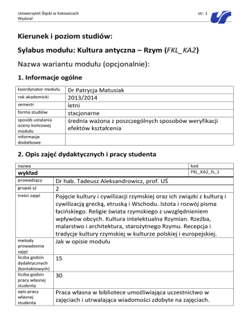 Uniwersytet Śląski w Katowicach Wydział str. 1 Kierunek i poziom studiów: Sylabus modułu: Kultura antyczna – Rzym (FKL_KA2) Nazwa wariantu modułu (opcjonalnie): 1. Informacje ogólne koordynator modułu rok akademicki semestr forma studiów sposób ustalania oceny końcowej modułu informacje dodatkowe Dr Patrycja Matusiak 2013/2014 letni stacjonarne średnia ważona z poszczególnych sposobów weryfikacji efektów kształcenia 2. Opis zajęć dydaktycznych i pracy studenta nazwa kod FKL_KA2_fs_1 wykład prowadzący grupa(-y) treści zajęć metody prowadzenia zajęć liczba godzin dydaktycznych (kontaktowych) liczba godzin pracy własnej studenta opis pracy własnej studenta Dr hab. Tadeusz Aleksandrowicz, prof. UŚ 2 Pojęcie kultury i cywilizacji rzymskiej oraz ich związki z kulturą i cywilizacją grecką, etruską i Wschodu. Istota i rozwój pisma łacińskiego. Religie świata rzymskiego z uwzględnieniem wpływów obcych. Kultura intelektualna Rzymian. Rzeźba, malarstwo i architektura, starożytnego Rzymu. Recepcja i tradycje kultury rzymskiej w kulturze polskiej i europejskiej. Jak w opisie modułu 15 30 Praca własna w bibliotece umożliwiająca uczestnictwo w zajęciach i utrwalająca wiadomości zdobyte na zajęciach. Uniwersytet Śląski w Katowicach Wydział organizacja zajęć literatura obowiązkowa literatura uzupełniająca adres strony www zajęć informacje dodatkowe nazwa ćwiczenia prowadzący grupa(-y) treści zajęć metody prowadzenia zajęć str. 2 Zajęcia odbywają się raz w tygodniu przez godzinę. Terminy i sale zgodnie z harmonogramem zajęć. K. Kumaniecki, Historia kultury starożytnej Grecji i Rzymu, Warszawa 1978 [i nowsze]; G. Serba (ed.) Rzym i my. Wprowadzenie do literatury i kultury łacińskiej, przetłum. z franc. I. Lewandowski, W. M. Malinowski, Poznań 2009; S. Stabryła, Zarys kultury starożytnej Grecji i Rzymu, Warszawa 2007; M. Streeter, Śródziemnomorska kolebka kultury europejskiej, tłum. J. Sikora, Warszawa 2007; D. Diringer, Alfabet, czyli klucz do dziejów ludzkości, przeł. W. Hensel, Warszawa 1972; A. Gieysztor, Zarys dziejów pisma łacińskiego, Warszawa 2009; M. Eliade, Historia wierzeń i idei religijnych, t. 1–2, Warszawa 1988–1994; M. Jaczynowska, Religie świata rzymskiego, Warszawa 1987; Marrou H.-I., Historia wychowania w starożytności, przeł. S. Łoś, Warszawa 1969; J. Korpanty, Humanitas Romana, w: idem, Rzeczpospolita potomków Romulusa. Ludzie – wydarzenia – idee, Warszawa 1979; M. Kuryłowicz, Historia i współczesność prawa rzymskiego, Lublin 1984; A. Sadurska, Archeologia starożytnego Rzymu, t. 1–2, Warszawa 1975–1980; G. Charles-Picard, Sztuka rzymska, przeł. K. Gawlikowska, Warszawa 1975; M. Nowicka, Malarstwo antyczne. Zarys, Warszawa 1985; J. A. Ostrowski, Starożytny Rzym. Polityka i sztuka, Warszawa–Kraków 1999; T. Aleksandrowicz, Kultura intelektualna rzymskich konsulów w schyłkowym okresie Republiki, Katowice 2002 kod FKL_KA2_fs_2 Dr Patrycja Matusiak 2 Język łaciński i pismo. Religia rzymska. Sztuka rzymska. Recepcja kultury starożytnego Rzymu. Motywy rzymskie w filmie i książce Jak w opisie modułu Uniwersytet Śląski w Katowicach Wydział liczba godzin dydaktycznych (kontaktowych) liczba godzin pracy własnej studenta opis pracy własnej studenta organizacja zajęć literatura obowiązkowa literatura uzupełniająca adres strony www zajęć informacje dodatkowe str. 3 30 30 Praca własna w bibliotece umożliwiająca uczestnictwo w zajęciach i utrwalająca wiadomości zdobyte na zajęciach. Zajęcia odbywają się raz w tygodniu przez dwie godziny. Terminy i sale zgodnie z harmonogramem zajęć. K. Kumaniecki, Historia kultury starożytnej Grecji i Rzymu, Warszawa 1967 i nast.; Łacina jako język elit, red. J. Axer, Warszawa 2004; A.W. Mikołajczak, Łacina w kulturze polskiej, Wrocław 1998; C. Renfrew, Archeologia i język, Warszawa-Poznań 2001; M. Kuckenburg, Pierwsze słowo. Narodziny mowy i pisma, Warszawa 2006; G.-Ch. Picard, Sztuka rzymska, Warszawa 1975; J.A. Ostrowski, Starożytny Rzym. Polityka i sztuka, Warszawa– Kraków 1999; T. Zieliński, Religie świata antycznego (1921– 1934); M. Jaczynowska, Religie świata rzymskiego, Warszawa 1987 3. Opis sposobów weryfikacji efektów kształcenia modułu nazwa kod FKL_KA2_w1 egzamin kod(-y) zajęć osoba(-y) przeprowadzająca(e) weryfikację grupa(-y) wymagania merytoryczne FKL_KA2_fs_1 Dr hab. Tadeusz Aleksandrowicz, prof. UŚ 2 Zob. punkt: treści zajęć Uniwersytet Śląski w Katowicach Wydział kryteria oceny przebieg procesu weryfikacji informacje dodatkowe nazwa Egzamin sprawdza opanowanie prezentowanych na wykładzie treści. według harmonogramu organizacji roku akademickiego Kolokwium pisemne, praca semestralna kod(-y) zajęć FKL_KA2_fs_2 osoba(-y) Dr Patrycja Matusiak przeprowadzająca(e) weryfikację grupa(-y) wymagania merytoryczne kryteria oceny przebieg procesu weryfikacji informacje dodatkowe str. 4 kod FKL_KA2_w2 2 Zob. punkt: treści zajęć Kolokwium sprawdza opanowanie prezentowanych na wykładzie treści, praca semestralna dotyczy tematyki kultury starożytnego Rzymu lub jej recepcji. według harmonogramu organizacji roku akademickiego