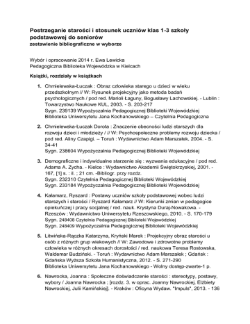 Postrzeganie starości i stosunek uczniów klas 1-3 szkoły podstawowej do seniorów zestawienie bibliograficzne w wyborze Wybór i opracowanie 2014 r. Ewa Lewicka Pedagogiczna Biblioteka Wojewódzka w Kielcach Książki, rozdziały w książkach 1. Chmielewska-Łuczak : Obraz człowieka starego u dzieci w wieku przedszkolnym // W: Rysunek projekcyjny jako metoda badań psychologicznych / pod red. Marioli Łaguny, Bogusławy Lachowskiej. - Lublin : Towarzystwo Naukowe KUL, 2003. - S. 203-217 Sygn. 239139 Wypożyczalnia Pedagogicznej Biblioteki Wojewódzkiej Biblioteka Uniwersytetu Jana Kochanowskiego – Czytelnia Pedagogiczna 2. Chmielewska-Łuczak Dorota : Znaczenie obecności ludzi starszych dla rozwoju dzieci i młodzieży / // W: Psychospołeczne problemy rozwoju dziecka / pod red. Aliny Czapigi. – Toruń : Wydawnictwo Adam Marszałek, 2004. - S. 34-41 Sygn. 238604 Wypożyczalnia Pedagogicznej Biblioteki Wojewódzkiej 3. Demograficzne i indywidualne starzenie się : wyzwania edukacyjne / pod red. Adama A. Zycha. - Kielce : Wydawnictwo Akademii Świętokrzyskiej, 2001. 167, [1] s. : il. ; 21 cm. -Bibliogr. przy rozdz. Sygn. 232310 Czytelnia Pedagogicznej Biblioteki Wojewódzkiej Sygn. 233184 Wypożyczalnia Pedagogicznej Biblioteki Wojewódzkiej 4. Kałamarz, Ryszard : Postawy uczniów szkoły podstawowej wobec ludzi starszych i starości / Ryszard Kałamarz // W: Kierunki zmian w pedagogice opiekuńczej i pracy socjalnej / red. nauk. Krystyna Duraj-Nowakowa. Rzeszów : Wydawnictwo Uniwersytetu Rzeszowskiego, 2010. - S. 170-179 Sygn. 248408 Czytelnia Pedagogicznej Biblioteki Wojewódzkiej Sygn. 248409 Wypożyczalnia Pedagogicznej Biblioteki Wojewódzkiej 5. Litwińska-Rączka Katarzyna, Kryński Marek : Projekcyjny obraz starości u osób z różnych grup wiekowych // W: Zawodowe i zdrowotne problemy człowieka w różnych okresach dorosłości / red. naukowa Teresa Rostowska, Waldemar Budziński. - Toruń : Wydawnictwo Adam Marszałek ; Gdańsk : Gdańska Wyższa Szkoła Humanistyczna, 2012. - S. 271-290 Biblioteka Uniwersytetu Jana Kochanowskiego - Wolny dostęp-zwarte-1 p. 6. Nawrocka, Joanna : Społeczne doświadczenie starości : stereotypy, postawy, wybory / Joanna Nawrocka ; [rozdz. 3. w oprac. Joanny Nawrockiej, Elżbiety Nawrockiej, Julii Kamińskiej]. - Kraków : Oficyna Wydaw. "Impuls", 2013. - 136 s. : il. ; 24 cm. - Bibliogr. s. 89-98 Sygn. 252548 Czytelnia Pedagogicznej Biblioteki Wojewódzkiej Sygn. 252549, 252756 Wypożyczalnia Pedagogicznej Biblioteki Wojewódzkiej 7. Nowicki, Jacek : Historyczne uwarunkowania postrzegania roli człowieka starego w społeczeństwie // W: Wybrane problemy osób starszych / pod red. nauk. Agnieszki Nowickiej. - Wyd. 3. - Kraków : Oficyna Wydawnicza "Impuls", 2010. - S. 43-54 Sygn. 245733 - wyd. 1 z 2006 r. Czytelnia Pedagogicznej Biblioteki Wojewódzkiej 8. Orzechowska, Grażyna : Aktualne problemy gerontologii społecznej / Grażyna Orzechowska. - Olsztyn : Wydawnictwo Uniwersytetu WarmińskoMazurskiego, 2001. - 100, [1] s. ; 24 cm. - Bibliogr. po rozdz. Sygn. 231200 Czytelnia Pedagogicznej Biblioteki Wojewódzkiej 9. Smółka, Lucyna : Wnuki wobec swoich dziadków i starości // W: Wczesna edukacja dziecka - perspektywy i zagrożenia / pod red. Stanisławy Włoch. Opole : Wydawnictwo Uniwersytetu Opolskiego, 2009. - S. 497-504 Na podstawie badań własnych przeprowadzonych wśród osób w wieku 20-23 lat. Biblioteka Uniwersytetu Jana Kochanowskiego – Czytelnia Pedagogiczna 10. Trafiałek, Elżbieta : Starzenie się i starość : wybór tekstów z gerontologii społecznej / Elżbieta Trafiałek. - Kielce : Wydawnictwo Uczelniane Wszechnicy Świętokrzyskiej, 2006. - 275 s. ; 21 cm. – (Prace Wszechnicy Świętokrzyskiej, 1234-7604 ; nr 104). - Bibliogr. s. 267-275 Sygn. 241543 Czytelnia Pedagogicznej Biblioteki Wojewódzkiej Sygn. 241544, 245771 Wypożyczalnia Pedagogicznej Biblioteki Wojewódzkiej 11. Trafiałek, Elżbieta : Życie na emeryturze w warunkach polskich przemian systemowych : studium teoretyczno-diagnostyczne / Elżbieta Trafiałek. Kielce : Wyższa Szkoła Pedagogiczna im. Jana Kochanowskiego, 1998 M.in. Miejsce człowieka starszego we współczesnym społeczeństwie w świetle odczuć indywidualnych. Sygn. 225047 Czytelnia Pedagogicznej Biblioteki Wojewódzkiej Sygn. 224875, 225194, 233596 Wypożyczalnia Pedagogicznej Biblioteki Wojewódzkiej 12. Wandrasz, Marian : Starość i jej postrzeganie przez ludzi młodych // W: Seniorzy w rodzinie, instytucji i społeczeństwie : wybrane zagadnienia współczesnej gerontologii / red. nauk. Artur Fabiś. – Sosnowiec : Wydawnictwo Wyższej Szkoły Zarządzania i Marketingu, 2005. - S. 157-172 Biblioteka Uniwersytetu Jana Kochanowskiego - Czytelnia Pedagogiczna Biblioteka Uniwersytetu Jana Kochanowskiego - Magazyn-parter 13. Zawadzka, Anna : Oddziaływanie dziadków na wypoczynek wnuków / Anna Zawadzka. - Wrocław : Wydawnictwo Uniwersytetu Wrocławskiego, 1999. - 171,[1] s. ; 24 cm. – (Acta Universitatis Wratislaviensis. Prace Pedagogiczne ; no 131). - Bibliogr. s.164-169 Sygn. 226862 Wypożyczalnia Pedagogicznej Biblioteki Wojewódzkiej Artykuły w czasopismach 14. Biela, Agnieszka : Rola babci i dziadka w opinii młodzieży / Agnieszka Biela // „Problemy Opiekuńczo-Wychowawcze”. - 2003, [nr] 6, s. 38-39 15. Bot, Jolanta : Babcia, dziadek i ja / Jolanta Bot // „Wychowanie w Przedszkolu”. - 2008, nr 1, s. 43-45 Wypowiedzi dzieci przedszkolnych. 16. Brzezińska, Anna I. : Dziadkowie, rodzice i dzieci: o relacjach między pokoleniami / Anna I. Brzezińska // „Remedium”. - 2013, nr 2, s. 1-3 Opis relacji międzypokoleniowych. 17. Dzięgielewska, Małgorzata : Postawy wobec ludzi starszych w nowoczesnym społeczeństwie / Małgorzata Dzięgielewska // „Zeszyty Naukowe Wyższej Szkoły Humanistyczno-Ekonomicznej w Łodzi”. - 2000, nr 7, s. 7-17 Biblioteka Uniwersytetu Jana Kochanowskiego – Magazyn-czasopisma 18. Falkowska, Justyna : Do czego są potrzebni