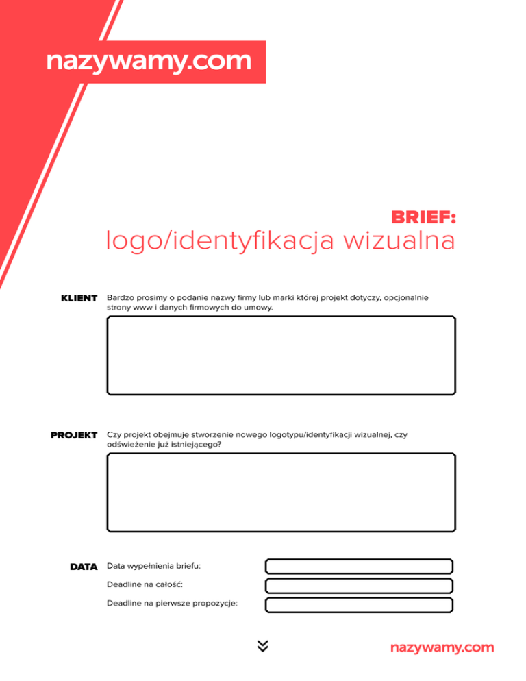 BRIEF: logo/identyfikacja wizualna KLIENT Bardzo prosimy o podanie nazwy firmy lub marki której projekt dotyczy, opcjonalnie strony www i danych firmowych do umowy. PROJEKT Czy projekt obejmuje stworzenie nowego logotypu/identyfikacji wizualnej, czy odświeżenie już istniejącego? DATA Data wypełnienia briefu: Deadline na całość: Deadline na pierwsze propozycje: 2/5 CELE W przypadku nowego logotypu/CI: jaki jest cel biznesowy firmy, tzn. co skłoniło Państwa PROJEKTU do stworzenia nowej marki (np. dywersyfikacja źródeł przychodu, inne pozycjonowanie (co i w jaki sposób ma spowodować stworzenie nowego lub odświeżenie dotychczasowego wizerunku marki?) nowej marki wobec marki-matki, potrzeba zastąpienia starej marki nową itp.) W przypadku istniejących logotypów/CI: jaki jest cel biznesowy projektu, tzn. co skłoniło Państwa do odświeżenia logo i/lub identyfikacji wizualnej marki (typu: zmiana pozycjonowania marki [np. podniesienie prestiżu], złe skojarzenia ze starym logo, zmiana asortymentu lub zasięgu działań firmy, odświeżenie i uporządkowanie identyfikacji wizualnej itp.). GRUPA Core target: kim są osoby, które są naszymi najważniejszymi odbiorcami. DOCELOWA (do kogo kierowany jest komunikat: zarobki, wykształcenie, zamieszkanie itp.) Szeroki target: kim są osoby, które nie są naszymi głównymi odbiorcami, ale są zapleczem biznesowym firmy, dlatego nie możemy ich pominąć w kreacji. POZYCJO- Jakie komunikaty o firmie ma ilustrować logo/identyfikacja wizualna: NOWANIE (w jaki sposób mamy być postrzegani przez grupę docelową?) mogą być opisane za pomocą trzech przymiotników, np.: • profesjonalizm, doświadczenie, tradycja • nowoczesność, kreatywność, profesjonalizm • odwaga, dobra zabawa, rozrywka 3/5 ZAŁOŻENIA Jeśli ten punkt pokrywa się z poprzednim – prosimy go nie wypełniać; w większości KREATYWNE przypadków będzie on identyczny jak „pozycjonowanie”. (jaki ma być charakter i temperament logo?) Jednak zdarzają się przypadki, że logo ma mieć nieco inny charakter niż firma, np.: gdy zakładane jest np. stonowanie surowego (lub przeciwnie – zbyt swobodnego) wizerunku firmy przez odświeżony logotyp, gdy logo jest pierwszym etapem całkowitego repozycjonowania odbioru marki, które planowane jest w dalszym okresie, ale już teraz logo powinno sygnalizować kierunek zmian TECHNIKA Czy logo ma posiadać sygnet? (Sygnet to element graficzny, który nie jest literą, ani cyfrą (czy są narzucone jakieś kryteria graficzne realizacji logo/identyfikacji wizualnej, czy mamy tutaj wolną rękę?) znajdującą się wprost w nazwie marki. Przykładowo: sygnetem mycha.eu jest litera M wpisana w kontur poprzedzający nazwę marki). Czy mamy wytyczne graficzne odnośnie logo? (może ich nie być, wówczas prosimy o informację, że zostawiają nam Państwo tutaj dowolność). Tzn. czy np.: • logo powinno być wyłącznie jednobarwne • powinno posiadać jedną, dodatkową barwa prowadzącą (istotne np. przy odświeżeniu logotypu, gdy zmieniamy kształt, ale np. zostawiamy jedną, określoną barwę dotychczasowej identyfikacji marki) • wyłącznie typograficzne (sam napis, bez sygnetu) • wskazane jest wykorzystanie w logo gradientu imitującego efekt 3D • itp. dowolne, sygnalizowane rozwiązania graficzne Czy mamy wytyczne graficzne odnośnie identyfikacji wizualnej? (może ich nie być, wówczas prosimy o informację, że zostawiają nam Państwo tutaj dowolność). Tzn. czy np.: • nowa identyfikacja powinna nawiązywać do obecnej na poziomie zastosowanej kolorystyki • powinna zachowywać jakiś, określony detal graficzny (lub key visual) nawiązujący do idei marki • z dowolnych powodów, nie może wykorzystywać wskazanych elementów graficznych – np. marka zdecydowanie chce odejść od wcześniejszego wizerunku, dlatego musimy całkowicie pominąć element …..x..… przy tworzeniu nowej identyfikacji 4/5 SPÓJNOŚĆ Czy logo/identyfikacja wizualna ma być spójne z jakimiś, istniejącymi elementami graficznymi? (czy ze względów biznesowych musimy brać pod uwagę już istniejące elementy identyfikacji wizualnej innych marek?) • Przykład 1: logotyp musi nawiązywać do spójnej linii graficznej innych podmiotów wchodzących w skład grupy • Przykład 2: identyfikacja musi nawiązywać/zawierać element graficzny, który od zawsze jest utożsamiany z marką, lub z grupą marek (przykład: ING = Lew) • Przykład 3: wprowadzony produkt jest nową oferta wchodzącą w zestaw szerszej linii zbliżonych produktów, jego opakowania/identyfikacja muszą więc powielać element …..x…. charakterystyczny dla całej linii produktów ZAKRES Opcja 1: gdy znany jest dokładny zakres prac, proszę go tutaj podać do wyceny, np.: I BUDŻET • Wyłącznie logotyp w wariancie kolorystycznym i jednobarwnym, 3 propozycje do wyboru (w ilu wariantach przedstawić logo, ilu końcowych wersjach oraz czy projektować pełną identyfikację/CI?) • Nie tylko logotyp, ale też pełna identyfikacja wizualna, obejmująca np.: wizytówki, papier firmowy, płyty CD/DVD, oznakowanie samochodu (oraz dowolne, inne, wskazane, potrzebne elementy identyfikacji) wraz z finalną księgą znaku Opcja 2: gdy ścisły jest budżet realizacji - proszę podać zakładaną kwotę/budżet przeznaczony na projekt logo/identyfikacji, a wówczas my już zaoferujemy zakres usług mieszczący się w zadeklarowanej kwocie UWAGI Miejsce na dowolne, inne sugestie, np. przykład wskazanie dobrych, już istniejących logotypów/identyfikacji wizualnych, których styl lub realizacja mogą być dla nas wskazówką. 5/5 Dziękujemy za wypełnienie! Prosimy o wysłanie na: [email protected]