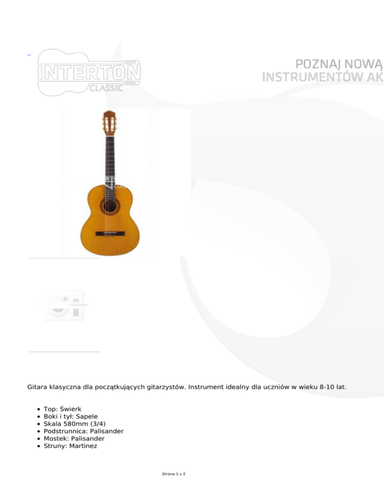 Gitara klasyczna dla początkujących gitarzystów. Instrument idealny dla uczniów w wieku 8-10 lat. Top: Świerk Boki i tył: Sapele Skala 580mm (3/4) Podstrunnica: Palisander Mostek: Palisander Struny: Martinez Strona 1 z 2 Wideo prezentacja gitary wykonana przez Krzysztofa Pełecha: Strona 2 z 2