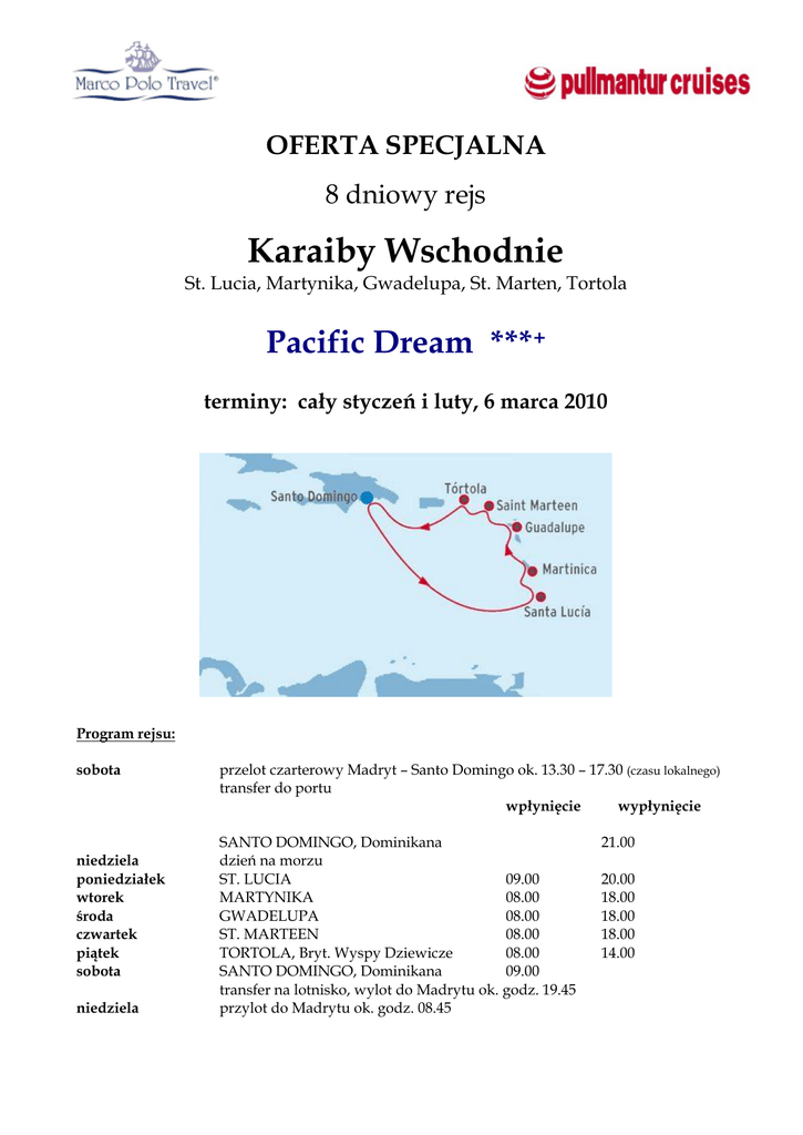 OFERTA SPECJALNA 8 dniowy rejs Karaiby Wschodnie St. Lucia, Martynika, Gwadelupa, St. Marten, Tortola Pacific Dream ***+ terminy: cały styczeń i luty, 6 marca 2010 Program rejsu: sobota niedziela poniedziałek wtorek środa czwartek piątek sobota niedziela przelot czarterowy Madryt – Santo Domingo ok. 13.30 – 17.30 (czasu lokalnego) transfer do portu wpłynięcie wypłynięcie SANTO DOMINGO, Dominikana dzień na morzu ST. LUCIA 09.00 MARTYNIKA 08.00 GWADELUPA 08.00 ST. MARTEEN 08.00 TORTOLA, Bryt. Wyspy Dziewicze 08.00 SANTO DOMINGO, Dominikana 09.00 transfer na lotnisko, wylot do Madrytu ok. godz. 19.45 przylot do Madrytu ok. godz. 08.45 21.00 20.00 18.00 18.00 18.00 14.00 PACIFIC DREAM Rok budowy: Rok modernizacji: Pasażerowie: Załoga: Liczba pokładów: Długość: Wyporność: 1981 2001 1350 osób 550 osób 8 dostępnych dla gości 205 m 35 000 ton RESTAURACJE I BARY: restauracja główna kawiarenki bary i sale klubowe kluby nocne SPORT I REKREACJA: fitness center – siłownia boiska do koszykówki i siatkówki baseny jacuzzi ROZRYWKA: teatr koncerty w barach kasyno dyskoteki biblioteka DODATKOWE USŁUGI: telefon satelitarny, faks galeria sklepów wolnocłowych sala konferencyjna centrum medyczne pralnia Proponowane kabiny: Kabina wewnętrzna: Kabina z dwoma łóżkami lub jednym typu queen-size, kącikiem wypoczynkowym, łazienką (z prysznicem), mini barem, TV, radiem, telefonem. Klimatyzacja. Kabina Superior kat. I - ok. 15,5 m ² Kabina zewnętrzna: Kabina z dwoma łóżkami lub jednym typu queen-size, kącikiem wypoczynkowym, łazienką (z prysznicem), mini barem, TV, radiem, telefonem. Klimatyzacja. Kabina z bulajem kat. H - ok. 15 m² Kabina z ograniczonym widokiem kat. G - ok. 16 m² Kabina Superior kat. F - ok. 15,2 m² Kabina Superior kat. E - ok. 15,5 m² Kabina Superior kat. D - ok. 16 m² Kabina Superior kat. C - ok. 16,5 m² Cena promocyjna w euro za osobę (zniżka od 30% do 46%): SEZON B: luty 2010: 13 marzec 2010: 6 KATAGORIE KABIN: SEZON A: styczeń 2010: 2 luty 2010: 20, 27 SEZON C: styczeń 2010: 9, 16, 23, 30 luty 2010: 6 CENA CENA CENA CENA CENA KATALOGOWA PROMOCYJNA KATALOGOWA PROMOCYJNA KATALOGOWA CENA PROMOCYJNA I wewnętrzna Superior 1 432,00 897,00 1 782,00 897,00 1 282,00 897,00 H zewnętrzna z bulajem 1 532,00 950,00 1 857,00 950,00 1 357,00 950,00 G zewnętrzna z ograniczonym widokiem 1 582,00 985,00 1 907,00 985,00 1 407,00 985,00 F zewnętrzna Superior 1 757,00 1 055,00 2 007,00 1 055,00 1 507,00 1 055,00 E zewnętrzna Superior 1 807,00 1 090,00 2 057,00 1 090,00 1 557,00 1 090,00 D zewnętrzna Superior 1 857,00 1 125,00 2 107,00 1 125,00 1 607,00 1 125,00 C zewnętrzna Superior 1 907,00 1 160,00 2 157,00 1 160,00 1 657,00 1 160,00 JS Junior Suite 24 m² 2 207,00 NA ZAPYTANIE 2 457,00 NA ZAPYTANIE 1 957,00 NA ZAPYTANIE JT Junior Suite 24 m² z balkonem 4,5 m² 2 307,00 2 557,00 NA ZAPYTANIE Royal Suite 32 m² 2 607,00 2 357,00 NA ZAPYTANIE ST Royal Suite 55 m² z balkonem 6,5 m² 2 707,00 NA ZAPYTANIE NA ZAPYTANIE NA ZAPYTANIE 2 057,00 SR NA ZAPYTANIE NA ZAPYTANIE NA ZAPYTANIE 2 457,00 NA ZAPYTANIE 2 857,00 2 957,00 Liczba miejsc promocyjnych ograniczona. DODATKOWE INFORMACJE O CENACH: Z dwoma os. dorosłymi w kabinie: dzieci do 2 lat: GRATIS dzieci 2-17 lat: 50% zniżki (od powyższych cen) + opłaty portowe i napiwki 3-cia, 4-ta osoba dorosła: 30% zniżki (od powyższych cen) + opłaty portowe i napiwki Dopłata do kabiny 1-osobowej: 300,00 EUR (kat. K – A) lub / i 500,00 EUR (kat. JS – ST) Opłaty portowe: 180,00 EUR / osoba Napiwki (płatne na statku): 65,00 EUR / osoba CENA ZAWIERA: przelot czarterowy na trasie Madryt – Santo Domingo – Madryt w klasie ekonomicznej; przejazd na trasie lotnisko – port – lotnisko (na Dominikanie), 7 noclegów w kabinie 2-os. wybranej kategorii serwis bagażowy podczas wejścia i zejścia ze statku, 24-godzinny serwis kabinowy, 3 główne posiłki, popołudniową herbatę, przekąski między posiłkami, ALL INLUSIVE: napoje niegazowane, gazowane, drinki, piwo, wino, likiery i koktajle bez limitów w każdym barze, restauracji i dyskotece na pokładzie Pacific Dream, korzystanie ze wszystkich urządzeń sportowo – rekreacyjnych znajdujących się na statku udział we wszystkich imprezach organizowanych na statku (przyjęcia, gry, animacje, konkursy) CENA NIE ZAWIERA: opłat portowych i lotniskowych (180 euro/os.) przelotu Polska – Madryt – Polska (informacja poniżej) ew. noclegu w Madrycie przed rejsem, proponujemy hotele (ceny dotyczą pokoi 2-os, zawierają śniadanie): Hotel Florida Norte (centrum Madrytu) – 46 EUR/os./noc (bez transferów) Hotel Auditorium (przy lotnisku) – 58 EUR/os./noc (shuttle bus lotnisko-hotel-lotnisko) Novotel Campo de las Naciones (przy lotnisku) – 45 EUR/os./noc (shuttle bus lotnisko-hotel-lotnisko) transferów w Madrycie w przypadku zakwaterowania w hotelu Florida Norte (taksówka lotnisko – centrum ok. 30,00 euro) wycieczek fakultatywnych wydatków osobistych (fryzjer, masaż, telefon, fax, Internet, opieka nad dziećmi, salon piękności, pralnia, porady lekarskie...), napiwków obowiązkowych dla obsługi (steward kabinowy, kierownik restauracji, kelner – przekazywanych w ostatnim dniu rejsu – łącznie równowartość 65,00 EUR/os.: ok. 90USD/os.), ubezpieczenia turystycznego, proponujemy InterPolska: wariant standardowy: KL-10000 EUR, NNW-2000 EUR, OC-10000 EUR, bagaż–400 EUR; składka: 1,19 EUR/os./dzień. wariant srebrny: KL-30000 EUR, NNW-3000 EUR, OC-20000 EUR, bagaż–500 EUR; składka: 1,75 EUR/os./dzień. wariant złoty: KL-70000 EUR, NNW-7000 EUR, OC-50000 EUR, bagaż–800 EUR; składka: 3,40 EUR/os./dzień. opłaty wylotowej ok. 25,00 USD/osoba (pobierana przy wylocie z Dominikany) opłaty za kartę turysty 10,00 USD/osoba (pobierana po przylocie do Santo Domingo, na lotnisku) ew. opłaty paliwowej (prawdopodobnie przy wzroście cen paliwa linia wprowadzi opłaty paliwowe. Opłata taka ok. 90 euro będzie wtedy dorzucona do potw