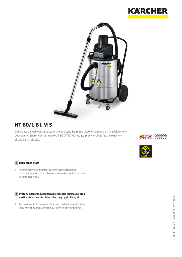 NT 80/1 B1 M S Odkurzacz z mozliwością odsysania wody typu B1 przeznaczony do pracy z materiałami wybuchowymi. Spełnia dyrektywę 94/9 EC (ATEX) dotyczącą pracy w obszarze zagrożonym eksplozją (strefa 22). 1 Bezpieczna praca Automatyczny układ kontroli poziomu wody pozwala na użytkowanie odkurzacza tylko gdy w zbiorniku znajduje się odpo- 2 Praca w obszarze zagrożonym eksplozją (strefa 22) oraz możliwość usuwania niebezpiecznego pyłu klasy M Przystosowanie do usuwania niebezpiecznych dla zdrowia pyłów klasy M oraz do pracy w strefie 22 i usuwania pyłów palnych. NT 80/1 B1 M S, 1.667-267.0, 2017-02-03 wiednia ilość wody. NT 80/1 B1 M S System antystatyczny Zbiornik ze stali szlachetnej Dane techniczne 1.667-267.0 Numer katalogowy 4039784725355 Wydatek powietrza l/s 56 Podciśnienie mbar / kPa 235 / 23,5 Pojemność zbiornika l 80 Maksymalna moc przyłącza W max. 1380 Przewód zasilający m 10 Poziom ciśnienia akustycznego dB (A) 70 Ciężar kg 32 Wymiary (dł. x szer. x wys.) mm 660 × 520 × 1078 Wyposażenie standardowe Wąż ssący m 4 Ssawka podłogowa na mokro/sucho mm 370 Zbiornik ze stali szlachetnej Filtr kartridżowy Papier Listwa odbojowa Uchwyt prowadzący Klasa bezpieczeństwa I Kółko samonastawne z hamulcem Klasa pyłu M Ssawka szczelinowa System antystatyczny Objęte dostawą. NT 80/1 B1 M S, 1.667-267.0, 2017-02-03 40 Średnica znamionowa Akcesoria dla NT 80/1 B1 M S 1.667-267.0 1 Numer katalogowy Anzahl Dummy Dummy Dummy Cena Opis Filtry kartridżowe (papier) Filtr kartridżowy 1 6.414-808.0 1 szt. NT 80/1 B1 M S, 1.667-267.0, 2017-02-03 Objęte dostawą. Dostępne akcesoria. Akcesoria dla NT 80/1 B1 M S 1.667-267.0 2 3 5 6 Numer katalogowy Ilość 7 Średnica znamionowa Długość Cena Opis Kolanka metalowe Kolanko ID 40 1 4.036-032.0 1 szt. ID 40 2 4.130-399.0 1 szt. ID 40 3 4.763-243.0 1 szt. ID 40 290 mm Szczelinowa ssawka o długości 290 mm. Tworzywo sztuczne, niewymienna. 4 4.025-372.0 1 szt. ID 40 1m Metalowa, chromowana, niewymienna ze złączem śrubowym, długość 1 m, ID 40. 5 4.440-558.0 1 szt. ID 40 4m 6 4.440-815.0 1 szt. ID 40 8m Kompletny wąż ssący o średnicy znamionowej DN 40 i długości 4m. Elektrycznie przewodzący – powstałe podczas odkurzania ładunki indukcyjne odprowadzane są do uziemi- onego odkurzacza. Zapobiega to, tzw. iskrzeniu podczas pracy. Kompletny wąż ssący o średnicy znamionowej DN 40 i długości 8m. Elektrycznie przewodzący – powstałe podczas odkurzania ładunki indukcyjne odprowadzane są do uziemi- onego odkurzacza. Zapobiega to, tzw. iskrzeniu podczas pracy. 7 4.763-242.0 1 szt. ID 40 120 mm Metalowe kolanko niewymienne. Tylko do odkurzaczy do strefy Z 22. Średnica ID 40. Ssawki podłogowe Ssawka uniwersalna ID 40 450 mm Aluminium, ssawka podłogowa, uziemiona, nieprzełączana, o regulowanej wysokości. Listwy szczotkowe (6.902-216.0). Ssawki szczelinowe Ssawka szczelinowa ID 40 Metalowe rury ssące Rura ssąca Wąż ssący komplet Wąż ssący Uniwersalne ssawki szczotkowe Ssawka Uniwersalna ssawka z naturalną szczeciną, o wymiarach 120 x 45 mm, średnica znamionowa DN 40. NT 80/1 B1 M S, 1.667-267.0, 2017-02-03 Objęte dostawą. Dostępne akcesoria.