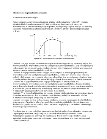 Efektywność i opłacalność nawożenia Wiadomości wprowadzające Krzywa reakcji na nawożenie. Zależność między wielkością plonu rośliny (Y) i ilością (dawką) składnika pokarmowego (X), którą roślina ma do dyspozycji, może być przedstawiona w sposób schematyczny w postaci, teoretycznej krzywej reakcji. Na krzywej tej można wyróżnić kilka charakterystycznych odcinków, płynnie przechodzących jeden w drugi. Odcinek I: w jego obrębie roślina może reagować zwiększającymi się, to znaczy więcej niż proporcjonalnymi przyrostami plonu na każdą kolejną dawkę składnika. Z tą częścią krzywej reakcji mamy do czynienia bardzo rzadko i dotyczy ona sytuacji, gdy roślina uprawiana jest na wyczerpanym z danego składnika podłożu. Odcinek II: w jego obrębie roślina reaguje jednakowymi, to znaczy proporcjonalnymi przyrostami plonu na każdą kolejną dawkę składnika. Jest to tzw. liniowa część krzywej reakcji, z którą mamy do czynienia wówczas, gdy roślina .jest uprawiana na ubogim w dany składnik podłożu i w przedziale niewielkich jego dawek dostarczanych w formie nawozów. Odcinek III: w jego obrębie roślina reaguje malejącymi, to znaczy mniej niż proporcjonalnymi przyrostami plonu na każdą kolejną dawkę składnika. Z tym odcinkiem mamy do czynienia najczęściej w doświadczeniach nawozowych i, wraz z punktem przejścia w odcinek IV, jest on najbardziej interesujący rolniczo. W punkcie przejścia odcinka III w odcinek IV uzyskuje się bowiem największe plony roślin. Odcinek IV: w jego obrębie roślina nie reaguje zmianą wielkości plonu na wzrastające dawki składnika pokarmowego. Jest to pozioma część krzywej reakcji na nawożenie, z którą w badaniach rolniczych spotykamy się dosyć często. Odcinek V: w jego obrębie roślina reaguje spadkiem plonu na wzrastająco dawki składnika pokarmowego. Wynika to albo z bezwzględnego nadmiaru składnika i jego toksycznego działania (przypadek raczej rzadki), albo z nadmiaru względnego i zachwiania równowagi mineralnego żywienia roślin. Przedstawiona krzywa reakcji na nawożenie ma, jak już podkreślono, charakter teoretyczny i z pełnym jej kształtem spotykamy się w badaniach nawozowych bardzo rzadko. Poszczególne odcinki tej krzywej, lub kombinacje dwóch lub więcej odcinków, mają natomiast bardzo duże znaczenie praktyczne i stanowią podstawę tzw. praw nawozowych i funkcji produkcji. Prawa nawozowe. W początkach rozwoju chemii rolnej sądzono, że rodzaj zależności między wielkością plonu i dawką składnika pokarmowego wynika z prawidłowości wzrostu i rozwoju rośliny i tym samym ma charakter prawa biologicznego. Najbardziej znane są: prawo przyrostów proporcjonalnych albo prawo minimum Liebiga (1855 r.) i prawo przyrostów mniej niż proporcjonalnych Mitscherlicha (1909 r.). Prawo Liebiga w znacznie uproszczonym brzmieniu stwierdza, że „Zwiększanie ilości (dawki) brakującego składnika powoduje proporcjonalny do dawki przyrost plonu, od plonu minimalnego do plonu maksymalnego, po którego osiągnięciu inny składnik wystąpi w minimum”. Prawo Liebiga, któremu autor nie nadał wymiaru ilościowego, jest odwzorowane II odcinkiem krzywej reakcji na nawożenie. Odcinek ten może być opisany równaniem regresji liniowej o postaci: Y=a + bX gdzie a stanowi plon minimalny (bez dodatku składnika), b odpowiada przyrostów i plonu na jednostkę zastosowanego składnika nawozowego. Prawo to do dzisiaj nie straciło aktualności i jest niekiedy używane do opisu i interpretacji wyników doświadczeń nawozowych w niewielkich przedziałach dawek. Prawo Mitscherlicha stwierdza, że przyrost plonu jest mniej niż proporcjonalny, to znaczy, że każdy następny kilogram dawki nawozu daje mniejszy przyrost plonu niż poprzedni. Oryginalne brzmienie tego prawa jest następujące: „Przyrost plonu pod wpływem kolejnej dawki składnika jest proporcjonalny do różnicy plonu już osiągniętego i plonu maksymalnego możliwego do uzyskania przy optymalnej dawce składnika”. Autor nadał swojemu prawu wymiar ilościowy, opisując je równaniem: Y = A(l – l0-cX) albo po zlogarytmowaniu: log (A - Y) = logA- cX gdzie A oznacza plon maksymalny, X - dawkę składnika nawozowego, a c jest współczynnikiem proporcjonalności. Z równania tego wynika, że plon rośliny (Y), w miarę zwiększania dawki składnika (X), dąży do wartości A, nigdy tej wartości nie osiągając. W dużym uproszczeniu można przyjąć, że równanie Mitscherlicha integruje odcinki: I, II i III krzywej reakcji do postaci wykładniczej, neguje natomiast możliwość występowania odcinków IV i V tej krzywej. Mitscherlich mylnie zakładał, że współczynnik c ma wartość stałą dla danego składnika nawozowego. Stałość współczynników c nie została w późniejszych czasach potwierdzona, tym niemniej równanie (nie nazywane już prawem) Mitscherlicha stanowi do dzisiaj jedną z często wykorzystywanych funkcji produkcji. Wadą tego równania jest jego nieliniowość i konieczność wyznaczania współczynników A i c w skomplikowany matematycznie sposób metodą iteracyjną. Funkcje produkcji (nawozowe). Funkcje nawozowe, opisywane funkcjami matematycznymi, przedstawiają zależność między wielkością plonu rośliny a wielkością dawki składnika nawozowego. Typ funkcji dobierany jest najczęściej metodą najmniejszych kwadratów z zastosowaniem rachunku regresji i z uwzględnieniem prostoty i łatwości posługiwania się daną funkcją. Do celów dydaktycznych wystarczy omówienie zastosowań najczęściej wykorzystywanej do opisu doświadczeń nawozowych funkcji wielomianowej 2° (tzw. funkcji kwadratowej) o postaci: Y = a + bX+cX2 gdzie Y oznacza plon rośliny, X dawkę składnika nawozowego, a - plon na poziomie X0 (bez nawozu), b - przeciętny przyrost plonu na 1 kg dawki (efektywność nawożenia), c - współczynnik funkcji wskazujący, o ile następny kilogram da