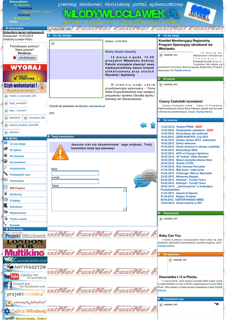 Strona główna Na sportowo Fotorelacje Masz problem - napisz! Konkursy Wideostrada Forum Informator targi_szkol_1000 Kalendarz świąt nietypowych Co się dzieje Dzisiaj jest: 13.03.2012 Urodziny London Pub'u Co się dzieje Komitet Monitorujący Regionalny Program Operacyjny obradował we Włocławku Dodano: 13-03-2012 Potrzebujesz pomocy? Masz pytanie? Redakcja: Nowy basen otwarty 12 marca we Włocławskim Inkubatorze I n n o w a c j i i Przedsiębiorczośc i p r z y u l . Toruńskiej 148 odbyło s ię posiedzenie Komitetu Monitorującego Regionalny Program Operacyjny Wo Czytaj więcej wszkole_min 12 marca o godz. 12.00 p r e z y d e n t Włocła w k a A n d r z e j Pałucki uroczyście otworzył nowy międzyosiedlowy basen miejski zlokalizowany przy ulicach Wysokiej i Szpitalnej. W szkole W o t w a r c i u w z ięl i u d z i ał przedstawiciele wykonawcy - Firma Alstal Grupa Budowlana oraz zastępcy prezydenta i dyrektor Ośrodka Sportu i rekreacji Jan Sieraczkiewicz. miasto_w_przyrodzie_200 nigdy_wiecej200 Cezary Czekalski laureatem! C e z a r y C z e k a l s k i u c z eń k l a s y I I I P r y w a t n e j Ogólnokształcącej Szkoły Sztuk Pięknych uzyskał tytuł laureata w Konkursie przedmiotowym z fizyki. Czytaj więcej Cennik do pobrania na stronie: wloclawek.pl oligo_1_procent (hs) studniówki wszkole_min micrisware_200 Na imprezę impreza_licealisty_baner200 jestpraca MENU Twój komentarz Co się dzieje Jeszcze nikt nie skomentował tego artykułu , T w ó j komentarz może być pierwszy! W szkole Na imprezę Na sportowo Artystycznie Nick: Powiedzieli nam e-mail: Fotorelacje MW Popiera Tekst: 5 Konkursy Projekty Szkolenia Wideostrada Prawa ucznia 13.03.2012. Święto PWSZ - DZIŚ! 13.03.2012. Gospodarka odpadami - DZIŚ! 14.03.2012. Konsultacje dla rodziców 15.03.2012. LIDER KAR-POL Cup 2012 16.03.2012. Koniec świata 2012 - kabareton 16.03.2012. Dzieci dzieciom 16.03.2012. South America II- obrazy z podróży 16.03.2012. Konsultacje NGO 18.03.2012. HATI w Czarnym Spichrzu 18.03.2012. W Teatrze "Złota Kaczka" 18.03.2012. Dzieci wymyślą własne litery 20.03.2012. Stroiki z UTW 21.03.2012. Rok Janusza Korczaka 21.03.2012. Mój świat - moje życie 23.03.2012. Coloriage i Marcin Wyrostek 23.03.2012. Wiosenny Bzzzyk 24.03.2012. Dobrzyń - Turniej Tańca 25.03.2012. Dobrzyń - Turniej Tańca 29.03.2012. „Jednocześnie” z Andrzejem Poniedzielskim 31.03.2012. Opania & Opania 01.04.2012. Region Chopina 06.04.2012. EASTER RAGGA VIBEZ 14.04.2012. Drzwi otwarte w ZST 6 wyslij Artystycznie wszkole_min Kontakt Polecamy Baby Can You 1 marca w jednym z warszawskim hoteli odbył się plan teledysku Agnieszki Orzechowskiej "polskiej Angeliny Jolie". Czytaj więcej Na sportowo wszkole_min Dwunastka I i II w Płocku 11 marca 2012r. dwie drużyny rocznika 2002 wzię ły udział w ogólnopolskim turniej w Płocku organizowanym przez Wisłę Płock. Oba zespoły w finale stoczyły bratobójczy pojed Czytaj więcej Powiedzieli nam wszkole_min "W zdrowym ciele – zdrowy duch" Już niebawem w naszym mieście odbędzie się Osiedlowa Liga Piłkarska - "Kazik". Realizacja przedsięwzięcia, jak i sama jego idea jest bardzo interesująca. Postanowiliśm y p Czytaj więcej Najnowsze galerie Teledysk "Baby Can You" - - Violetta Krużyńska jako widziadło "Miejcie nadzieję, nie tę lichą marną..."(II) 9.03.2012 - fot. Justyna Mikołajczyk "Miejcie nadzieję, nie tę lichą marną..." 9.03.2012 - fot. Justyna Mikołajczyk Kino na obcasach - 06.03.2012. Kopernik na UMK - - Dni Otwarte Uniwersytetu Szkolenia wszkole_min Trwa nabór do Programu LIDERZY PAFW Trwa rekrutacja do VIII edycji Programu Liderzy PolskoAmerykańskiej Fundacji Wolności. Czytaj więcej Projekty wszkole_min A k t y w n e F o r m y Przeciwdziałania Wykluczeniu Społecznemu Ministerstwo Pracy i Polityki Społecznej informuje, że w r a m a c h P r o g r a m u „A k t y w n e F o r m y P r z e c i w d z i ałania Wykluczeniu Społecznemu – edycja 2012 r.” do 30 Czytaj więcej Konkursy wszkole_min Pomniki przyrody Włocławka i okolic Zespół Szkół Elektrycznych we Włocławku ogłasza kolejną XII edycję konkursu dla uczniów szkół gimnazjalnych pt. Pomniki przyrody Włocławka i okolic pod honorowym patronat Czytaj więcej Prawa ucznia Kampanie społeczne Młodzi działają Dobre praktyki Partnerzy Rzecznik Praw Ucznia Telefon zaufania Fundacja Dzieci Niczyje Maciek Osuch Rzecznik Praw Dziecka Codziennik Prawny Psycho-help Bicie jest głupie Bliżej Dziecka Strefa Młodych Fundacja "Rodzice" E-wolontariat Rok Historii Najnowszej Podarnik Masz Głos Zły Dotyk Marzycielska Poczta Pogódźmy się Prawa człowieka Fundacja ARKA Dziecko krzywdzone Samorządy Uczniowskie Szkolny Express SDiM Projekt: POLSKA Organizacje Młodzieżowe Sportowo Coolturalnie Historycznie Projektowo Przywrócmy Pamięć SEFER Wolontariat WCK MULTIKINO Copyright©2011 MłodyWłocławek.pl Wykonanie: Michał Cieśliński