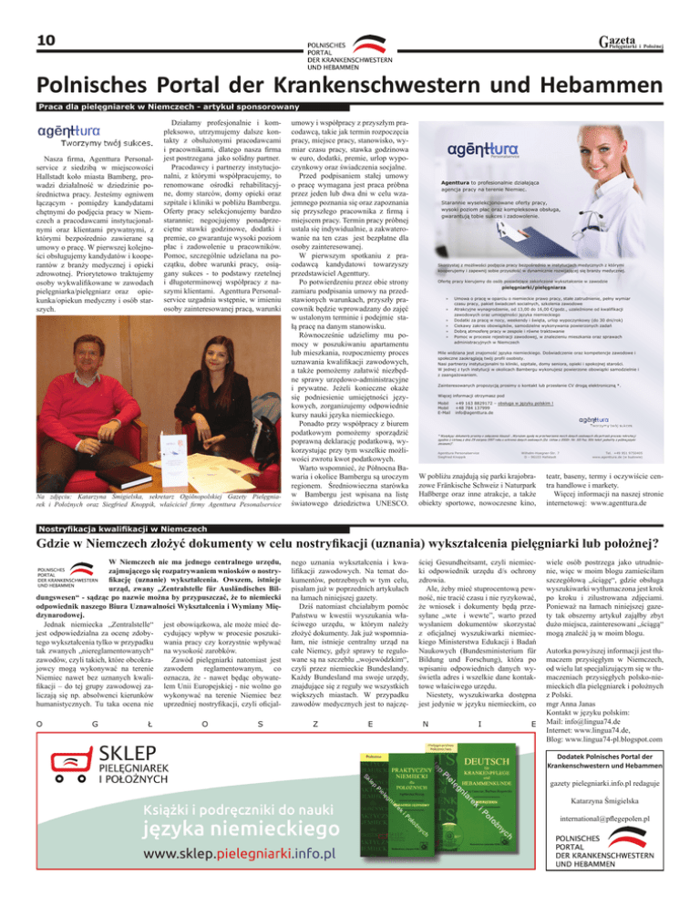 Gazeta 10 Pielęgniarki i Położnej Polnisches Portal der Krankenschwestern und Hebammen Praca dla pielęgniarek w Niemczech - artykuł sponsorowany Nasza firma, Agenttura Personalservice z siedzibą w miejscowości Hallstadt koło miasta Bamberg, prowadzi działalność w dziedzinie pośrednictwa pracy. Jesteśmy ogniwem łączącym - pomiędzy kandydatami chętnymi do podjęcia pracy w Niemczech a pracodawcami instytucjonalnymi oraz klientami prywatnymi, z którymi bezpośrednio zawierane są umowy o pracę. W pierwszej kolejności obsługujemy kandydatów i kooperantów z branży medycznej i opieki zdrowotnej. Priorytetowo traktujemy osoby wykwalifikowane w zawodach pielęgniarka/pielęgniarz oraz opiekunka/opiekun medyczny i osób starszych. Działamy profesjonalnie i kompleksowo, utrzymujemy dalsze kontakty z obsłużonymi pracodawcami i pracownikami, dlatego nasza firma jest postrzegana jako solidny partner. Pracodawcy i partnerzy instytucjonalni, z którymi współpracujemy, to renomowane ośrodki rehabilitacyjne, domy starców, domy opieki oraz szpitale i kliniki w pobliżu Bambergu. Oferty pracy selekcjonujemy bardzo starannie; negocjujemy ponadprzeciętne stawki godzinowe, dodatki i premie, co gwarantuje wysoki poziom płac i zadowolenie u pracowników. Pomoc, szczególnie udzielana na początku, dobre warunki pracy, osiągany sukces - to podstawy rzetelnej i długoterminowej współpracy z naszymi klientami. Agenttura Personalservice uzgadnia wstępnie, w imieniu osoby zainteresowanej pracą, warunki Na zdjęciu: Katarzyna Śmigielska, sekretarz Ogólnopolskiej Gazety Pielęgniarek i Położnych oraz Siegfried Knoppik, właściciel firmy Agenttura Pesonalservice umowy i współpracy z przyszłym pracodawcą, takie jak termin rozpoczęcia pracy, miejsce pracy, stanowisko, wymiar czasu pracy, stawka godzinowa w euro, dodatki, premie, urlop wypoczynkowy oraz świadczenia socjalne. Przed podpisaniem stałej umowy o pracę wymagana jest praca próbna przez jeden lub dwa dni w celu wzajemnego poznania się oraz zapoznania się przyszłego pracownika z firmą i miejscem pracy. Termin pracy próbnej ustala się indywidualnie, a zakwaterowanie na ten czas jest bezpłatne dla osoby zainteresowanej. W pierwszym spotkaniu z pracodawcą kandydatowi towarzyszy przedstawiciel Agenttury. Po potwierdzeniu przez obie strony zamiaru podpisania umowy na przedstawionych warunkach, przyszły pracownik będzie wprowadzany do zajęć w ustalonym terminie i podejmie stałą pracę na danym stanowisku. Równocześnie udzielimy mu pomocy w poszukiwaniu apartamentu lub mieszkania, rozpoczniemy proces uznawania kwalifikacji zawodowych, a także pomożemy załatwić niezbędne sprawy urzędowo-administracyjne i prywatne. Jeżeli konieczne okaże się podniesienie umiejętności językowych, zorganizujemy odpowiednie kursy nauki języka niemieckiego. Ponadto przy współpracy z biurem podatkowym pomożemy sporządzić poprawną deklarację podatkową, wykorzystując przy tym wszelkie możliwości zwrotu kwot podatkowych. Warto wspomnieć, że Północna Bawaria i okolice Bambergu są uroczym regionem. Średniowieczna starówka w Bambergu jest wpisana na listę światowego dziedzictwa UNESCO. αgēηƚƚυrα Personalservice Agenttura to profesionalnie działająca agencja pracy na terenie Niemiec. Starannie wyselekcjonowane oferty pracy, wysoki poziom płac oraz kompleksowa obsługa, gwarantują tobie sukces i zadowolenie. Skorzystaj z możliwości podjęcia pracy bezpośrednio w instytucjach medycznych z którymi kooperujemy i zapewnij sobie przyszłość w dynamicznie rozwijającej się branży medycznej. Ofertę pracy kierujemy do osób posiadające zakończone wykształcenie w zawodzie pielęgniarki/pielęgniarza » » » » » » Umowa o pracę w oparciu o niemieckie prawo pracy, stałe zatrudnienie, pełny wymiar czasu pracy, pakiet świadczeń socialnych, szkolenia zawodowe Atrakcyjne wynagrodzenie, od 13,00 do 16,00 €/godz., uzaleźnione od kwalifikacji zawodowych oraz umiejętności języka niemieckiego Dodatki za pracę w nocy, weekendy i święta, urlop wypoczynkowy (do 30 dni/rok) Ciekawy zakres obowiązków, samodzielne wykonywania powierzonych zadań Dobrą atmosferę pracy w zespole i równe traktowanie Pomoc w procesie rejestracji zawodowej, w znalezieniu mieszkania oraz sprawach administracyjnych w Niemczech Mile widziana jest znajomość języka niemieckiego. Doświadczenie oraz kompetencje zawodowe i społeczne zaokrąglają twój profil osobisty. Nasi partnerzy instytucjonalni to kliniki, szpitale, domy seniora, opieki i spokojnej starości. W jednej z tych instytucji w okolicach Bambergu wykonujesz powierzone obowiązki samodzielnie i z zaangażowaniem. Zainteresowanych propozycją prosimy o kontakt lub przesłanie CV drogą elektroniczną *. Więcej informacji otrzymasz pod Mobil Mobil E-Mail +49 163 8829172 – obsługa w języku polskim ! +48 784 137999 [email protected] * Wysyłając dokumenty prosimy o załączenie klauzuli: „Wyrażam zgodę na przetwarzanie moich danych osobowych dla potrzeb procesu rekrutacji zgodnie z Ustawą z dnia 29 sierpnia 1997 roku o ochronie danych osobowych (Dz. Ustaw z 2002r. Nr. 101 Poz. 926 tekst jednolity z późniejszymi zmianami)”. Agenttura Personalservice Siegfried Knoppik Wilhelm-Hoegner-Str. 7 D – 96103 Hallstadt W pobliżu znajdują się parki krajobrazowe Fränkische Schweiz i Naturpark Haßberge oraz inne atrakcje, a także obiekty sportowe, nowoczesne kino, Tel. +49 951 9750405 www.agenttura.de (w budowie) teatr, baseny, termy i oczywiście centra handlowe i markety. Więcej informacji na naszej stronie internetowej: www.agenttura.de Nostryfikacja kwalifikacji w Niemczech Gdzie w Niemczech złożyć dokumenty w celu nostryfikacji (uznania) wykształcenia pielęgniarki lub położnej? W Niemczech nie ma jednego centralnego urzędu, zajmującego się rozpatrywaniem wniosków o nostryfikację (uznanie) wykształcenia. Owszem, istnieje
