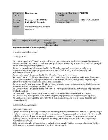 Właściciel / Kus, Joanna Owner Numer identyfikacyjny / Order ID 70340628 Zwierzę / Animal Pies Horus - PHOENIX PARADISE Tromelin Numer laboratoryjny / Laboratory No. HI292435/04.06.2014 Materiał Materiał tkankowy, materiał tkankowy Test Wynik/ Result Sign Wartość referencyjna / Reference value Wyniki badania histopatologicznego: Jednostka/ Unit Uwagi/ Remark w obrazie makroskopowym: Dziewięć fiolek. 1). „zastawka mitralna”: okrągły wycinek oraz przylegająca część mięśnia sercowego. Na płatkach zastawki znajdują się liczne 1-2 milimetrowe, guzkowate, beżowe zgrubienia. Brak makroskopowych zmian wsierdzia; wsierdzie gładkie. 2). „lewy przedsionek”: fragment tkanki 50 x 35 x ok. 3mm grubości ściany, z całkowicie segmentowanym, okrągłym przygotowaniem próbki. Gładka, niczym nie wyróżniająca się powierzchnia wsierdzia. 3). „lewa komora”: fragment tkanki 40 x 14 x ok. 10mm grubości ściany. 4). „aorta”: 40 x 37 x 28 mm, okrągły wycinek, zawierający cały obwód zastawki aorty. Występują liczne, podzastawkowe, najczęściej skierowane obwodowo, beżowe, nieregularne do podłużnych zgrubienia tkanki wsierdzia oraz tkanki pod wsierdziem. 5). „przegroda”: fragment tkanki 28 x 20 x 12mm grubości ściany z nieregularnym, blado beżowym obszarem mięśnia sercowego na sekcji cięcia. 6). „lewa komora”: fragment tkanki 30 x 13x 13-17 mm grubości ściany, zawierający część mięśnia brodawkowatego. 7). „wątroba”: fragment 60x30x40 mm; centralne części tkanki niezbyt dobrze utrwalone. 8). „płuco”: częściowa próbka 60x42x40 z zamglonym płynem wydzielającym się na wycinek. 9). „nerka”: częściowa próbka nerki 20x45x45 mm, niedostrzegalna sekcja cięcia. Torebka łatwo złuszczająca się. w badaniu histologicznym: 1) Zastawka mitralna: - płatek zastawki: guzkowaty rozrost przez mezenchymalne komórki wrzecionowate do gwiaździstych wśród w różnym stopniu obfitej, śluzakowatej macierzy. Rozproszonych kilka limfocytów i neutrofili. - okolica pod wsierdziem, na poziomie przyczepu zastawki: łagodny do umiarkowanego naciek lipidowy, obszary z odkładaniem lipidów. Wieloogniskowa łagodna, wodniczkowa degeneracja włókien mięśniowych. 2) Lewy przedsionek: wieloogniskowe, małe skupiska nacieku lipidowego oraz odkładanie lipidów. Wieloogniskowa, łagodna degeneracja włókien mięśniowych. 3) Lewa komora: wieloogniskowe obszary z umiarkowanym naciekiem lipidowym oraz odkładaniem. Wieloogniskowa degeneracja włókien mięśniowych, wakuolizacja oraz obszary z łagodnym zwłóknieniem. Łagodne przerzedzenie włókien. 4) Aorta: podaortowe, zastawkowe, wsierdziowe oraz pod wsierdziem zwłóknienie ze śluzakowatą macierzą, występującą razem z widocznymi makroskopowo prążkami podaortowymi. U podnóża zwłóknienia, na granicy z mięśniem sercowym, z łagodnym, neutrofilowym i limfohistiocytarnym, okołonaczyniowym naciekiem. W przylegającej oraz leżącej niżej tkance mięśnia sercowego ogniskowy obszar martwicy i degeneracji z mieszanym, głównie neutrofilowym odgraniczeniem zapalnym oraz deponowaniem drobnoziarnistego, zasadochłonnego, wapniowego materiału. Dodatkowo podobny typ oraz nasilenie zmian mięśnia sercowego jak w 3). 5) przegroda: zmiany podobne jak w 3)., ale z umiarkowanym zwłóknieniem (potwierdzonym przez barwienie Elastica van Giesson), przerzedzenie włókien oraz łagodny naciek limfohistiocytarny. 6) Lewy przedsionek: podobnie do 3). ogólnie niskiego stopnia. 7) Wątroba: okołozrazikowo, do średnio wyrażonych rozstrzeń i przekrwienie zatok. Równoczesne przerzedzenie beleczek wątrobowych i łagodne do średnich wakuolarne, degeneratywne zmiany hepatocytów. Barwienie żelazem: rzadkie wybarwienie rozproszonych komórek Kupffera. Barwienie Elastica-van-Gieson: minimalne, w pobliżu żyły centralnej i w pobliżu zatok, deponowanie kolagenu. 8) Płuco: Łagodne do średniego przekrwienie/zastój krwi, rozsiane w pęcherzykach płucnych, pęcherzykowe makrofagi i erytrocyty. Makrofagi wykazują okazjonalnie erytrocytozę. Barwienie żelazem: rozproszone hemosyderofagi, wewnątrzpęcherzykowe i śródmiąższowe. 9) Nerka: Łagodne do średniego przekrwienie. Nabłonek cylyndriczny z łagodną do średniej wakuolizacją cytoplazmy (nie można wykluczyć artefaktów po utrwaleniu). Diagnoza: 1) serce, zastawka mitralna: endokardioza (choroba zastawek przedsionków i komór), zwyrodnienie włókien mięśniowych pod wsierdziem, nacieczenie tłuszczowe oraz odkładanie lipidów. 4) serce, okolica aorty: zwłóknienie wsierdzia pod aortą i podwsierdziowe (zgodne ze zwężeniem podaortalnym). Odpowiadające ogniskowemu zwyrodnieniu miokardium i martwicy z zapaleniem odgraniczającym oraz dystroficznej mineralizacji. 2), 3), 4), 5), 6) serce, liczne próbki (proszę zobaczyć powyżej): wieloogniskowe, łagodne do umiarkowanego zwyrodnienie włókien mięśniowych, naciek lipidowy oraz odkładanie lipidów, a także wieloogniskowo łagodne do umiarkowanego włóknienie oraz rozrzedzenie włókien. 7) wątroba: umiarkowane do ciężkiego, okołozrazikowe do pośredniego rozszerzenie zatok i sznurów wątrobowych ze zwyrodnieniem komórek wątroby i minimalnym włóknieniem. 8) płuca: przekrwienie i zastój krwi z aktywacją makrofagów pęcherzykowych, okazjonalnie erytrofagia i hemosyderoza. 9) Nerka: łagodna do umiarkowanej, kanalikowa, cytoplazmatyczna wakuolizacja (nie można wykluczyć artefaktów wiązania). Komentarz: Wyniki histologiczne, jak już podejrzewano klinicznie, wskazują na zwężenie podaortalne, które jest jedną z najczęściej występujących anomalii w sercach psów. Często powiązane jest z chorobą lewej zastawki przedsionkowo-komorowej i jest opisywane u różnych ras psów. Dodatkowo wyniki badanych próbek wykazują wczesne stadium kardiomiopatii rozstrzeniowej. Ogniskowa martwica miokardium, sąsiadującą ze zmianą w aorcie/pod aortą je
