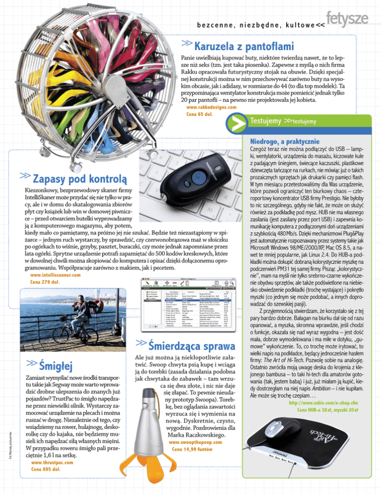 b e z c e n n e , n i e z b ę d n e , k u l t o w e << fetysze >> Karuzela z pantoflami Panie uwielbiają kupować buty, niektóre twierdzą nawet, że to lepsze niż seks (tzn. jest taka piosenka). Zapewne z myślą o nich firma Rakku opracowała futurystyczny stojak na obuwie. Dzięki specjalnej konstrukcji można w nim przechowywać zarówno buty na wysokim obcasie, jak i adidasy, w rozmiarze do 44 (to dla top modelek). Ta przypominająca wentylator konstrukcja może pomieścić jednak tylko 20 par pantofli – na pewno nie projektowała jej kobieta. www.rakkudesigns.com Cena 65 dol. Testujemy >>testujemy Niedrogo, a praktycznie >> Zapasy pod kontrolą Kieszonkowy, bezprzewodowy skaner firmy IntelliSkaner może przydać się nie tylko w pracy, ale i w domu do skatalogowania zbiorów płyt czy książek lub win w domowej piwniczce – przed otwarciem butelki wyprowadzamy ją z komputerowego magazynu, aby potem, kiedy mało co pamiętamy, na próżno jej nie szukać. Będzie też niezastąpiony w spiżarce – jednym ruch wystarczy, by sprawdzić, czy czerwonobrązowa maź w słoiczku po ogórkach to wiśnie, grzyby, pasztet, buraczki, czy może jednak zapomniane przez lata ogórki. Sprytne urządzenie potrafi zapamiętać do 500 kodów kreskowych, które w dowolnej chwili można skopiować do komputera i opisać dzięki dołączonemu oprogramowaniu. Współpracuje zarówno z makiem, jak i pecetem. www.intelliscanner.com Cena 279 dol. >> Śmierdząca sprawa Fot.Materiały producentów >> Śmigłej Zamiast wymyślać nowe środki transportu takie jak Segway może warto wprowadzić drobne ulepszenia do znanych już pojazdów? TrustPac to śmigło napędzane przez niewielki silnik. Wystarczy zamocować urządzenie na plecach i można ruszać w drogę. Niezależnie od tego, czy wsiądziemy na rower, hulajnogę, deskorolkę czy do kajaka, nie będziemy musieli ich napędzać siłą własnych mięśni. W przypadku roweru śmigło pali przeciętnie 1,6 l na setkę. www.thrustpac.com Cena 895 dol. Ale już można ją niekłopotliwie załatwić. Swoop chwyta psią kupę i wciąga ją do torebki (zasada działania podobna jak chwytaka do zabawek – tam wrzuca się dwa złote, i nic nie daje się złapać. To pewnie nieudany prototyp Swoopa). Torebkę, bez oglądania zawartości wyrzuca się i wymienia na nową. Dyskretnie, czysto, wygodnie. Pozdrowienia dla Marka Raczkowskiego. www.swoopthepoop.com Cena 14,99 funtów Czegóż teraz nie można podłączyć do USB – lampki, wentylatorki, urządzenia do masażu, kiczowate kule z padającym śniegiem, świecące kaczuszki, plastikowe dziewczęta tańczące na rurkach, nie mówiąc już o takich prozaicznych sprzętach jak drukarki czy pamięci flash. W tym miesiącu przetestowaliśmy dla Was urządzenie, które pozwoli ograniczyć ten biurkowy chaos – czteroportowy koncentrator USB firmy Prestigio. Nie byłoby to nic szczególnego, gdyby nie fakt, że może on służyć również za podkładkę pod mysz. HUB nie ma własnego zasilania (jest zasilany przez port USB) i zapewnia komunikację komputera z podłączonymi doń urządzeniami z szybkością 480 Mb/s. Dzięki mechanizmowi Plug&Play jest automatycznie rozpoznawany przez systemy takie jak Microsoft Windows 98/ME/2000/XP, Mac OS 8.5, a nawet te mniej popularne, jak Linux 2.4. Do HUB-a podkładki można dokupić dobraną kolorystycznie myszkę na podczerwień PM31 tej samej firmy. Pisząc „kolorystycznie”, mam na myśli nie tylko srebrno-czarne wykończenie obydwu sprzętów, ale także podświetlone na niebiesko obwiedzenie podkładki (trochę wystające) i pokrętło myszki (co jednym się może podobać, a innych doprowadzać do szewskiej pasji). Z przyjemnością stwierdzam, że korzystało się z tej pary bardzo dobrze. Bałagan na biurku dał się od razu opanować, a myszka, skromna wprawdzie, jeśli chodzi o funkcje, okazała się nad wyraz wygodna – jest dość mała, dobrze wymodelowana i ma miłe w dotyku, „gumowe” wykończenie. To, co trochę może irytować, to wielki napis na podkładce, będący jednocześnie hasłem firmy: The Art of Hi-Tech. Pozwolę sobie na analogię. Ostatnio zwróciła moją uwagę deska do krojenia z klejonego bambusa – to taki hi-tech dla amatorów gotowania (tak, jestem babą) i już, już miałam ją kupić, kiedy dostrzegłam na niej napis Ambition – i nie kupiłam. Ale może się trochę czepiam… http://www.asbis.com/e-shop.cfm Cena HUB-a 38 zł, myszki 20 zł