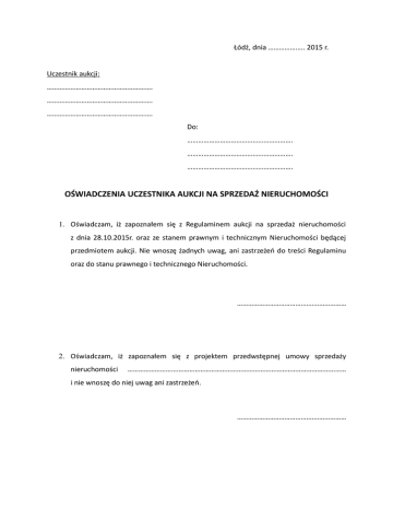 Łódź, dnia ……………….. 2015 r. Uczestnik aukcji: …………………………………………………. …………………………………………………. …………………………………………………. Do: …………………………………………………. …………………………………………………. …………………………………………………. OŚWIADCZENIA UCZESTNIKA AUKCJI NA SPRZEDAŻ NIERUCHOMOŚCI 1. Oświadczam, iż zapoznałem się z Regulaminem aukcji na sprzedaż nieruchomości z dnia 28.10.2015r. oraz ze stanem prawnym i technicznym Nieruchomości będącej przedmiotem aukcji. Nie wnoszę żadnych uwag, ani zastrzeżeń do treści Regulaminu oraz do stanu prawnego i technicznego Nieruchomości. …………………………………………………… 2. Oświadczam, iż zapoznałem się z projektem przedwstępnej umowy sprzedaży nieruchomości ………………………………………………………………………………………………………… i nie wnoszę do niej uwag ani zastrzeżeń. ……………………………………………………