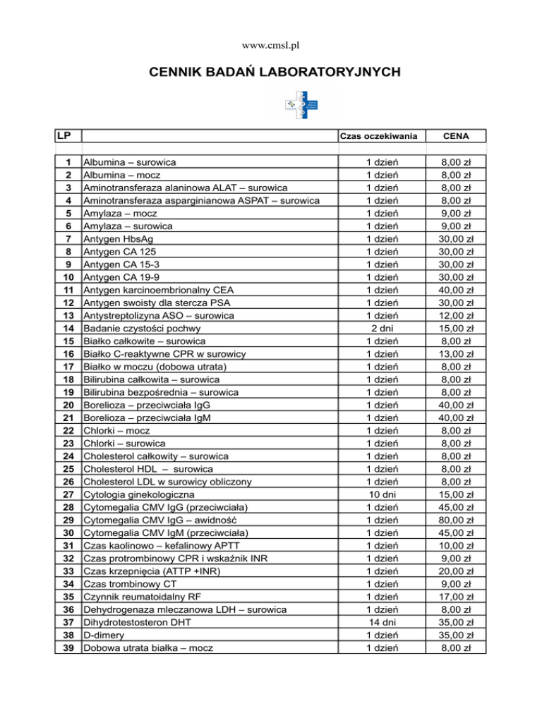 www.cmsl.pl CENNIK BADAŃ LABORATORYJNYCH LP 1 2 3 4 5 6 7 8 9 10 11 12 13 14 15 16 17 18 19 20 21 22 23 24 25 26 27 28 29 30 31 32 33 34 35 36 37 38 39 Czas oczekiwania Albumina – surowica Albumina – mocz Aminotransferaza alaninowa ALAT – surowica Aminotransferaza asparginianowa ASPAT – surowica Amylaza – mocz Amylaza – surowica Antygen HbsAg Antygen CA 125 Antygen CA 15-3 Antygen CA 19-9 Antygen karcinoembrionalny CEA Antygen swoisty dla stercza PSA Antystreptolizyna ASO – surowica Badanie czystości pochwy Białko całkowite – surowica Białko C-reaktywne CPR w surowicy Białko w moczu (dobowa utrata) Bilirubina całkowita – surowica Bilirubina bezpośrednia – surowica Borelioza – przeciwciała IgG Borelioza – przeciwciała IgM Chlorki – mocz Chlorki – surowica Cholesterol całkowity – surowica Cholesterol HDL – surowica Cholesterol LDL w surowicy obliczony Cytologia ginekologiczna Cytomegalia CMV IgG (przeciwciała) Cytomegalia CMV IgG – awidność Cytomegalia CMV IgM (przeciwciała) Czas kaolinowo – kefalinowy APTT Czas protrombinowy CPR i wskaźnik INR Czas krzepnięcia (ATTP +INR) Czas trombinowy CT Czynnik reumatoidalny RF Dehydrogenaza mleczanowa LDH – surowica Dihydrotestosteron DHT D-dimery Dobowa utrata białka – mocz 1 dzień 1 dzień 1 dzień 1 dzień 1 dzień 1 dzień 1 dzień 1 dzień 1 dzień 1 dzień 1 dzień 1 dzień 1 dzień 2 dni 1 dzień 1 dzień 1 dzień 1 dzień 1 dzień 1 dzień 1 dzień 1 dzień 1 dzień 1 dzień 1 dzień 1 dzień 10 dni 1 dzień 1 dzień 1 dzień 1 dzień 1 dzień 1 dzień 1 dzień 1 dzień 1 dzień 14 dni 1 dzień 1 dzień CENA 8,00 zł 8,00 zł 8,00 zł 8,00 zł 9,00 zł 9,00 zł 30,00 zł 30,00 zł 30,00 zł 30,00 zł 40,00 zł 30,00 zł 12,00 zł 15,00 zł 8,00 zł 13,00 zł 8,00 zł 8,00 zł 8,00 zł 40,00 zł 40,00 zł 8,00 zł 8,00 zł 8,00 zł 8,00 zł 8,00 zł 15,00 zł 45,00 zł 80,00 zł 45,00 zł 10,00 zł 9,00 zł 20,00 zł 9,00 zł 17,00 zł 8,00 zł 35,00 zł 35,00 zł 8,00 zł www.cmsl.pl 40 41 42 43 44 45 46 47 48 49 50 51 52 53 54 55 56 57 58 59 60 61 62 63 64 65 66 67 68 69 70 71 72 73 74 75 76 77 78 79 80 81 82 83 84 85 86 Dobowa utrata fosforu – mocz Dobowa utrata magnezu – mocz Dobowa utrata potasu – mocz Dobowa utrata sodu – mocz Dobowa utrata wapnia – mocz Elektrolity Elektroforeza białek – proteinogram Estradiol E2 Ferrytyna Fibrynogen Fosfotaza alkaliczna (zasadowa) – surowica Fosfotaza kwaśna – surowica Fosfor – surowica GGTP gammaglutamylotranspeptydaza Glukoza – surowica Glukoza – mocz Grupa krwi ABO i Rh Helicobacter – przeciwciała Hemoglobina glikolizowana HbA1C Hemoglobina w moczu Homocysteina Hormon adrenokortykotropowy ACTH Hormon folikulotropowy FSH Hormon luteinizujązy LH Hormon TSH Hormon wzrostu GH Insulina Insulina test obciążeniowy Kalcytonina Kał – badanie ogólne Kał – badanie na pasożyty Kał - krew utajona Kał –Lamblia Kał posiew Kał posiew ogólny z oceną tlenową flory jelitowej Kał posiew z ogólną oceną flory jelitowej Kał na nosicielstwo Salmonella - Shigella Kinaza kreatyninowa CK – surowica Klirens Kreatyniny – surowica i mocz + liczenie Kortyzol w moczu Kortyzol w surowicy Kreatynina – surowica Kreatynina – mocz Krew-Karta Krzywa wchłaniania po obciążeniu glukozą – 50g Kwas foliowy Kwas moczowy – mocz 1 dzień 1 dzień 1 dzień 1 dzień 1 dzień 1 dzień 3 dni 1 dzień 1 dzień 1 dzień 1 dzień 1 dzień 1 dzień 1 dzień 1 dzień 1 dzień 2-3 dni 1 dzień 1 dzień 2-3 dni do 10 dni do 10 dni 1 dzień 1 dzień 1 dzień do 10 dni 1 dzień 1 dzień do 10 dni 1 dzień 1 dzień 1 dzień 1 dzień 2-3 dni 2-3 dni 2-6 dni 7 dni 1 dzień 1 dzień 1 dzień 2-3 dni 1 dzień 1 dzień 7 dni 1 dzień do 10 dni 1 dzień 8,00 zł 8,00 zł 8,00 zł 8,00 zł 8,00 zł 13,00 zł 18,00 zł 25,00 zł 25,00 zł 15,00 zł 8,00 zł 10,00 zł 8,00 zł 8,00 zł 8,00 zł 8,00 zł 30,00 zł 35,00 zł 30,00 zł 20,00 zł 35,00 zł 55,00 zł 26,00 zł 25,00 zł 22,00 zł 30,00 zł 25,00 zł 30,00 zł 55,00 zł 17,00 zł 15,00 zł 17,00 zł 35,00 zł 30,00 zł 25,00 zł 55,00 zł 30,00 zł 8,00 zł 15,00 zł 35,00 zł 33,00 zł 8,00 zł 8,00 zł 20,00 zł 15,00 zł 60,00 zł 8,00 zł www.cmsl.pl 87 88 89 90 91 92 93 94 95 96 97 98 99 100 Kwas moczowy – surowica Kwas walproinowy Lipaza Lipidogram Magnez w moczu Magnez w surowicy Mocz – badanie ogólne Mocz – posiew Mocz – test narkotykowy Mocznik – mocz Mocznik – surowica Morfologia krwi obwodowej z rozmazem Odczyn Biernackiego OB Odczyn Waaler Rosego 101 102 103 104 105 106 107 108 109 110 111 112 113 114 115 116 117 118 119 120 121 122 123 124 125 126 127 128 129 130 131 132 133 Oporność osmotyczna krwinek czerwonych, skrining fotometryczny Plwocina – badanie ogólne Plwocina – posiew Płytki krwi Potas – mocz Potas – surowica Progesteron PRG Prolaktyna PRL Prolaktyna PRL – test z metoclopramidem MTC 0/60 Proteinogram w moczu Proteinogram w surowicy Próba Sulkowicza – mocz Próba tymolowa Przeciwciała anty HIV Przeciwciała anty – HBS Przeciwciała anty – HCV Przeciwciała anty-TG Przeciwciała anty-TPO Przeciwciała przeciw insulinowe Przeciwciała układu Rh – profilaktyka ciężarnych Retikulocyty Różyczka – przeciwciała IgG Różyczka – przeciwciała IgM Rzeżączka – posiew Sód – mocz Sód – surowica Test antyglobulinowy bezpośredni BTA (odczyn Combsa) Test antyglobulinowy pośredni PTA (odczyn Combsa) Test ciążowy beta-HCG Test na mononukleozę zakaźną IM Testosteron Toxoplazmoza – przeciwciała IgG Toxoplazmoza – przeciwciała IgM 1 dzień 2-3 dni do 7 dni 1 dzień 1 dzień 1 dzień 1 dzień 7 dni 1 dzień 1 dzień 1 dzień 1 dzień 1 dzień 1 dzień 8,00 zł 35,00 zł 20,00 zł 27,00 zł 8,00 zł 8,00 zł 8,00 zł 28,00 zł 20,00 zł 8,00 zł 8,00 zł 12,00 zł 7,00 zł 15,00 zł 1 dzień 1 dzień 2-4 dni 1 dzień 1 dzień 1 dzień 1 dzień 1 dzień 1 dzień do 14 dni 3 dni 1 dzień 1 dzień 1 dzień 1 dzie