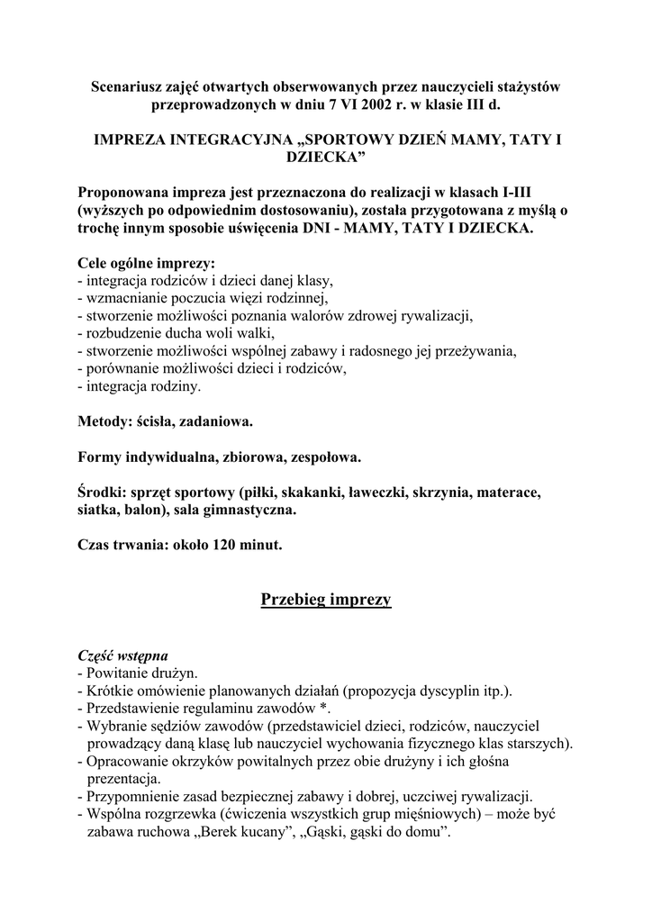 Scenariusz zajęć otwartych obserwowanych przez nauczycieli staŜystów przeprowadzonych w dniu 7 VI 2002 r. w klasie III d. IMPREZA INTEGRACYJNA „SPORTOWY DZIEŃ MAMY, TATY I DZIECKA” Proponowana impreza jest przeznaczona do realizacji w klasach I-III (wyŜszych po odpowiednim dostosowaniu), została przygotowana z myślą o trochę innym sposobie uświęcenia DNI - MAMY, TATY I DZIECKA. Cele ogólne imprezy: - integracja rodziców i dzieci danej klasy, - wzmacnianie poczucia więzi rodzinnej, - stworzenie moŜliwości poznania walorów zdrowej rywalizacji, - rozbudzenie ducha woli walki, - stworzenie moŜliwości wspólnej zabawy i radosnego jej przeŜywania, - porównanie moŜliwości dzieci i rodziców, - integracja rodziny. Metody: ścisła, zadaniowa. Formy indywidualna, zbiorowa, zespołowa. Środki: sprzęt sportowy (piłki, skakanki, ławeczki, skrzynia, materace, siatka, balon), sala gimnastyczna. Czas trwania: około 120 minut. Przebieg imprezy Część wstępna - Powitanie druŜyn. - Krótkie omówienie planowanych działań (propozycja dyscyplin itp.). - Przedstawienie regulaminu zawodów *. - Wybranie sędziów zawodów (przedstawiciel dzieci, rodziców, nauczyciel prowadzący daną klasę lub nauczyciel wychowania fizycznego klas starszych). - Opracowanie okrzyków powitalnych przez obie druŜyny i ich głośna prezentacja. - Przypomnienie zasad bezpiecznej zabawy i dobrej, uczciwej rywalizacji. - Wspólna rozgrzewka (ćwiczenia wszystkich grup mięśniowych) – moŜe być zabawa ruchowa „Berek kucany”, „Gąski, gąski do domu”. Część właściwa Mecz piłki noŜnej (rywalizacja druŜyn) Reguły takie jak w mini-piłce noŜnej. KaŜda druŜyna składa się z 8 zawodników (składy mieszane), pozostali są rezerwowymi i zmieniają się z zawodnikami z pola. Dla uatrakcyjnienia zawodów wszelki rzuty wolne i karne wykonywane są na jednej nodze. Rodzinne rzuty do kosza KaŜda druŜyna składa się z trzech osób, mamy, taty i dziecka, zadaniem uczestników jest wrzucenie jak największej liczby koszy (kaŜdy oddaje trzy rzuty), poniewaŜ kosz jest zawieszony na wysokości dostosowanej do moŜliwości dzieci, rodzice oddają swoje rzuty klęcząc, ostatni dziesiąty rzut wykonywany jest tyłem (druŜyna wybiera jednego uczestnika, który go wykonuje) lub wspólnie, cała druŜyna stara się razem wrzucić piłkę do kosza. Tańcząca skakanka (konkurencja indywidualna) Dwie osoby kręcą sznur wykonany z połączonych skakanek, zadaniem uczestników jest wykonać jak najwięcej skoków. W tej konkurencji skaczą rodzice i dzieci bez podziału na druŜyny. Kto więcej razy skoczy? (rywalizacja druŜyn) Teraz jest juŜ podział na 6 osobowe druŜyny (wybrane spośród wszystkich uczestników). Cała druŜyna staje miedzy kręcącymi, na sygnał zaczyna się kręcenie, zadaniem uczestników jest przeskakiwanie skakanki, kaŜde zatrzymanie skakanki powoduje odejście jednego uczestnika, i tak do momentu, aŜ wszyscy uczestnicy wykorzystają swoją szansę . Sędzia zlicza i sumuje wszystkie poprawnie wykonane skoki. Odbijanka siatkarska w siadzie (rywalizacja druŜyn) KaŜda druŜyna liczy 6 zawodników, którzy siedzą na parkiecie (pozostali są rezerwowymi i zmieniają się z zawodnikami z pola), zadanie ich polega na odbijaniu balonu tylko lewą ręką (moŜna teŜ odbijać balon tylko kciukiem itp.) nad nisko zawieszoną siatką na pole przeciwnika. KaŜda druŜyna moŜe wykonać na swoim polu dwa odbicia. Proponowana zabawa moŜe być przeprowadzona z wykorzystaniem piłki, wtedy odbicia zamieniamy na rzuty. Rodzinny tor przeszkód Na sali rozstawione są przyrządy gimnastyczne – ławeczka, skrzynia, pachołki, materac – zadaniem uczestników jest pokonanie tego toru według wskazań sędziego na czas (sposób ustawienia przyrządów i dobór zadań według inwencji nauczyciela prowadzącego imprezę). KaŜdy zawodnik druŜyny pokonuje przeszkody, sędzia zawodów zlicza czasy i przedstawia wyniki. Dwa ognie (rywalizacja druŜyn) W tej konkurencji biorą udział wszyscy sportowcy. Uczestnicy dzielą się na druŜyny (kaŜdy uczestnik ma jedno „Ŝycie”), wybierają spośród siebie matkę (ma trzy „Ŝycia”) i zaczyna się gra. Na początku zbijane są dzieci, potem do środka wchodzi matka, gra się kończy, gdy jedna cała druŜyna straci wszystkie „Ŝycia”. Dla uatrakcyjnienia zawodów moŜna przydzielić dzieciom matkę wybraną przez rodziców, a rodzicom matkę wybraną przez dzieci. Quiz sportowy (rywalizacja druŜyn) W tej konkurencji biorą udział wszyscy uczestnicy spotkania podzieleni na dwie druŜyny, kaŜdy zespół wybiera kapitana, który będzie udzielał uzgodnionej wcześniej odpowiedzi. Punktację ustala sędzia w zaleŜności od potrzeb, pytania zadawane są losowo, raz odpowiadają jedni, raz drudzy. Propozycje pytań. 1. Wymień pięć dyscyplin sportowych, w których wykorzystuje się piłkę! Piłka noŜna, piłka ręczna, koszykówka, piłka wodna, tenis .... 2. Wymień pięć przyrządów innych niŜ piłka, które wykorzystuje się w róŜnych dyscyplinach sportowych! Oszczep, dysk, kij golfowy, młot, kula ...... 3. Wymień trzy dyscypliny sportowe, które w swojej nazwie mają słowo „skok” Skok wzwyŜ, skok w dal, skok o tyczce, skok narciarski ... 4. Wymień trzy dyscypliny sportowe, które w swojej nazwie mają słowo „rzut” Rzut oszczepem, rzut dyskiem, rzut młotem. 5. Wymień trzech znanych polskich sportowców - męŜczyzn! Adam Małysz, Wojciech Fibak, Zbigniew Boniek .... 6. Podaj nazwiska trzech znanych polskich sportowców – kobiet! Izabela Dylewska, Irena Szewińska, Renata Mauer, Małgorzata Dydek .... Pytania z przymruŜeniem oka 7. Dlaczego zawodnicy piłki wodnej grają prawie na golasa? Bo grają w wodzie. 8. Ile bramek jest na boisku do koszykówki? Na boisku do koszykówki są kosze, a nie bramki. 9. O jakiej dyscyplinie mowa: Dwudziestu dwóch biegających za jedną kulą i trzech prz