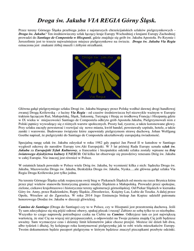 Droga św. Jakuba VIA REGIA Górny Śląsk. Przez tereny Górnego Śląska przebiega jeden z najstarszych chrześcijańskich szlaków pielgrzymkowych Droga św. Jakuba? Ten średniowieczny szlak łączący kraje Europy Wschodniej z krajami Europy Zachodniej prowadzi do Santiago de Compostela w Hiszpanii, gdzie znajduje się grób św. Jakuba Apostoła. Po Rzymie i Jerozolimie jest to trzecie najważniejsze miejsce pielgrzymkowe na świecie. Droga św. Jakuba Via Regia oznaczona jest znakami żółtej muszli i żółtymi strzałkami. Główna gałąź pielgrzymiego szlaku Drogi św. Jakuba biegnący przez Polskę wzdłuż dawnej drogi handlowej zwanej Drogą Królewską - z łaciny Via Regia - od czasów średniowiecza był niezwykle ważnym w Europie traktem łączącym Ruś, Małopolskę, Śląsk, Saksonię, Turyngię i Hesję ze środkową Francją i Hiszpanią gdzie w IX wieku w miejscowości Santiago de Compostela odkryto grób Apostoła Jakuba, Pielgrzymowali nim z Polski pątnicy wywodzący się z różnych warstw społecznych. Prosty lud, rycerze, a także koronowane głowy. Przy szlaku zaczęły powstawać i rozwijać się nowe miasta, kwitł handel, powstawały szpitale, hotele, a także zamki i warownie. Budowano świątynie które zapewniały pielgrzymom strawę duchową. Johan Wolfgang Goethe napisał, że pielgrzymki do Santiago de Compostela ukształtowały europejską świadomość. Specjalną rangę szlak św. Jakuba odzyskał w roku 1982 gdy papież Jan Paweł II w katedrze w Santiago wygłosił odezwę do narodów Europy tzw.Akt Europejski. W 5 lat później Rada Europy uznała szlak św. Jakuba za Europejski Szlak Kulturowy, a francuskie i hiszpańskie odcinki szlaku zostały wpisane na listę światowego dziedzictwa kultury UNESCO. Od kilku lat obserwuje się prawdziwy renesans Dróg św. Jakuba w całej Europie. Nie inaczej jest również w Polsce. W ostatnich latach powstało w Polsce wiele Dróg św. Jakuba, by wymienić kilka z nich: Sądecka Droga św. Jakuba, Mazowiecka Droga św. Jakuba, Beskidzka Droga św. Jakuba, Nyska.....ale główna gałąź szlaku Via Regia Droga Królewska jest tylko jedna. Na terenie Górnego Śląska szlak rozpoczyna swój bieg w Piekarach Śląskich od mostu na rzece Brynica która przez pięć wieków stanowiła historyczną granice między Śląskiem a Małopolską. Prowadzi przez spokojne, zielone, ciekawe krajobrazowo i historycznie tereny aglomeracji górnośląskiej. Od Piekar Sląskich w kierunku Góry św. Anny, przez Radzionków, Repty Śląskie, Zbrosławice, Księżny Las, Łubie do Toszka. A dalej przez Opole, Wrocław aż do Zgorzelca. W roku 2014 Jego Eminencja biskup Jan Kopiec udzielił patronatu honorowego Drodze św. Jakuba w diecezji gliwickiej. Camino de Santiago (Droga do Santiago) czy to w Polsce, czy w Hiszpanii jest przestrzenią duchową. Jeśli Ty sam zdecydujesz się nią pójść-odrzuć obawy, spakuj plecak i ruszaj! Zabierz ze sobą tylko to co niezbędne. Wszystko to czego naprawdę potrzebujesz czeka na Ciebie na Camino. Odkryjesz tam co jest największą wartością, że stać Cię na więcej niż przypuszczałeś, a odpowiedzi na Twoje pytania znajdą Cię jeśli będziesz uważny. Sam wyznaczysz czas i dzienny limit kilometrów jakie chcesz przejść. Możesz iść dzień lub dwa, albo tydzień i dłużej, by kolejnego roku kontynuować pielgrzymkę jak to robi wielu mieszkańców Europy. Twoim dokumentem będzie paszport pielgrzyma w którym będziesz znaczył pieczątkami przebyte odcinki. Na podstawie tegoż paszportu w wyznaczonych miejscach otrzymasz tani posiłek i dach nad głową.