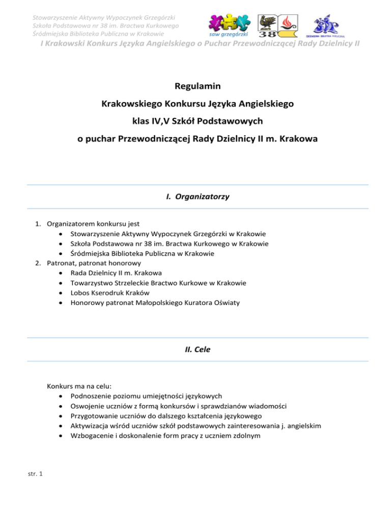 Stowarzyszenie Aktywny Wypoczynek Grzegórzki Szkoła Podstawowa nr 38 im. Bractwa Kurkowego Śródmiejska Biblioteka Publiczna w Krakowie I Krakowski Konkurs Języka Angielskiego o Puchar Przewodniczącej Rady Dzielnicy II Regulamin Krakowskiego Konkursu Języka Angielskiego klas IV,V Szkół Podstawowych o puchar Przewodniczącej Rady Dzielnicy II m. Krakowa I. Organizatorzy 1. Organizatorem konkursu jest Stowarzyszenie Aktywny Wypoczynek Grzegórzki w Krakowie Szkoła Podstawowa nr 38 im. Bractwa Kurkowego w Krakowie Śródmiejska Biblioteka Publiczna w Krakowie 2. Patronat, patronat honorowy Rada Dzielnicy II m. Krakowa Towarzystwo Strzeleckie Bractwo Kurkowe w Krakowie Lobos Kserodruk Kraków Honorowy patronat Małopolskiego Kuratora Oświaty II. Cele Konkurs ma na celu: Podnoszenie poziomu umiejętności językowych Oswojenie uczniów z formą konkursów i sprawdzianów wiadomości Przygotowanie uczniów do dalszego kształcenia językowego Aktywizacja wśród uczniów szkół podstawowych zainteresowania j. angielskim Wzbogacenie i doskonalenie form pracy z uczniem zdolnym str. 1 Stowarzyszenie Aktywny Wypoczynek Grzegórzki Szkoła Podstawowa nr 38 im. Bractwa Kurkowego Śródmiejska Biblioteka Publiczna w Krakowie I Krakowski Konkurs Języka Angielskiego o Puchar Przewodniczącej Rady Dzielnicy II III. Adresaci Konkurs adresowany jest do uczniów klas IV-V szkół podstawowych miasta Krakowa i udział w nim mogą wziąć uczniowie tych klas. Szkoła jest zobowiązana przekazać uczniom i ich rodzicom informację o organizacji Konkursu, a także ściśle stosować przepisy jego regulaminu. IV. Struktura i przebieg Konkursu Konkurs odbywa się w trzech etapach : I etap konkursu — eliminacje szkolne Etap szkolny przeprowadzony musi zostać do końca listopada 2015r. po otrzymaniu testów w macierzystej szkole uczniów, przez Komisję powołaną przez Dyrektora Szkoły. Zadaniem Komisji Szkolnej jest : wypełnienie do 23.11.2015r. i odesłanie (e-mailem na adres [email protected], pocztą lub osobiście na adres SAW Grzegórzki, ul. Fabryczna 3, 31-553 Kraków, SP 38, ul. Francesco Nullo 23, 31-543 Kraków) karty zgłoszeniowej potwierdzając tym samym przystąpienie szkoły do konkursu odebranie testu dla I etapu w sekretariacie szkoły przeprowadzenie testu w okresie między 24.11.2015r. a 27.11.2015r. sprawdzenie testów według podanego klucza wyłonienie spośród uczestników 2 z każdej klasy, którzy uzyskali najwyższą liczbę punktów sporządzenie protokołu przeprowadzenia konkursu (patrz załącznik nr.2) w przypadku gdy więcej niż trzech uczniów uzyskało tę sama liczbę punktów, przeprowadzona zostaje dogrywka ustalona przez Szkolną Komisję Konkursową. dostarczenie protokołu w nieprzekraczalnym terminie do 30.11.2015r. (e-mailem na adres [email protected], pocztą lub osobiście na adres SAW Grzegórzki, ul. Fabryczna 3/31, 31553 Kraków, SP 38, ul. Francesco Nullo 23, 31-543 Kraków) przekazanie uczniom zakwalifikowanym do II etapu wzoru oświadczenia dla rodziców (załącznik nr 3) Uczniowie w I etapie rozwiązują test pisemny. za prawidłowe rozwiązanie testu uczeń może uzyskać maksimum 50 punktów czas trwania testu: 60 minut każda szkoła otrzymuje ilość testów zgodną z ilością dzieci w klasach IV i V. wszystkie szkoły zobowiązane są do przeprowadzenia eliminacji szkolnych w wyznaczonym terminie w skład komisji szkolnej wchodzą przedstawiciele wybrani przez Dyrektora danej szkoły. str. 2 Stowarzyszenie Aktywny Wypoczynek Grzegórzki Szkoła Podstawowa nr 38 im. Bractwa Kurkowego Śródmiejska Biblioteka Publiczna w Krakowie I Krakowski Konkurs Języka Angielskiego o Puchar Przewodniczącej Rady Dzielnicy II II etap konkursu – międzyszkolny. Temat: Ja i moja rodzina Do II etapu przystępują uczniowie wyłonieni przez Komisje w drodze eliminacji szkolnych. termin II etapu: 9.12.2015r., godz. 8.00-9.40 w etapie II etapie uczniowie rozwiązują test pisemny, za który uzyskują maksimum 50 punktów czas trwania testu 2 x 35 minut część 1: zamknięta, część 2: otwarta. listę uczestników zakwalifikowanych do finału ogłosi komisja konkursowa przeprowadzająca II etap do 3 dni od jego zakończenia. o przejściu ucznia do finału konkursu szkoły zostaną powiadomione e-mailem, telefonicznie. do etapu finałowego spośród wszystkich uczniów biorących udział w II etapie zakwalifikowani zostaną uczniowie, którzy zajęli miejsca I-V. uczniowie na konkurs obowiązkowo przynoszą 2 czarne długopisy, legitymację szkolną oraz zgodę podpisaną przez rodziców/opiekunów prawnych na udział w konkursie, przetwarzanie danych osobowych i umieszczenie zdjęć z konkursu na stronach internetowych podmiotów organizujących konkurs. Wzór protokołu dla Komisji II etapu stanowi załącznik nr: 4(1), 4(2), 4(3) niniejszego regulaminu. Do przeprowadzenia II etapu konkursu powołana zostanie Komisja w składzie: nauczyciele języka angielskiego ze Szkoły Podstawowej nr 38 w Krakowie pracownik Śródmiejskiej Biblioteki Publicznej w Krakowie nauczyciel ze Stowarzyszenia Aktywny Wypoczynek Grzegórzki w Krakowie III etap konkursu - finał Finał konkursu odbędzie się w ŚBP w Krakowie, przy ul. Brodowicza 1 i składać się będzie z dwóch części. Część pierwsza to krótka prezentacja stworzona przez ucznia z listy tematów podanych przez Komisję Finałową. Część druga — krótki test wiedzy o krajach anglojęzycznych. termin finału: wtorek, 17.12.2015r, godz. 9.00 czas trwania prezentacji — max 3 minuty czas trwania testu — 20 minut. o kolejności miejsc decyduje wynik punktowy z prezentacji oraz testu. za prezentację będzie można otrzymać max. 20 punktów (10 pkt za przedstawienie w języku polskim, grafikę, itp. oraz 10 pkt. za pytania do prezentacji w j. angielskim), kolejne 20 za test. uczniowie na konkurs obowiązkowo przynoszą 2 czarne długopisy, legitymację szkolną. Wzór protokołu dla Komisji etapu